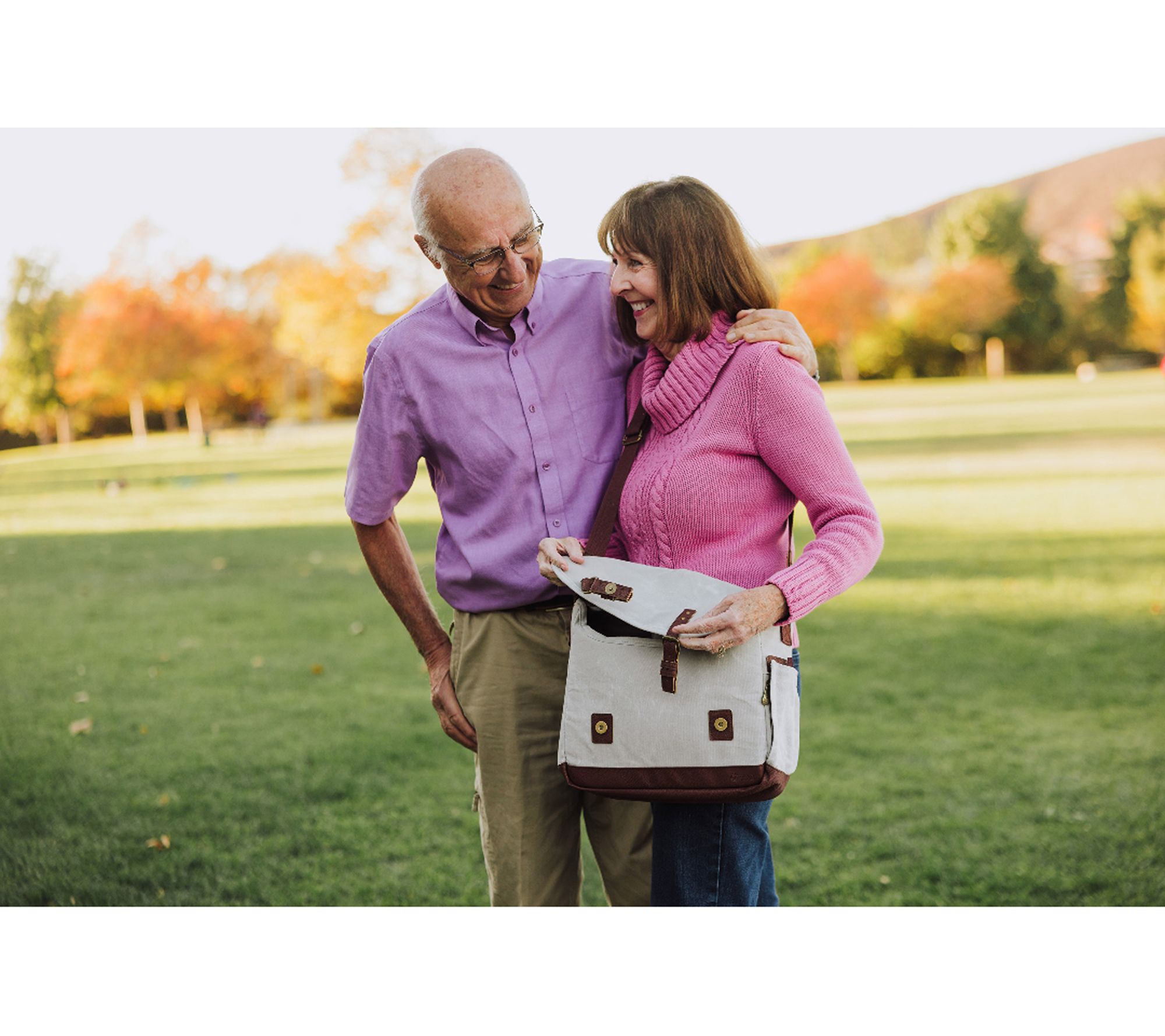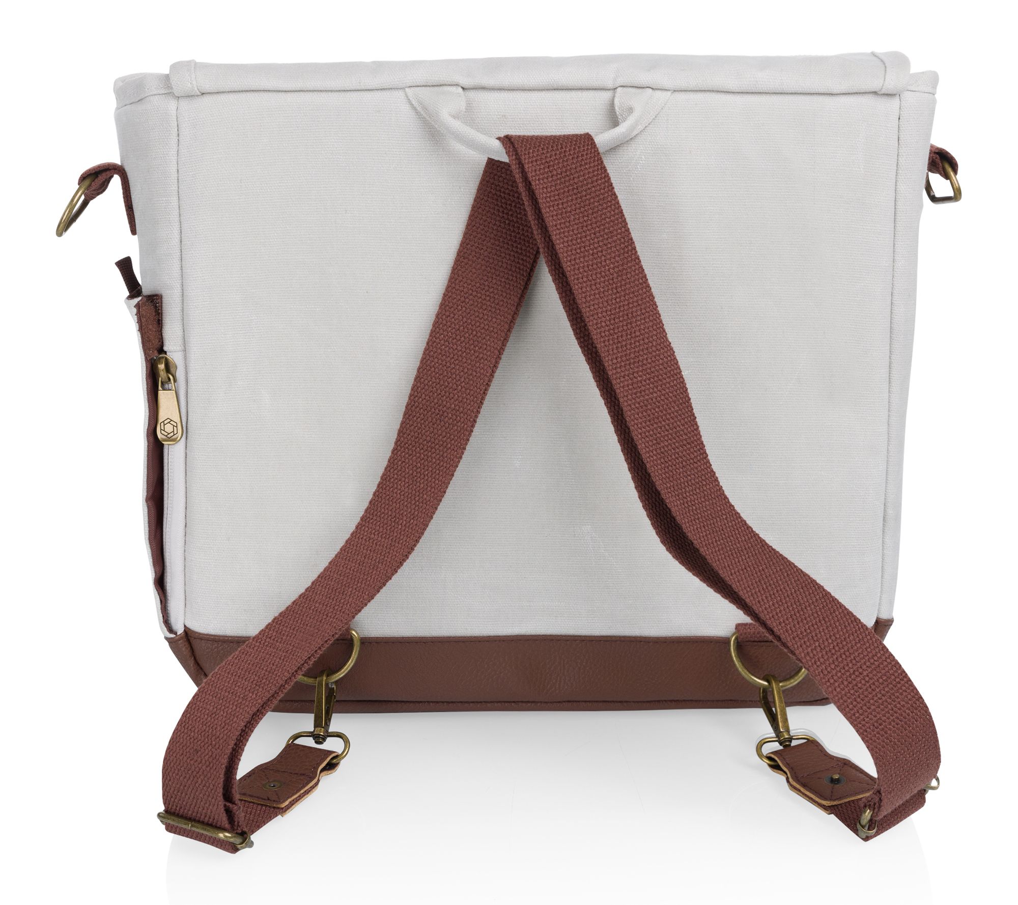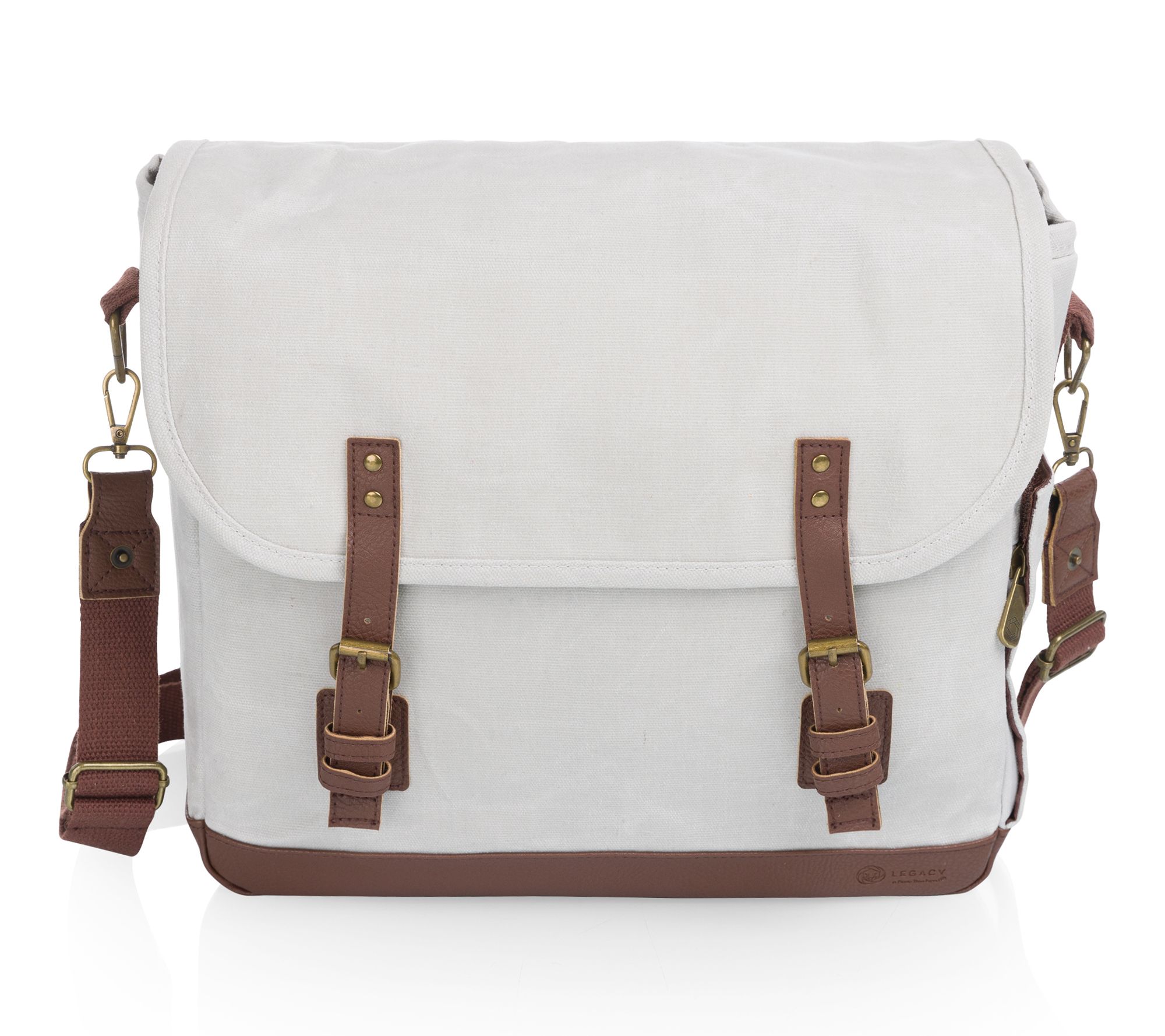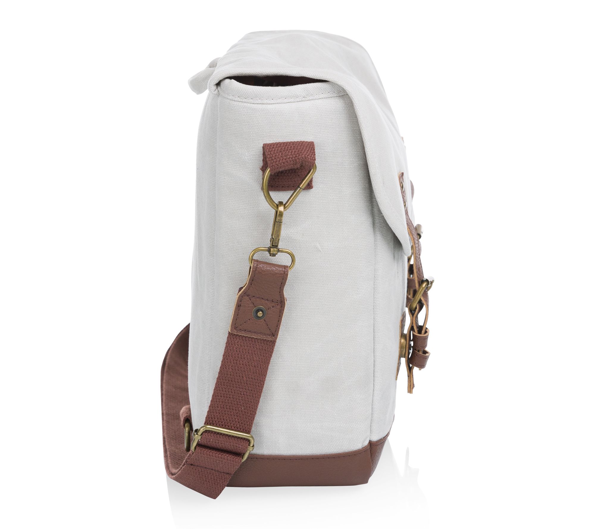 • Insulated canvas with leatherette closing straps and adjustable fabric shoulder strap