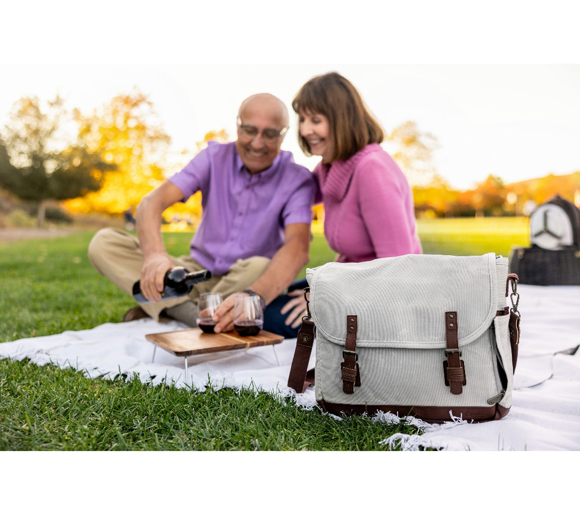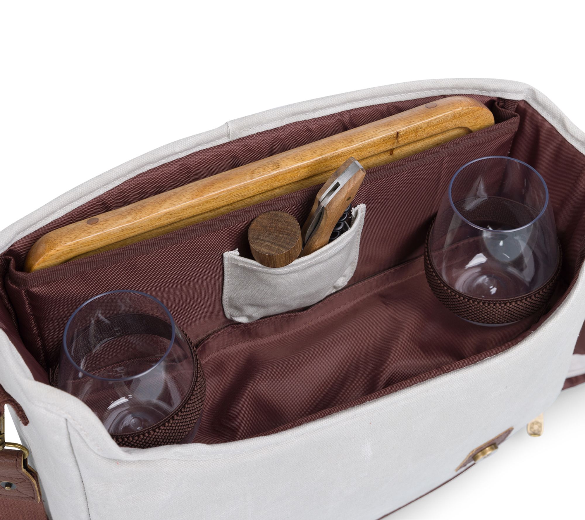 • Includes one insulated cooler (12.6" x 4.7" x 11.4"), one removable padded divider, two stemless wine glasses (2.5" diameter x 3.5" high, 8 oz), one folding table (acacia, 11" x 11" x 4"), one bottle stopper (1.75" diameter x 1.5" high), one dual leverage corkscrew with wooden handle (4.4")