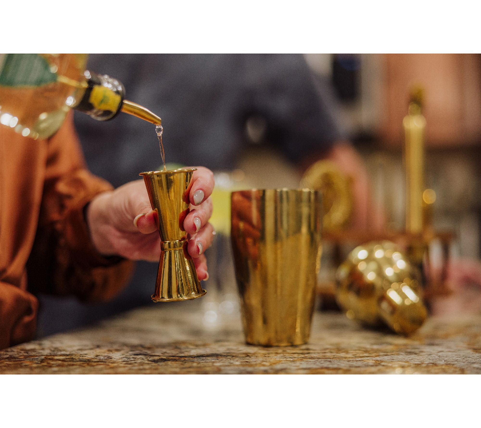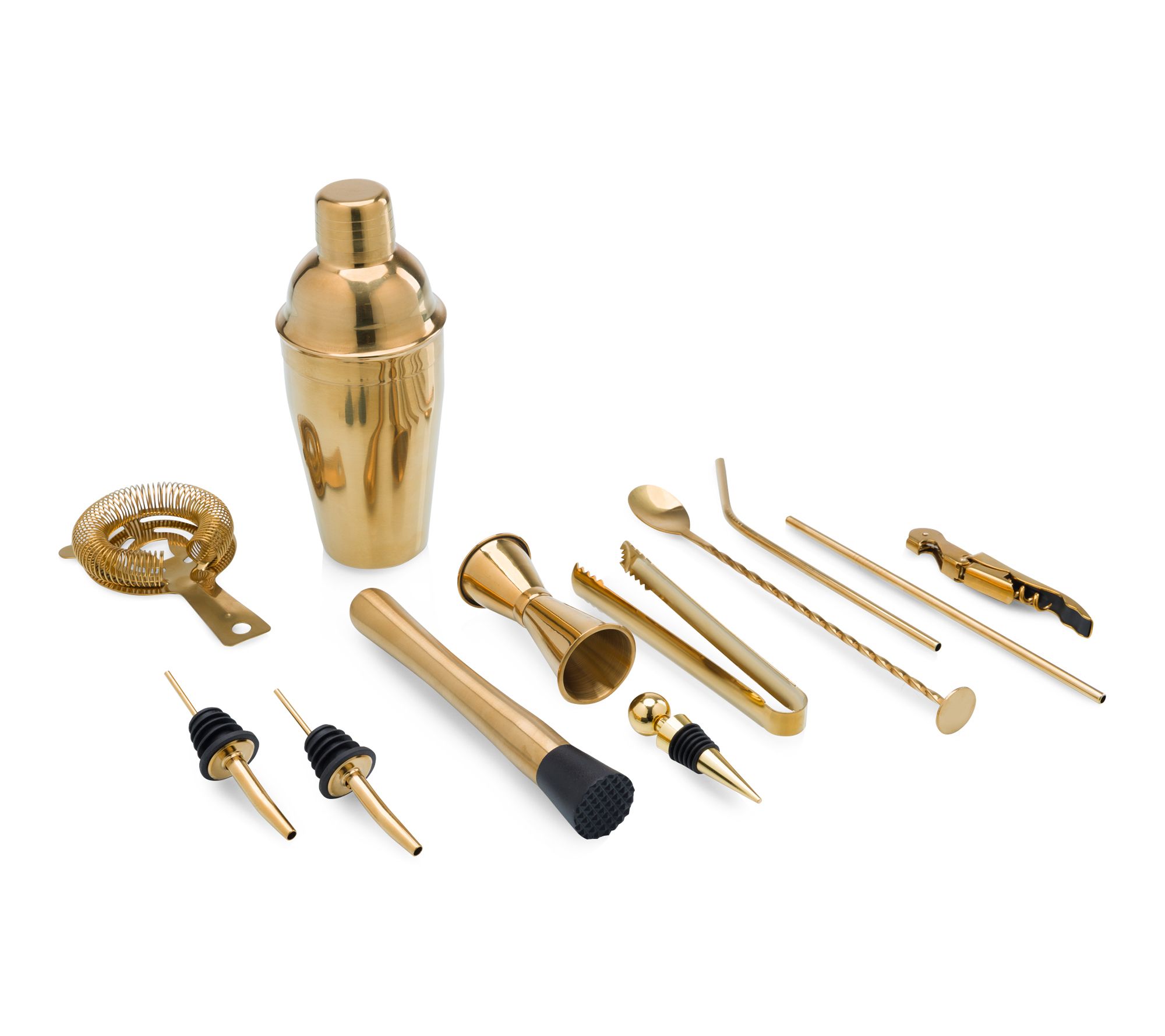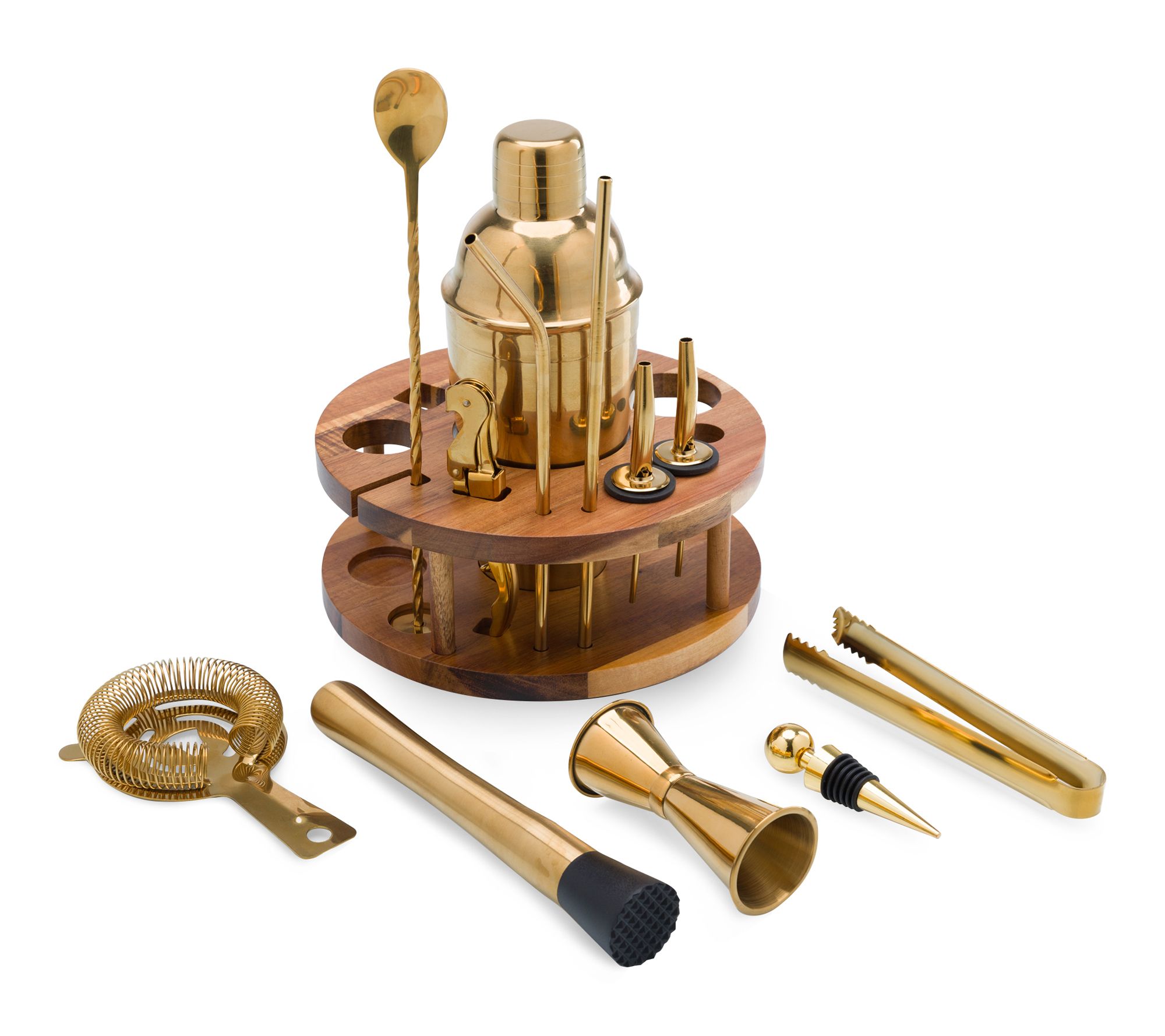 • Includes Lazy Susan bar tool holder, shaker, twisted stem cocktail spoon with hammer, corkscrew, straight straw, bent straw, two liquor pourers, stopper, double-sided jigger, hawthorne strainer, tongs, and muddler with plastic head