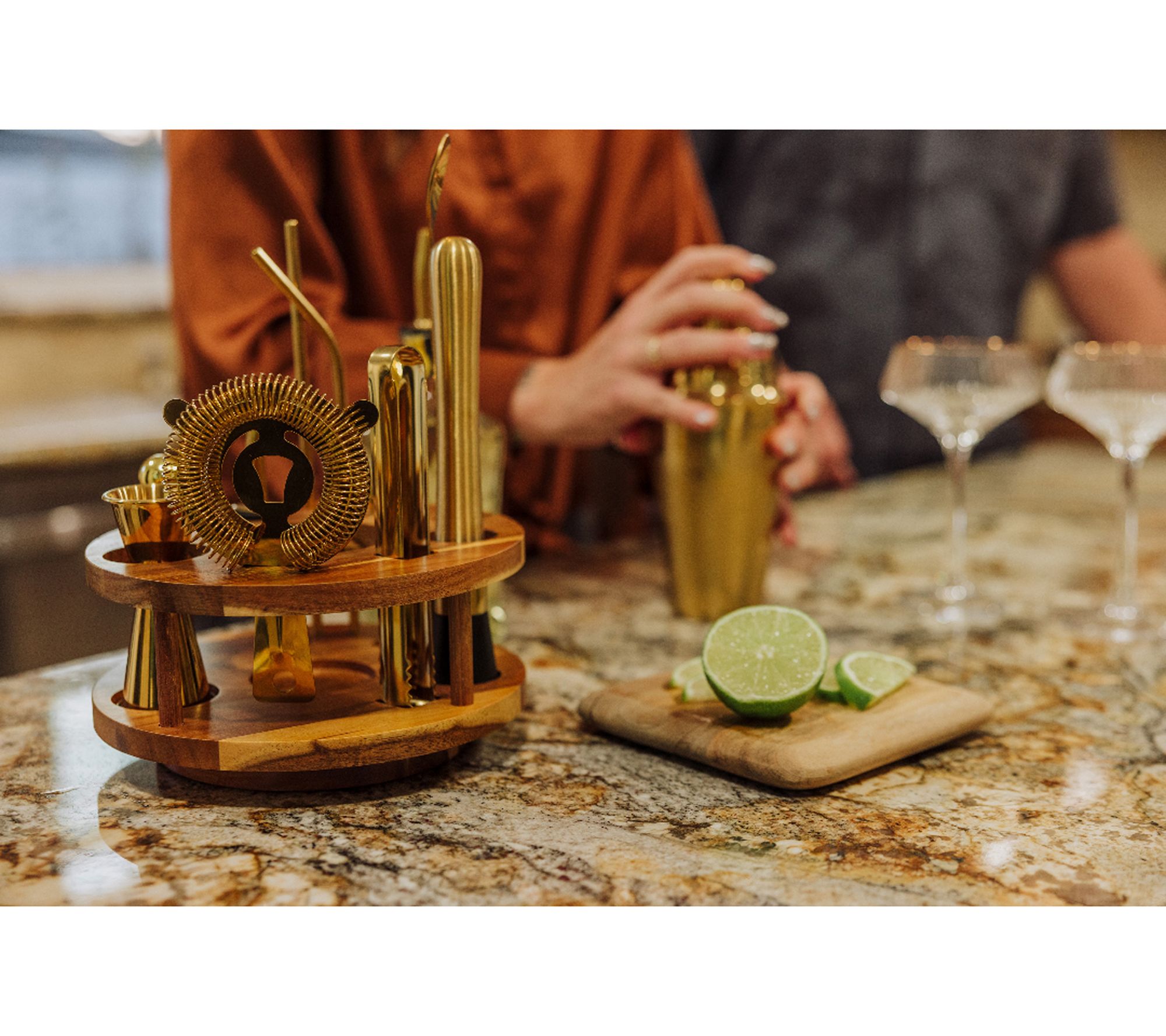 Movie night, cocktail party, or a festive gathering -- let guests help themselves to perfectly crafted drinks with the Legacy Carousel 13 Piece Lazy Susan Bar Tool Set. Every essential for mixing, muddling, and pouring is organized on a stylish acacia wood turntable to save space and add flair to your bar cart or countertop. From Legacy.