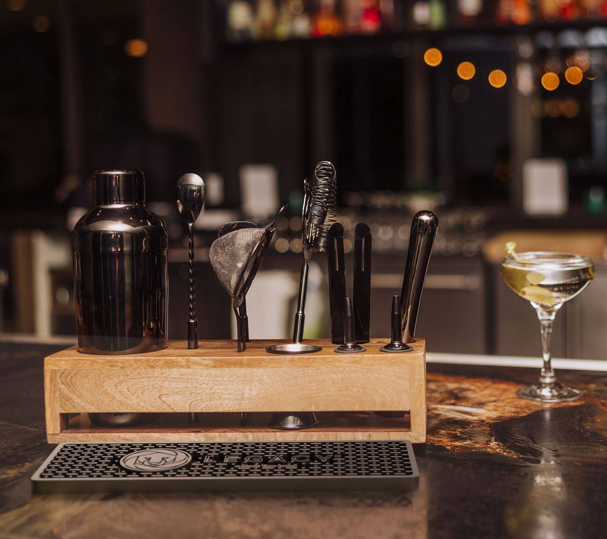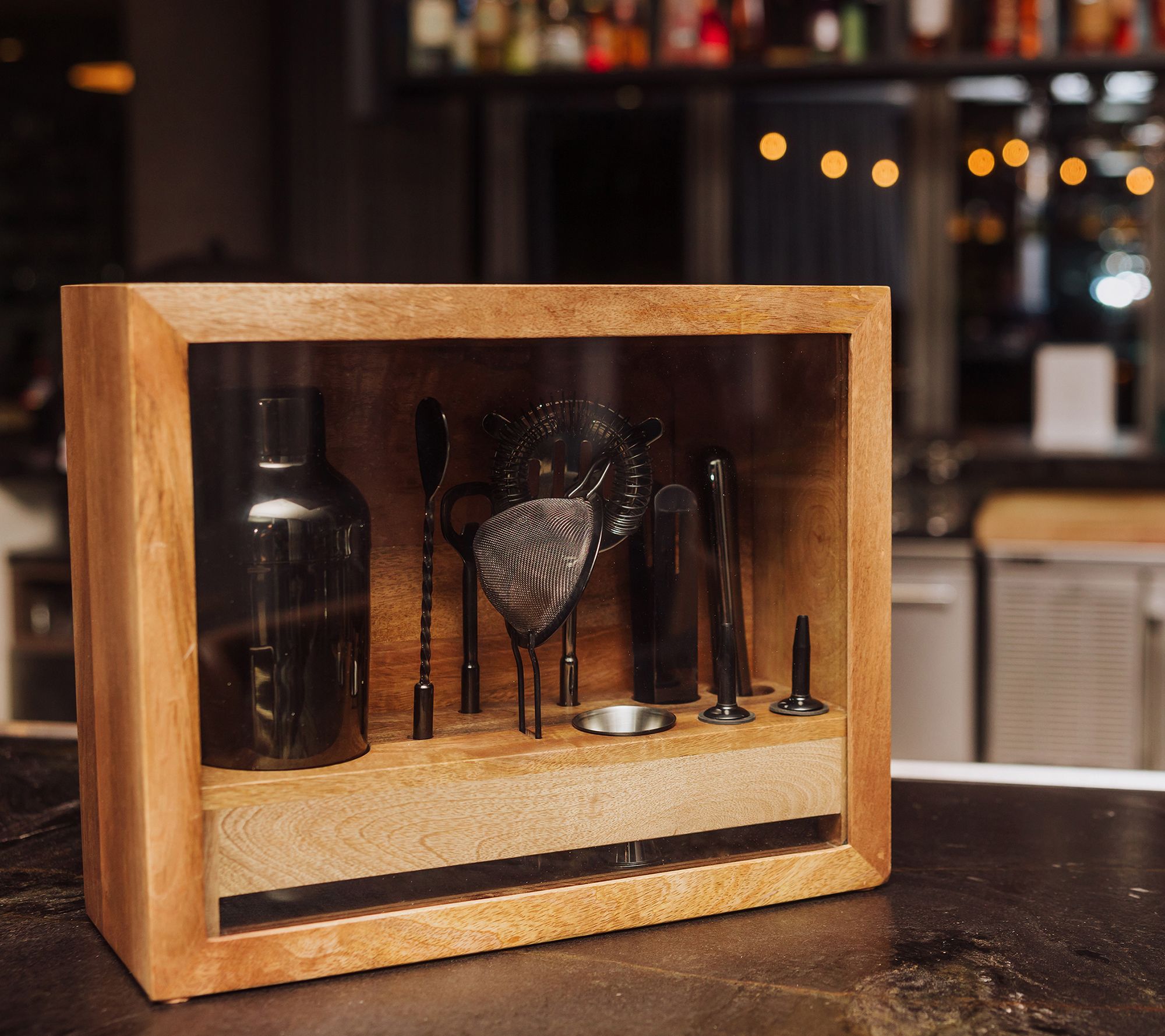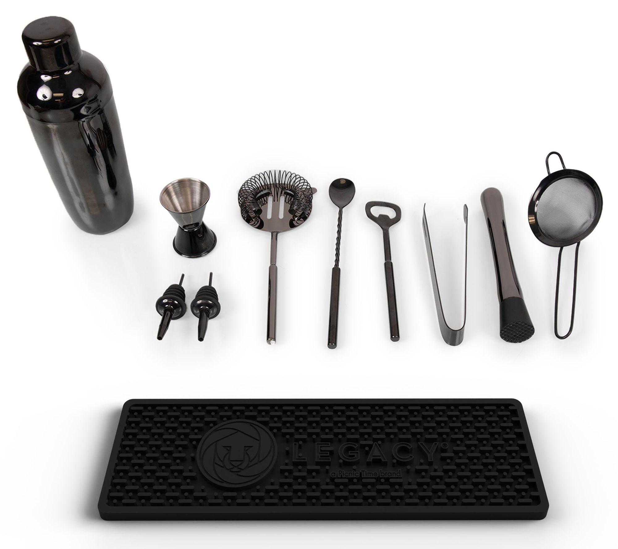 • Includes box, bar mat, shaker, strainer, skimmer, bar spoon, bottle opener, jigger, muddler, pair of tongs, and two pour spouts