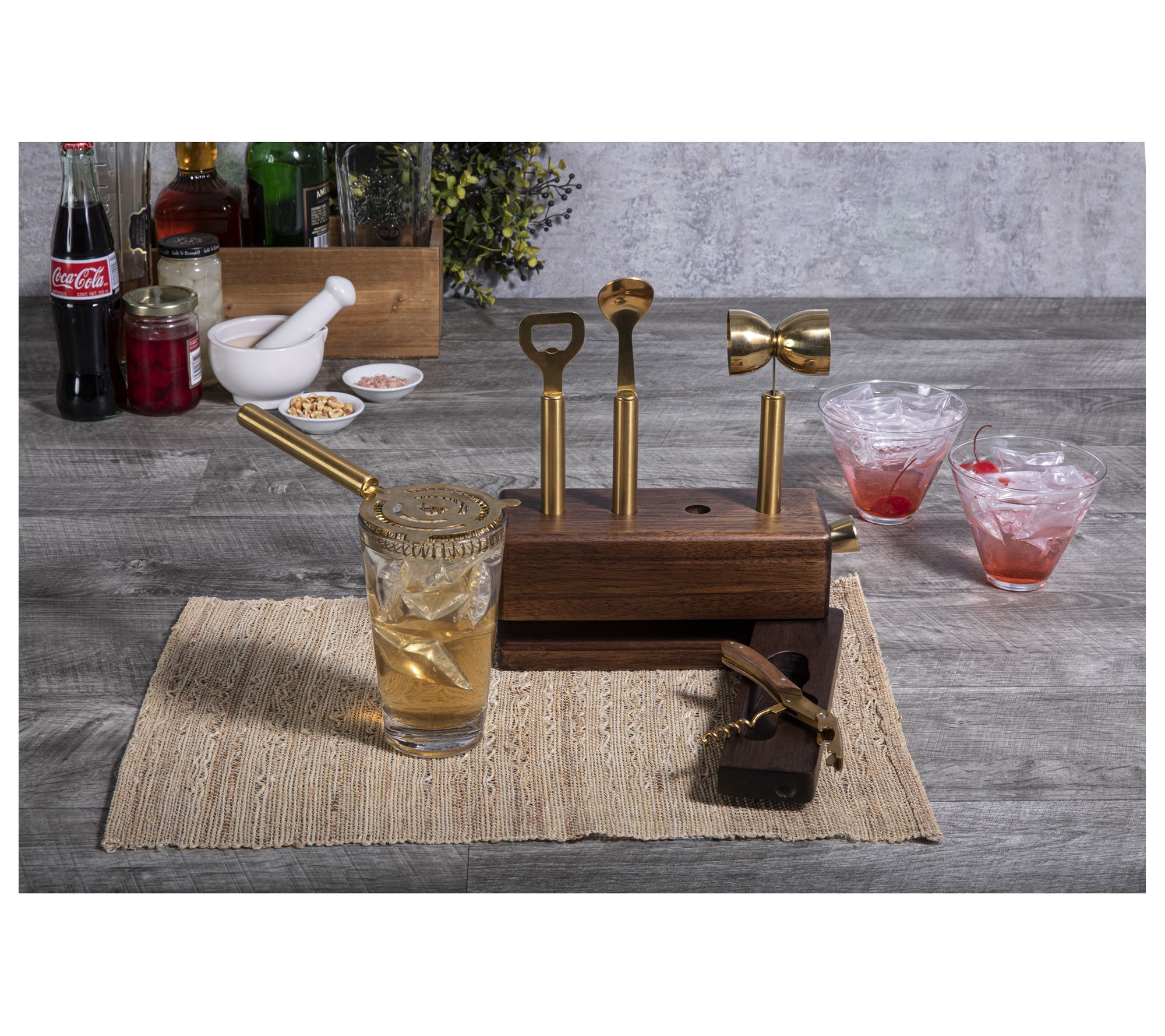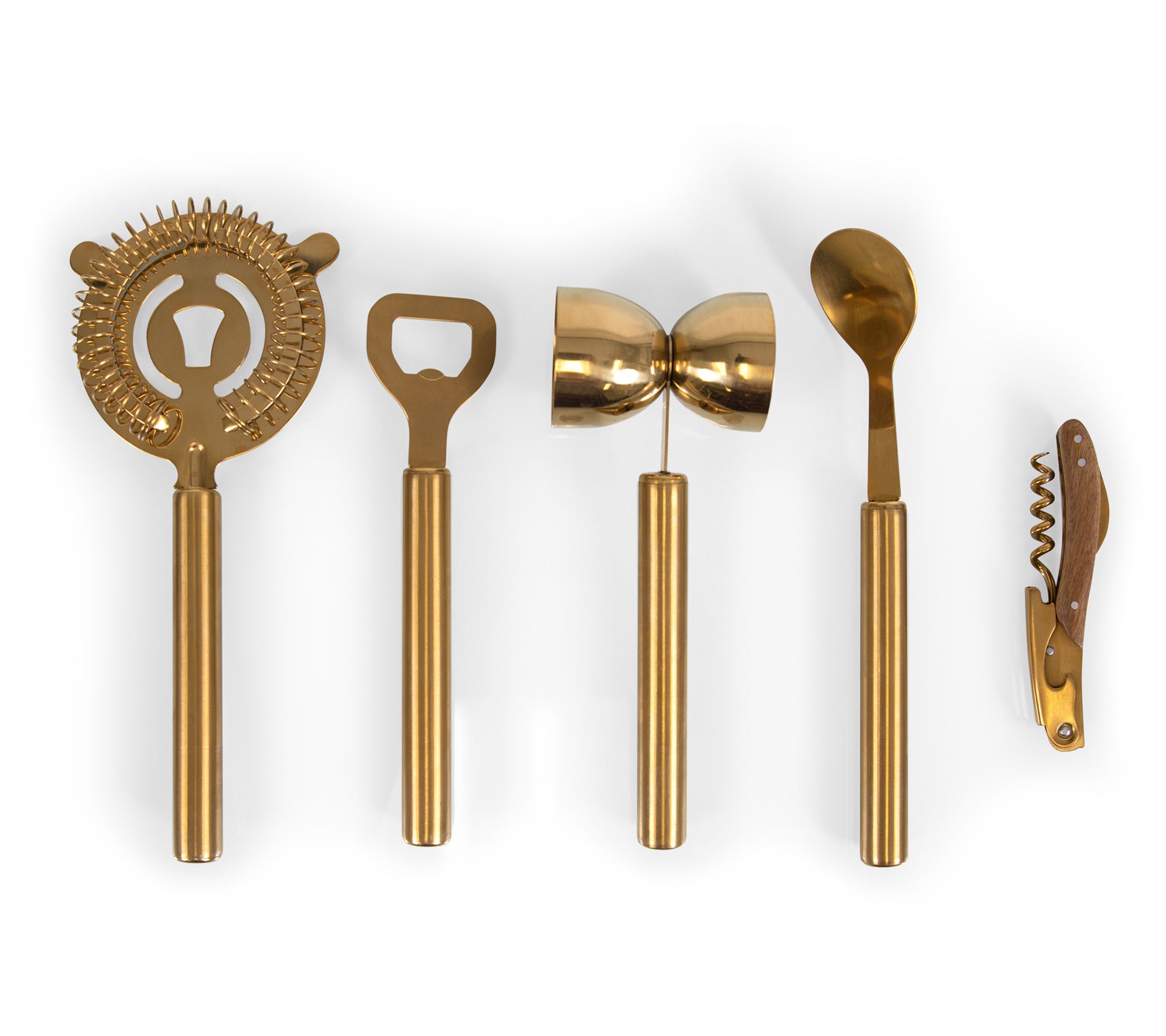 Tools of the trade. The Sidecar 5-Piece Bar Tool Set comes complete with every tool you need to upgrade your next cocktail party. Between the beautiful acacia wood box and the satin brasstone metal tools, this mixology kit perfectly marries stylish form and mixology function. From Legacy.