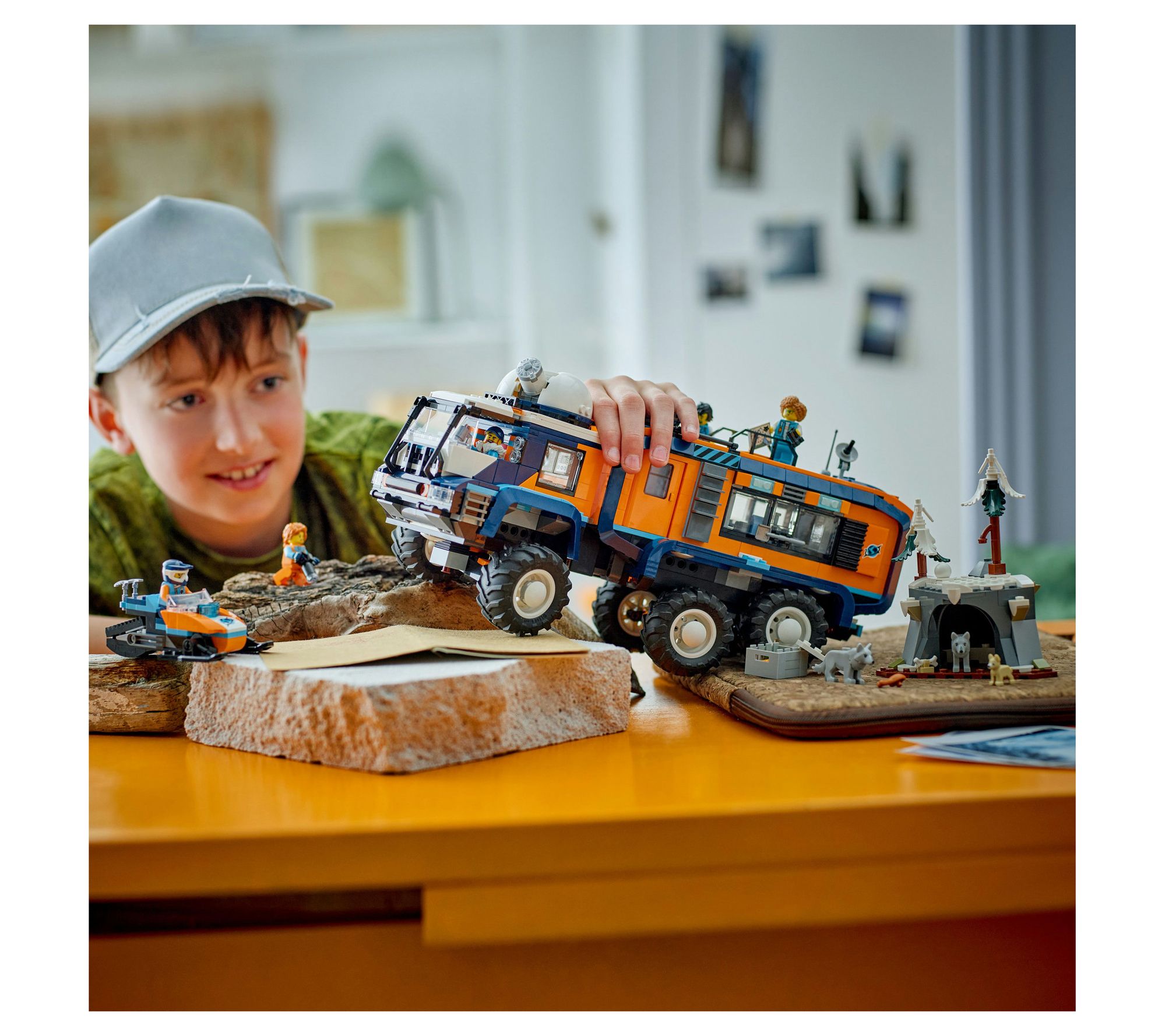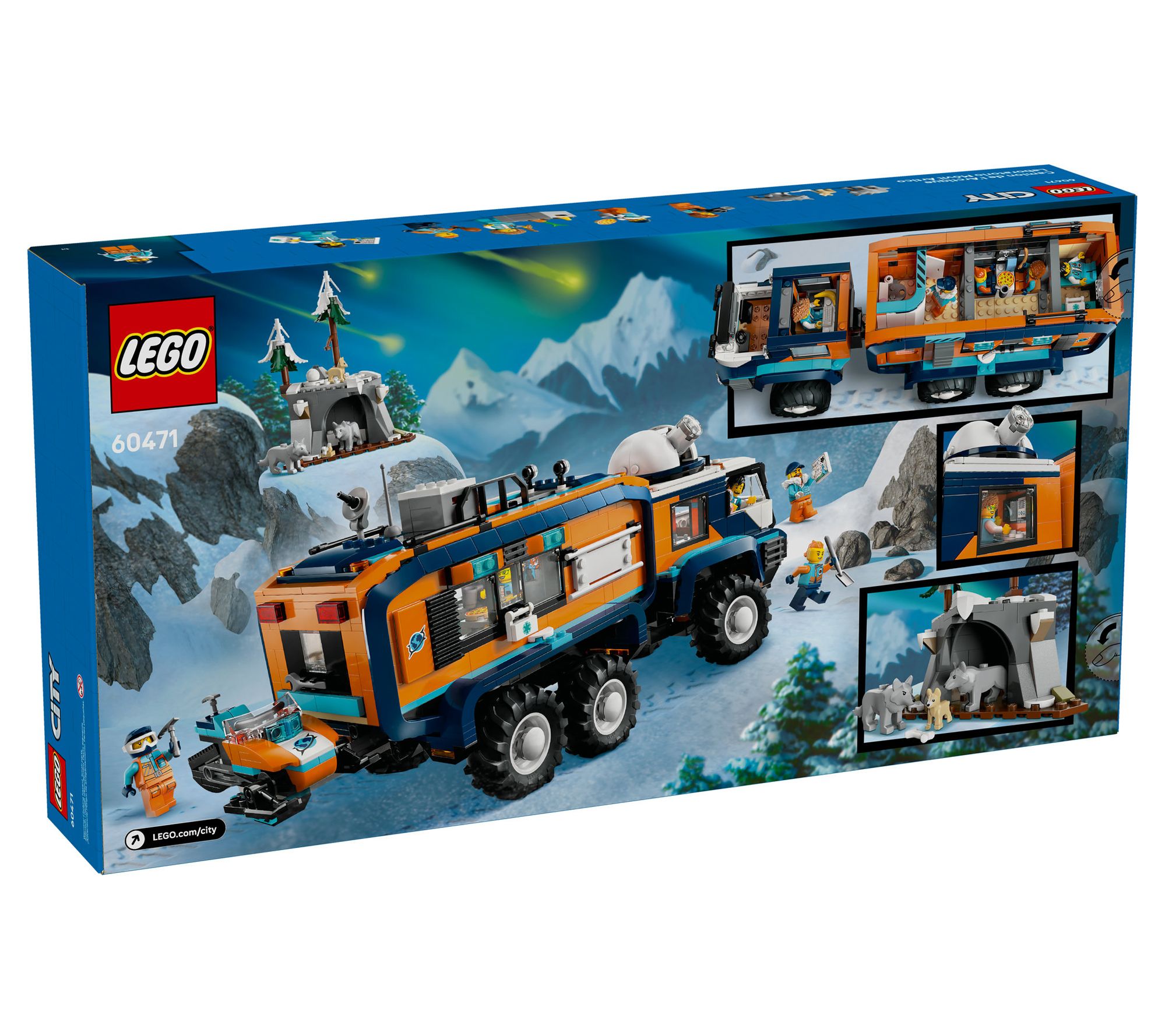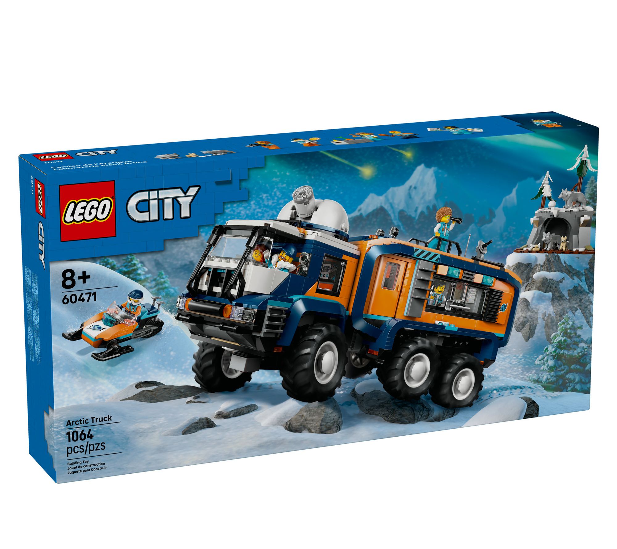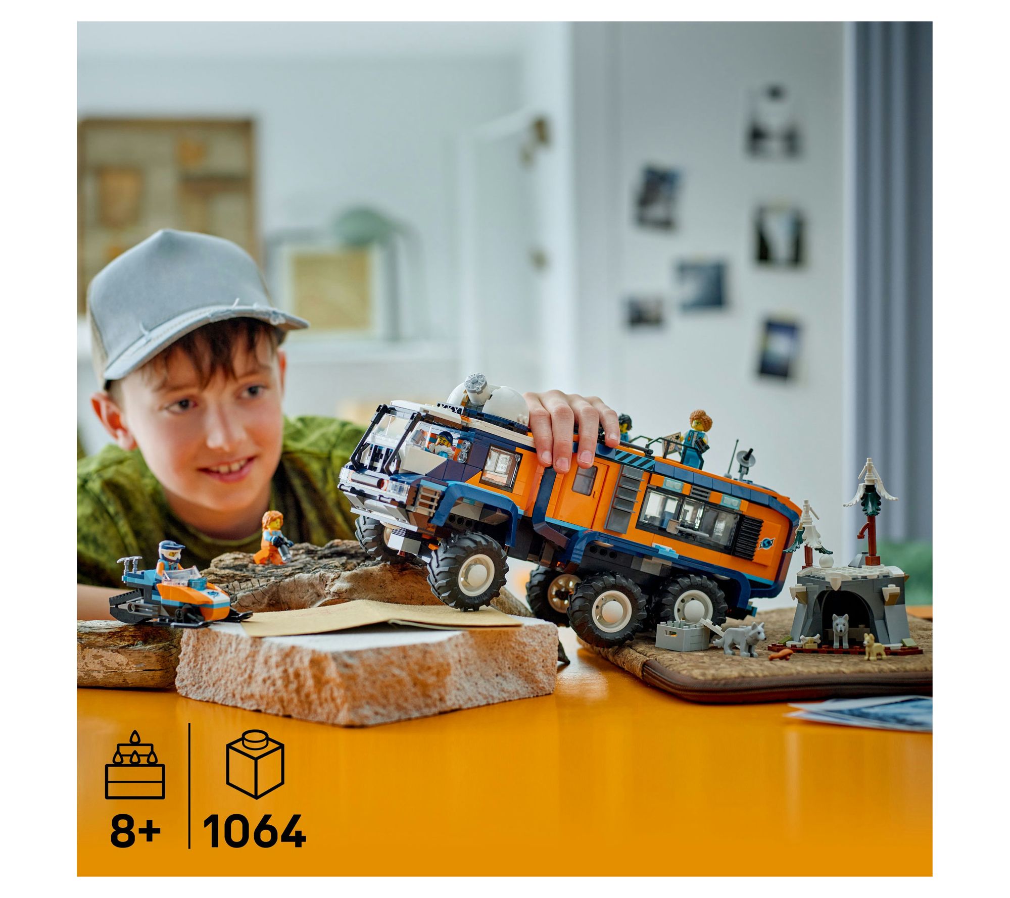 • Includes 1,064 LEGO bricks, toy exploration truck, snowmobile, Arctic cave scene, five minifigures, three Arctic wolf animal figures, and accessories