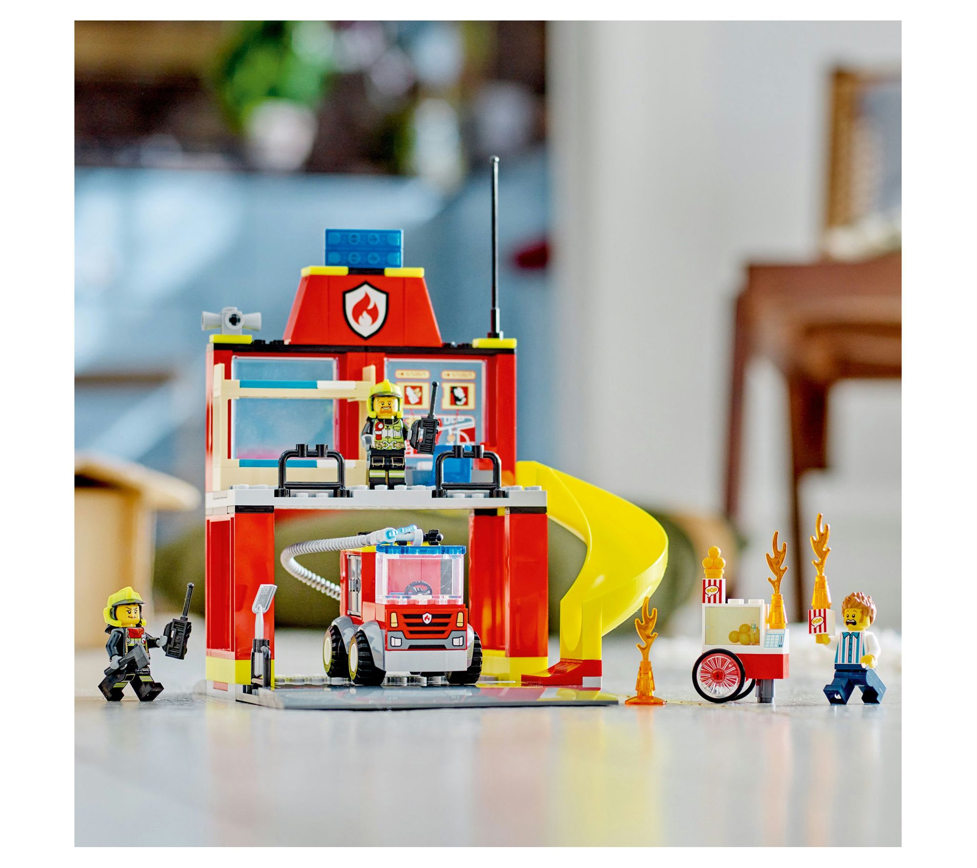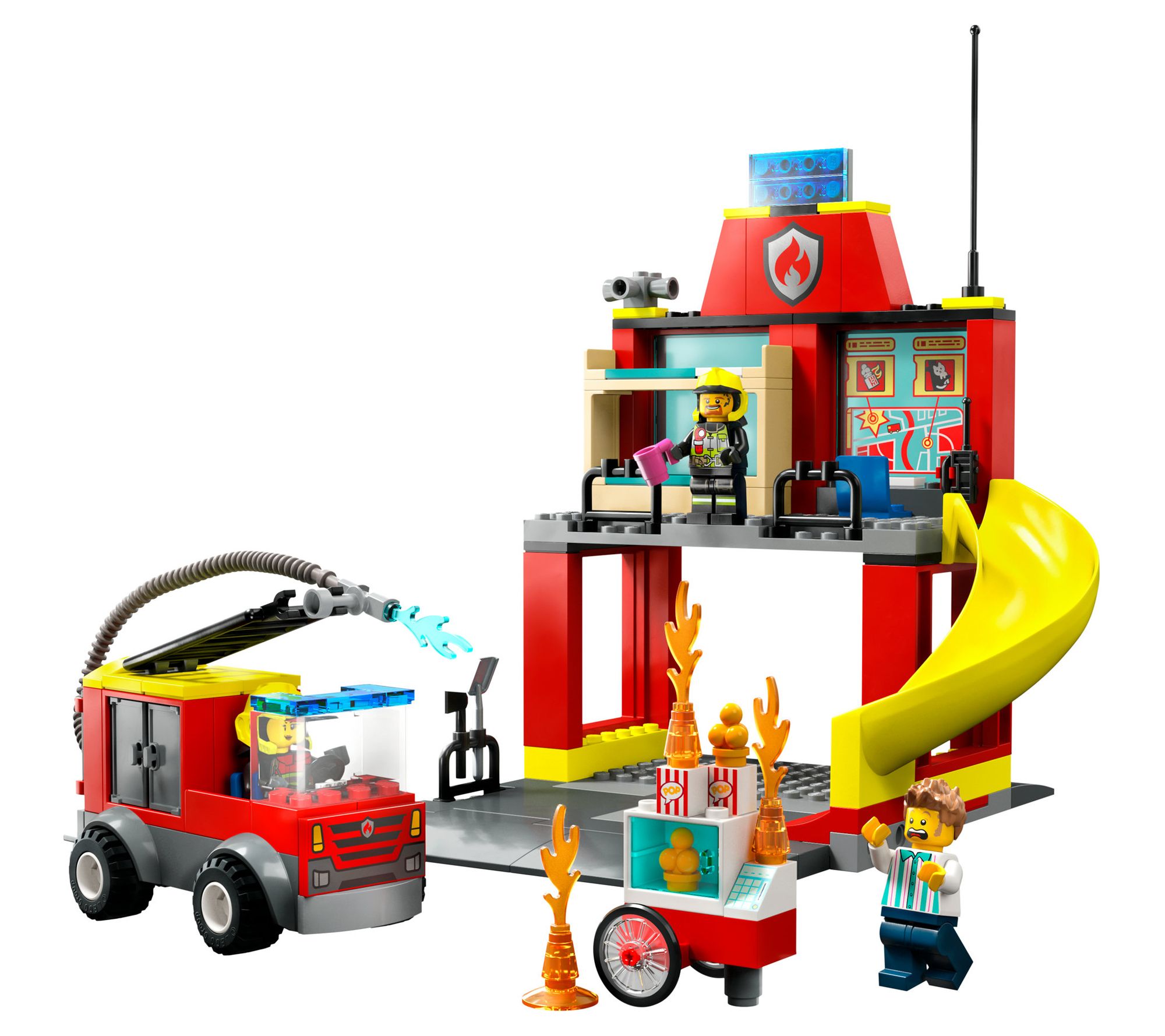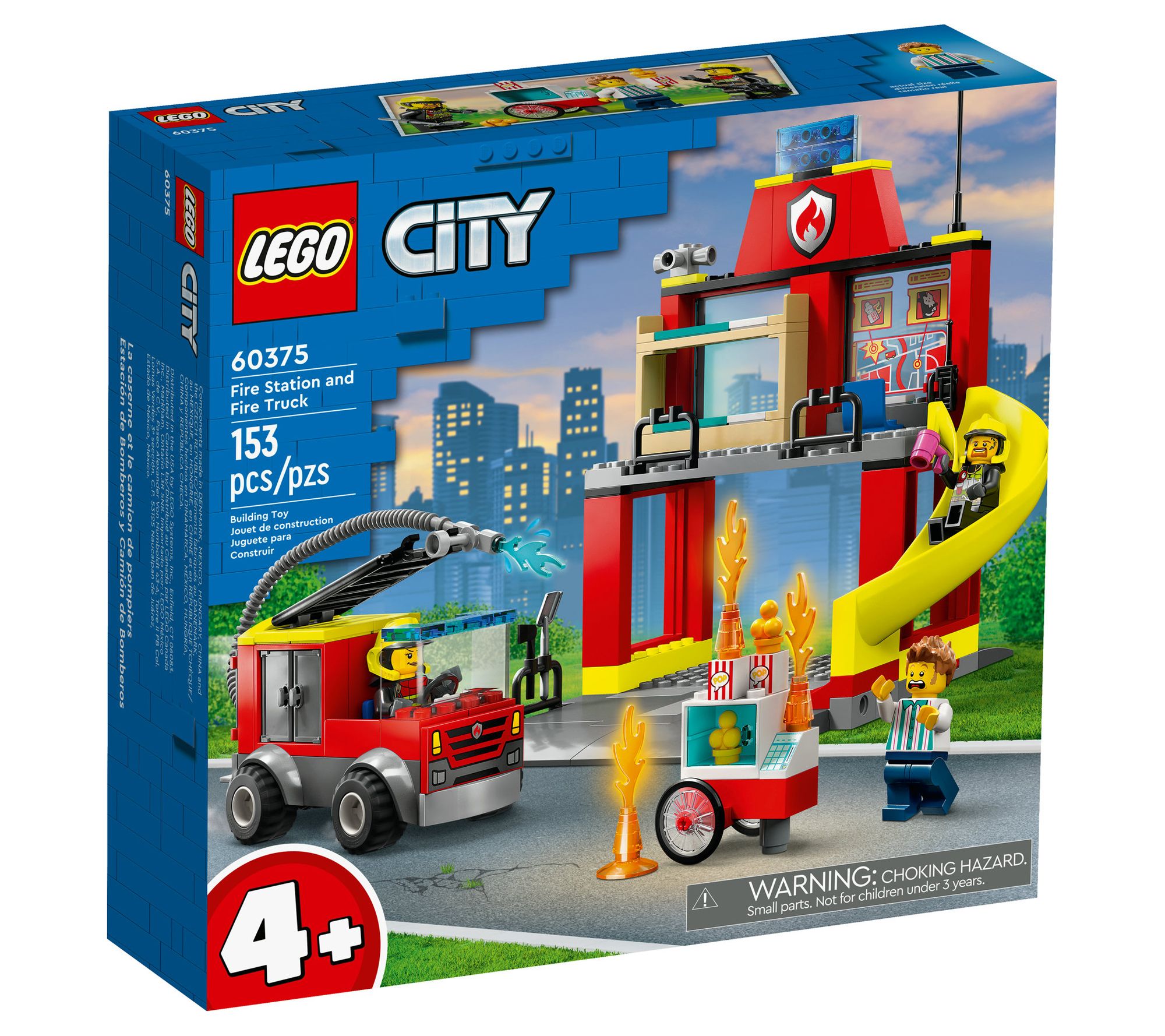 Ignite the imagination of young firefighters with the LEGO City Fire Station and Fire Truck (60375) building set. This engaging playset features a detailed fire station equipped with sleeping quarters, a garage, and a thrilling emergency slide, alongside a versatile fire truck boasting a flexible hose and roof ladder. Complete with a popcorn cart, LEGO flames, and both vendor and firefighter minifigures, it promises endless hours of action-packed fun. From LEGO.
