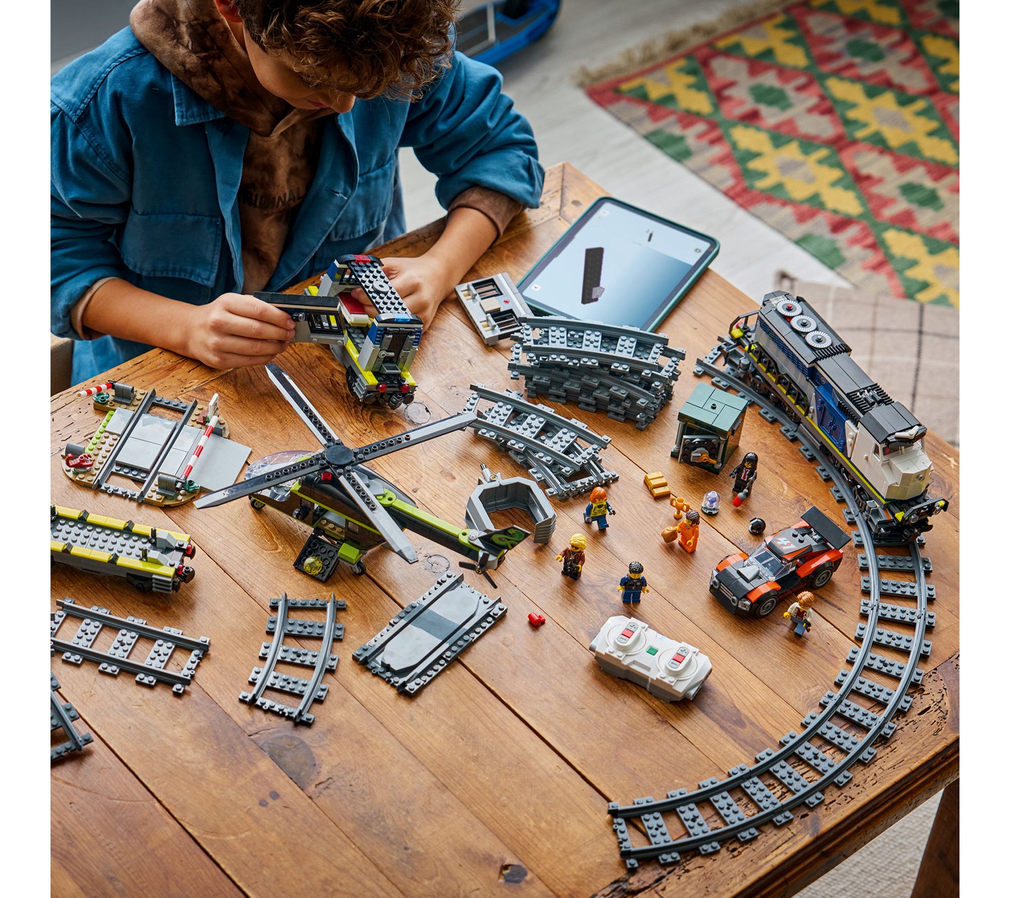 • Motorized toy train with helicopter, rally car, train track, and 6 minifigures