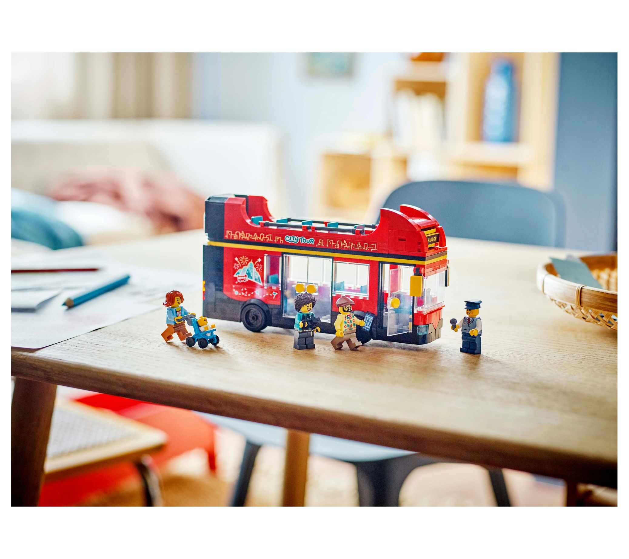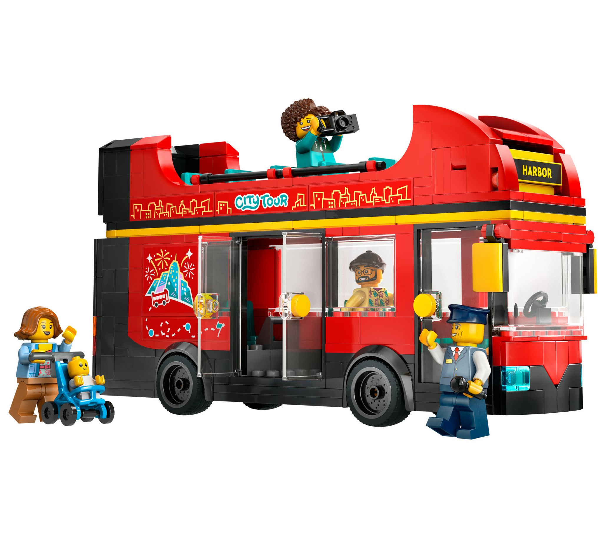 Hop on for a city tour with the LEGO City red double-decker sightseeing bus. Rotate the sign to display your destination and pick up waiting passengers along the way. Help secure the baby stroller in the spacious baggage area and seat passengers on the lower deck or the open-air sightseeing deck for a bird's-eye view. From LEGO.
