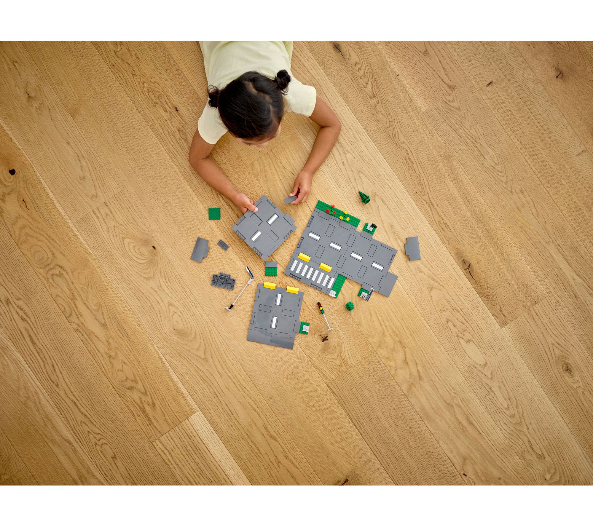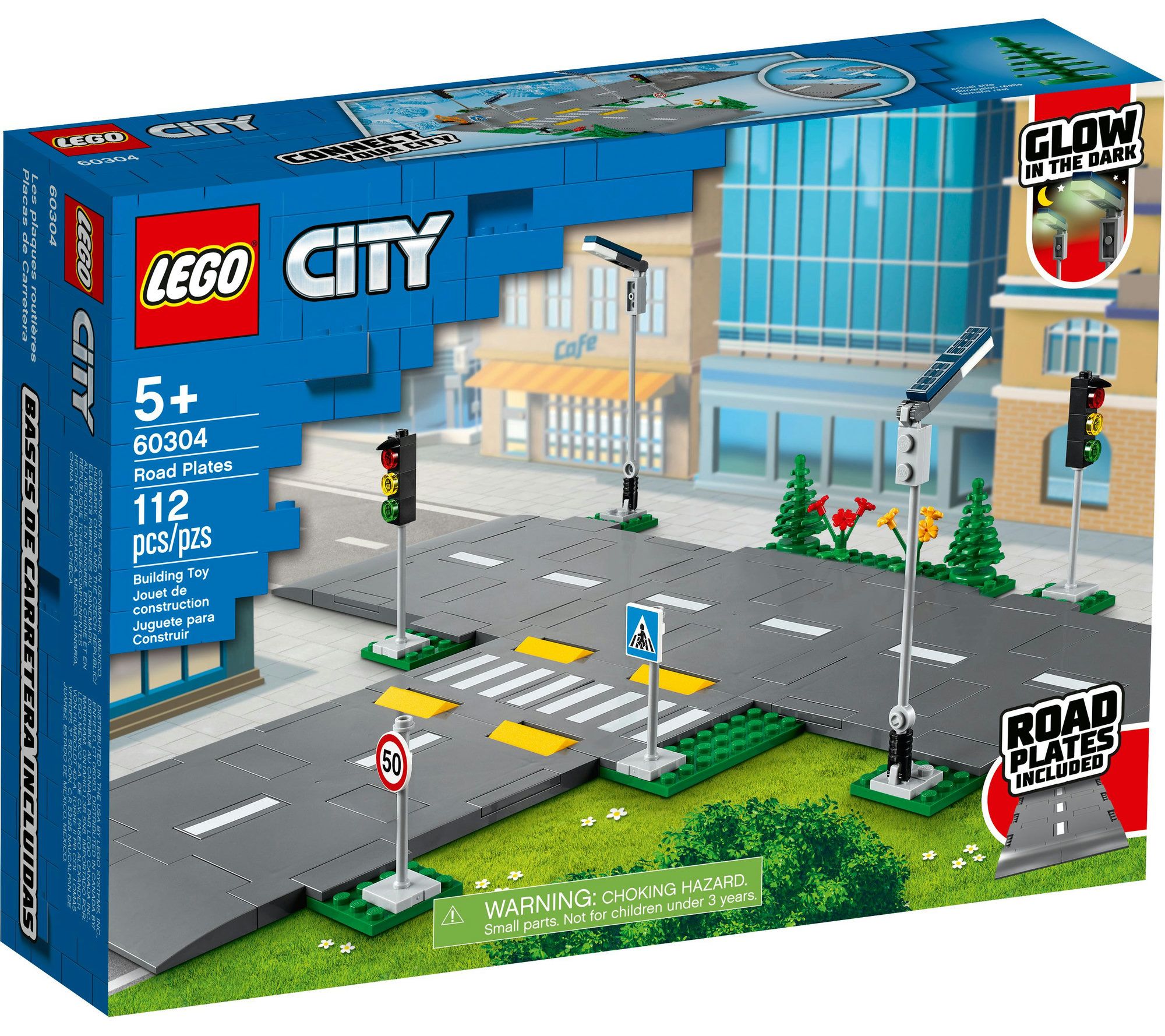 • Includes 112 LEGO pieces including five road plates, glow-in-the-dark streetlights, traffic lights, road signs, traffic lane markings, speed bumps, a crosswalk, trees, and greenery