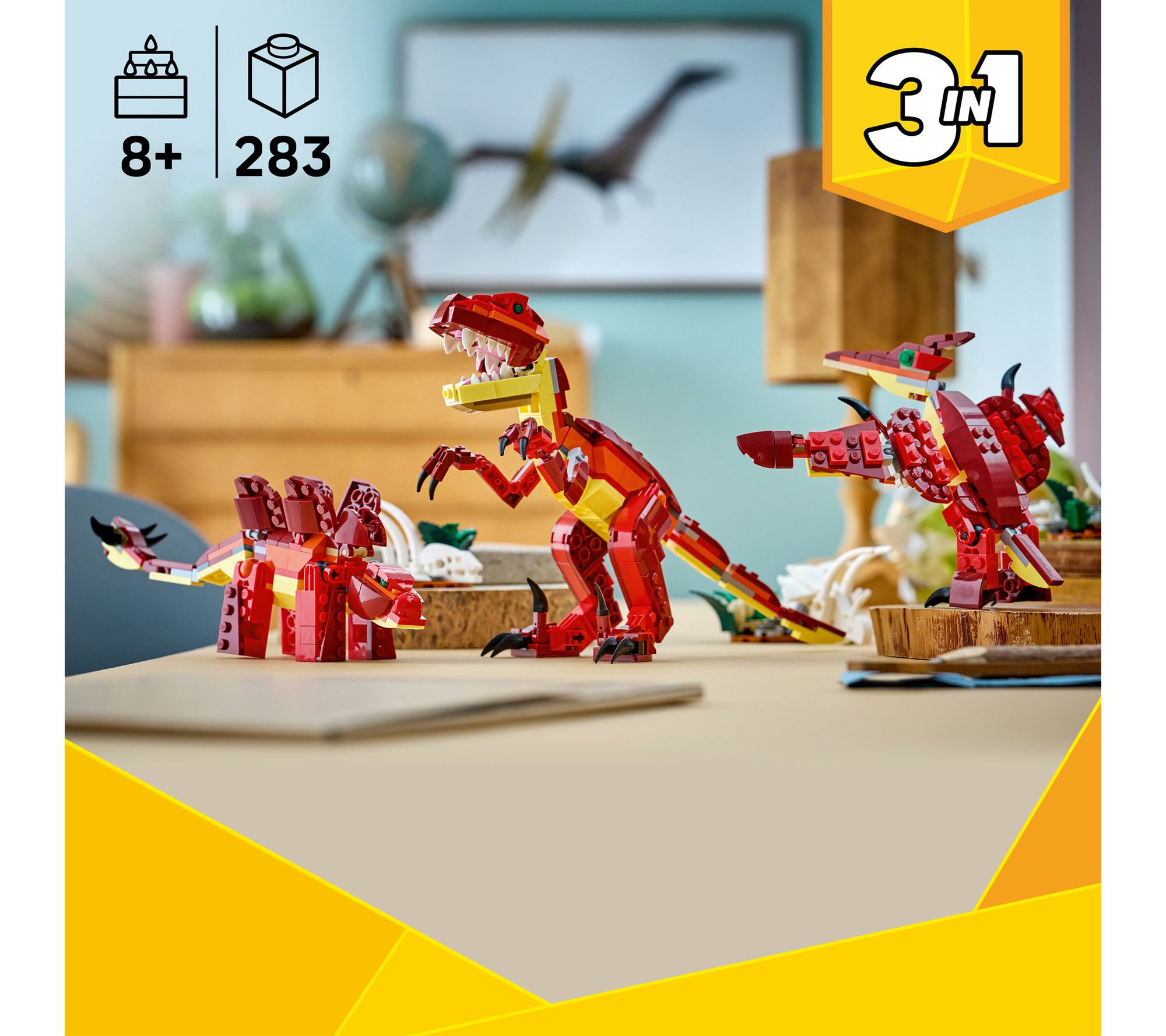 • 3 in 1 set builds Velociraptor, Stegosaurus, or Pterosaur, one at a time