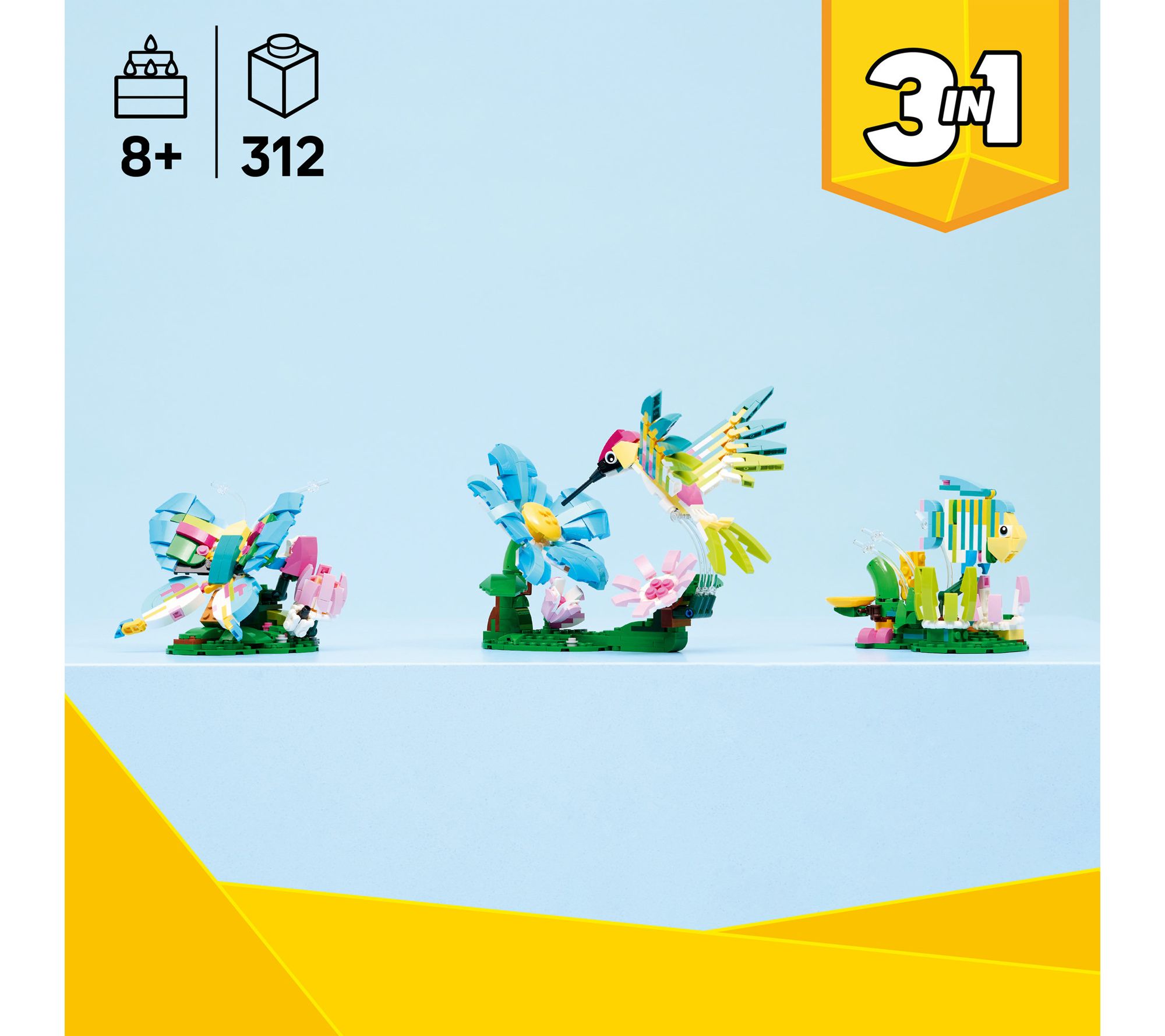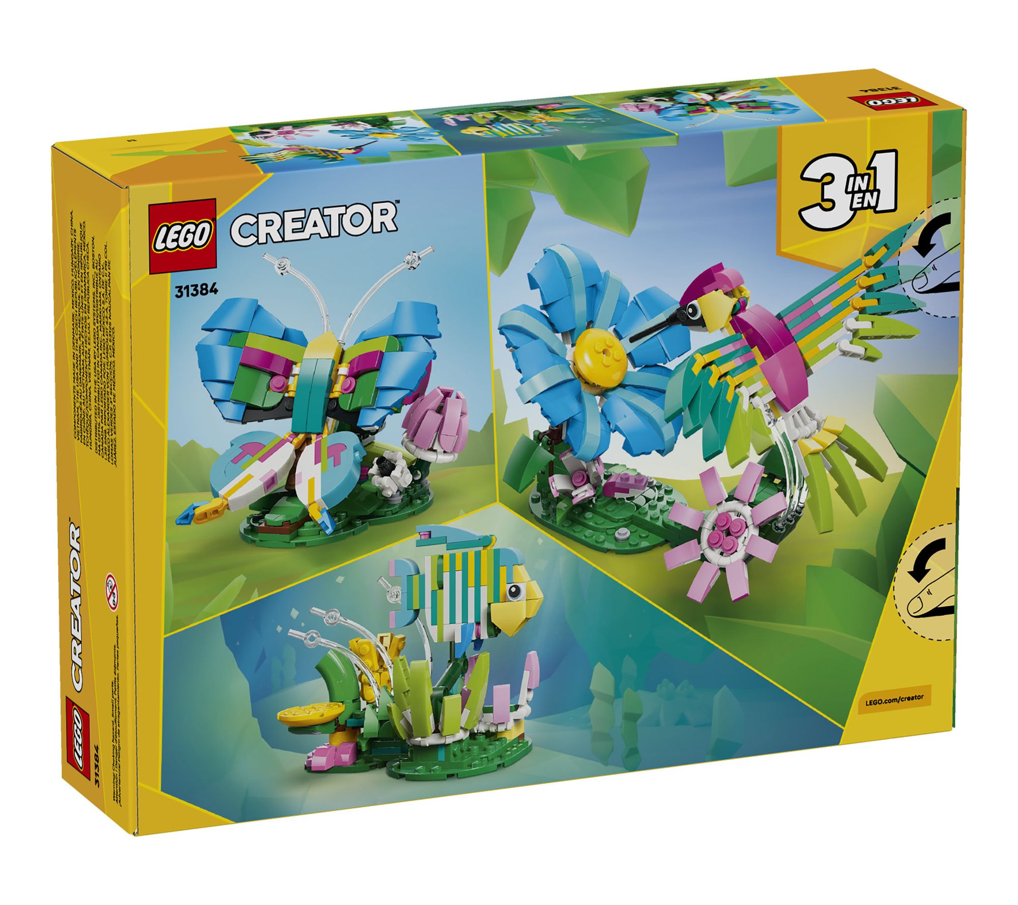 Enjoy hours of imaginative fun building vibrant animal figures with this LEGO Creator 3-in-1 set of blocks. Craft a detailed hummingbird hovering near blossoms, then rebuild to display a beautiful butterfly or a lively tropical fish surrounded by colorful underwater plants -- each project inspires creativity and endless storytelling. From LEGO.