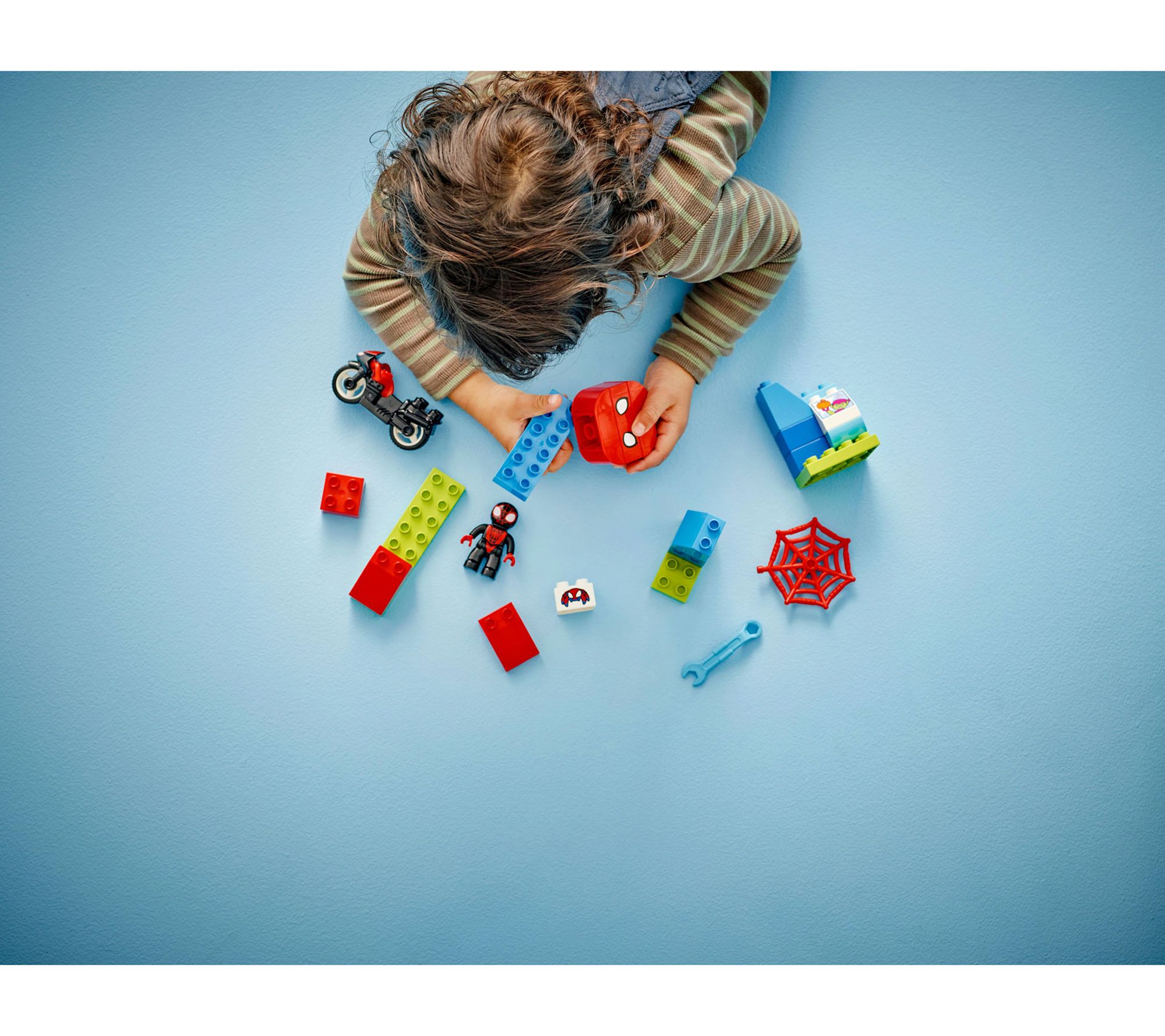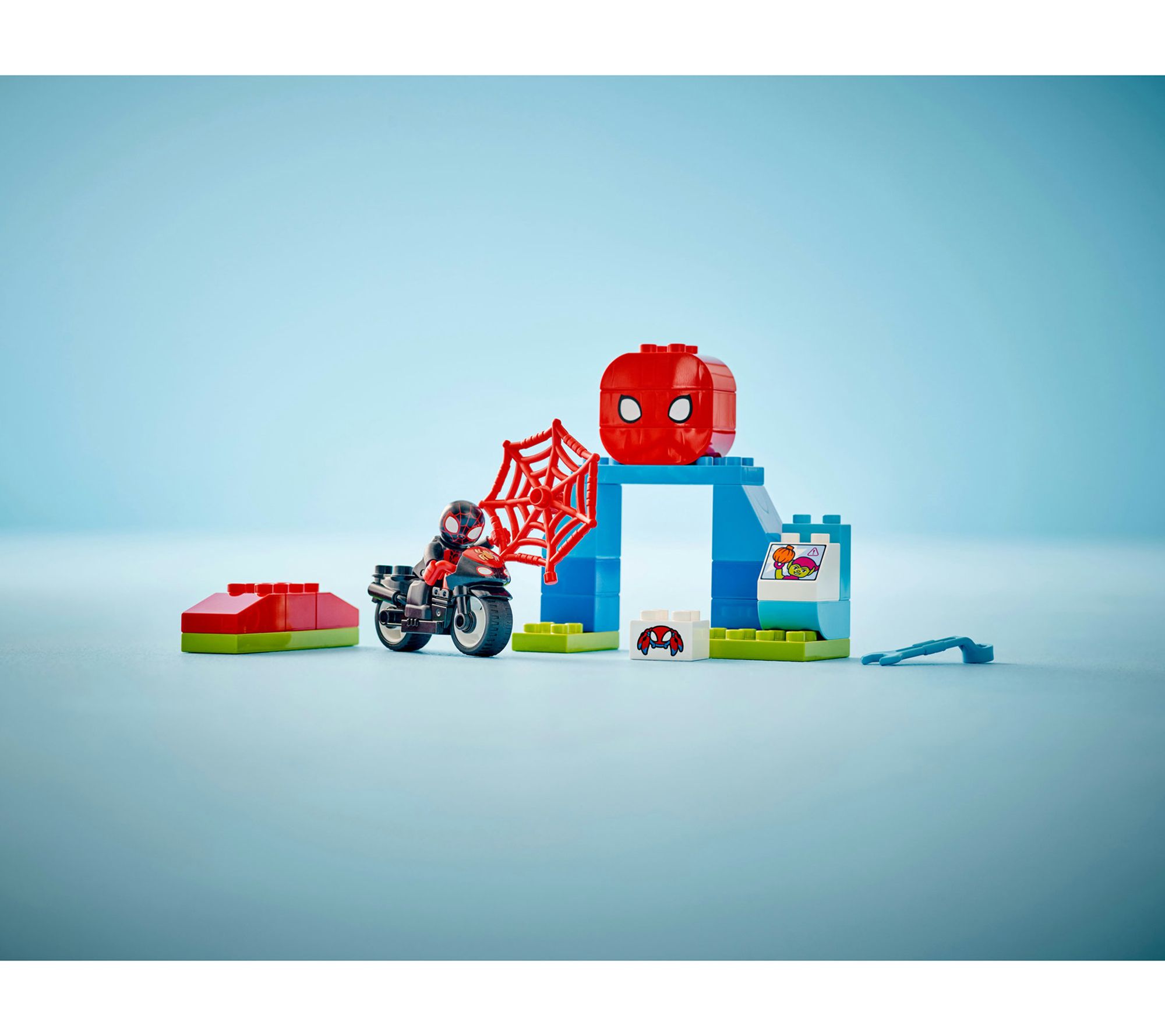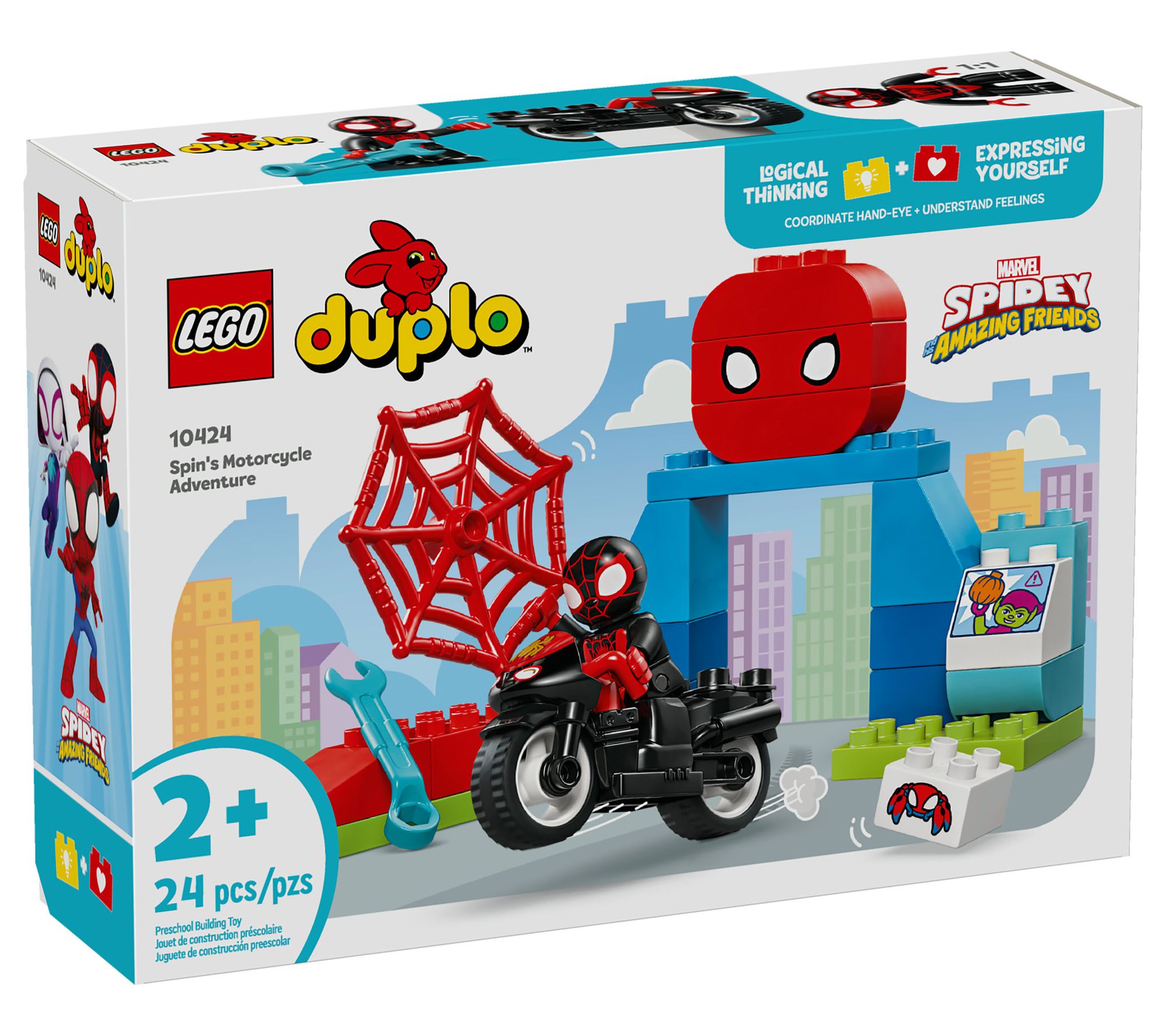 Let your toddler's imagination soar with the LEGO DUPLO Marvel Spins Motorcycle Adventure Set. Perfect for fans of Disney+ TV show Spidey and His Amazing Friends, this set lets little ones join Miles Spin Morales on thrilling adventures. Kids can launch Spin's motorbike off the ramp and catch flying bricks in a web, fostering creativity and fine motor skills. From LEGO.