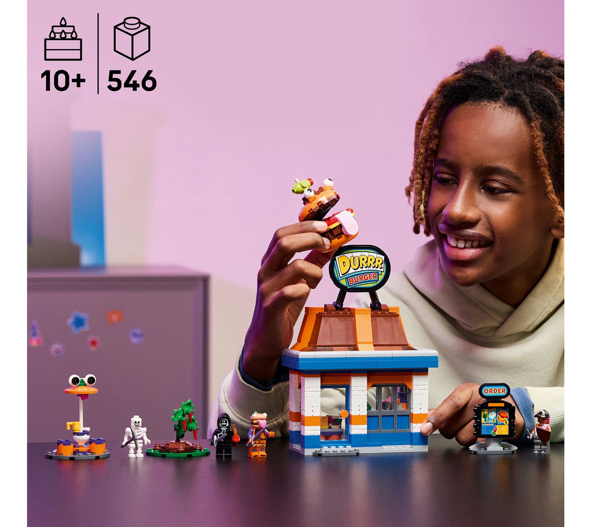 Bring the excitement of Fortnite into the real world as you assemble the iconic Durrr Burger Restaurant with these LEGO blocks. Enjoy hours of creative building and imaginative play, from serving up tasty treats at the drive-through to exploring all the quirky details and minifigures included. From LEGO.
