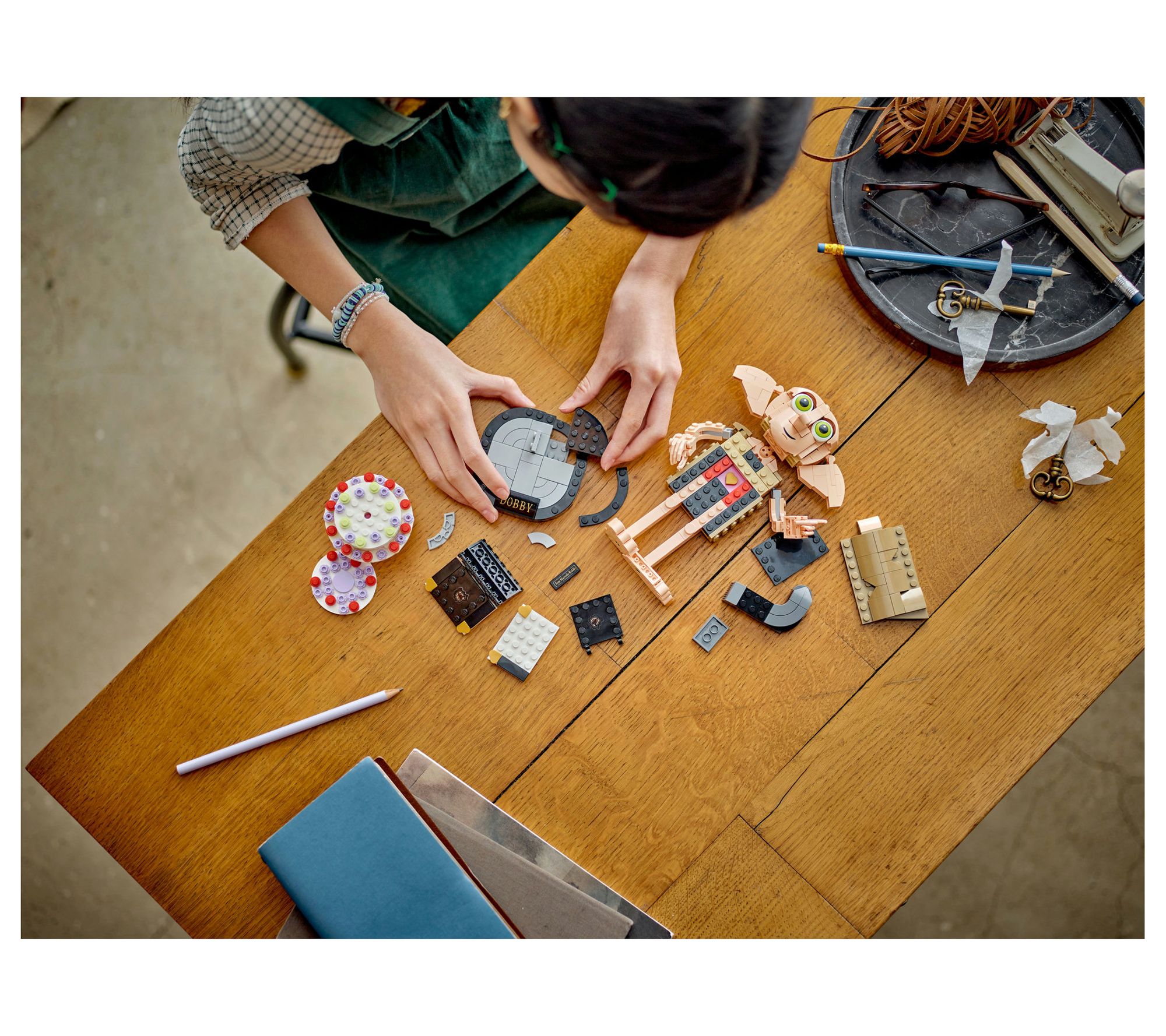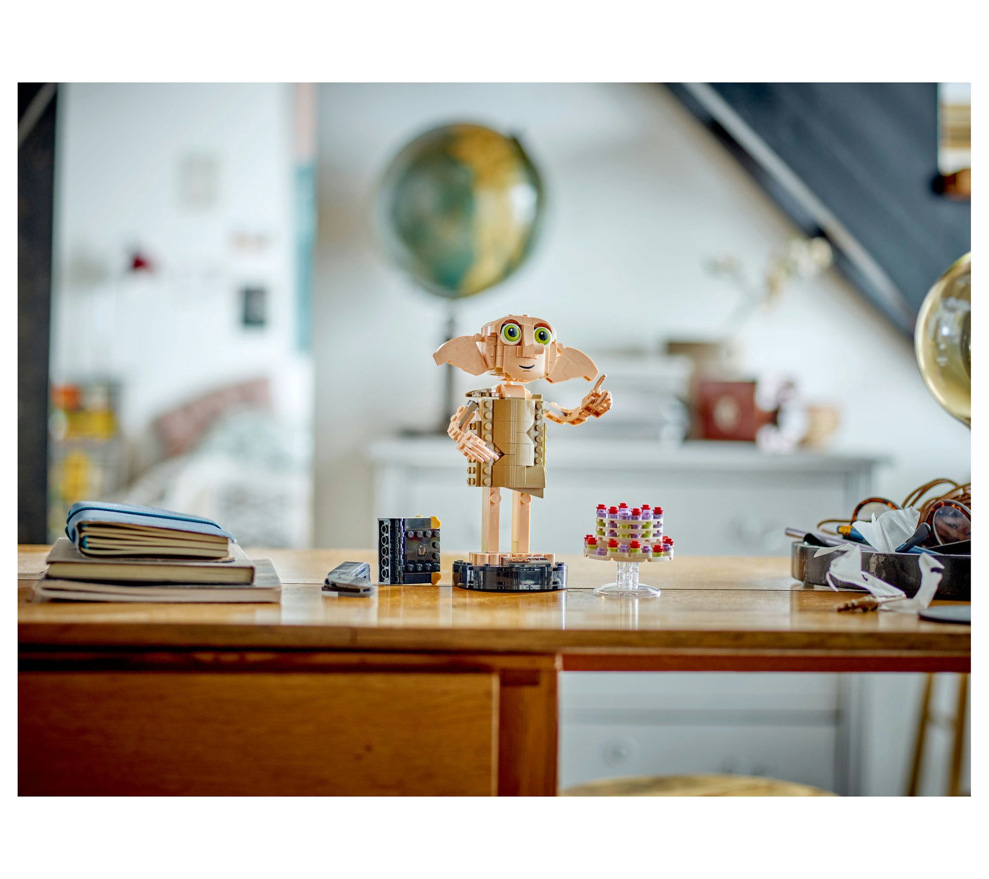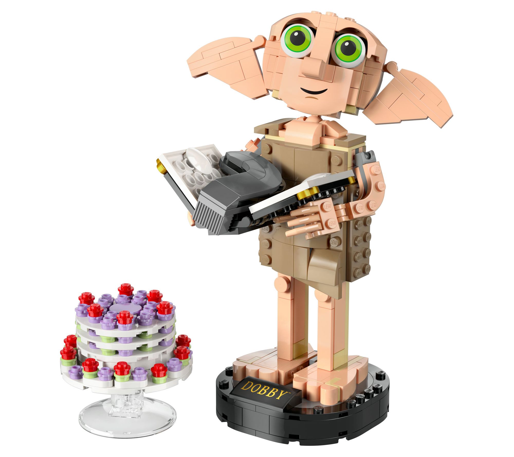 Delight Harry Potter enthusiasts with the LEGO Harry Potter Dobby the House Elf build set, a first-of-its-kind LEGO brick model that brings the beloved character to life. This set features a posable Dobby figure with movable head, arms, and fingers, allowing him to hold the iconic sock and Tom Riddle's diary, as well as Aunt Petunia's 'floating' cake. It's a magical collectible that stands over 7.5 inches tall on a display stand with a nameplate, making it a captivating display piece for fans of all ages. From LEGO.