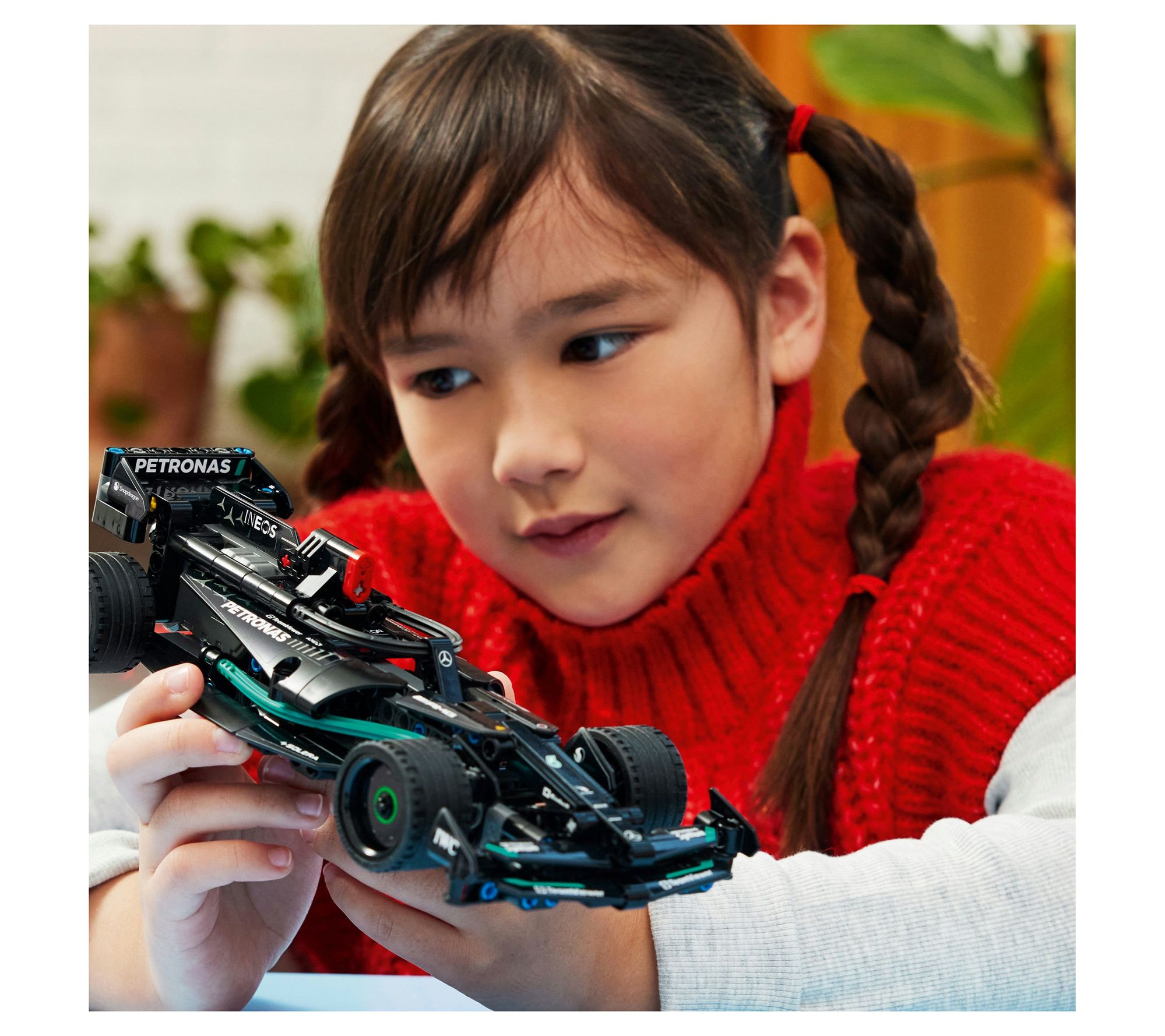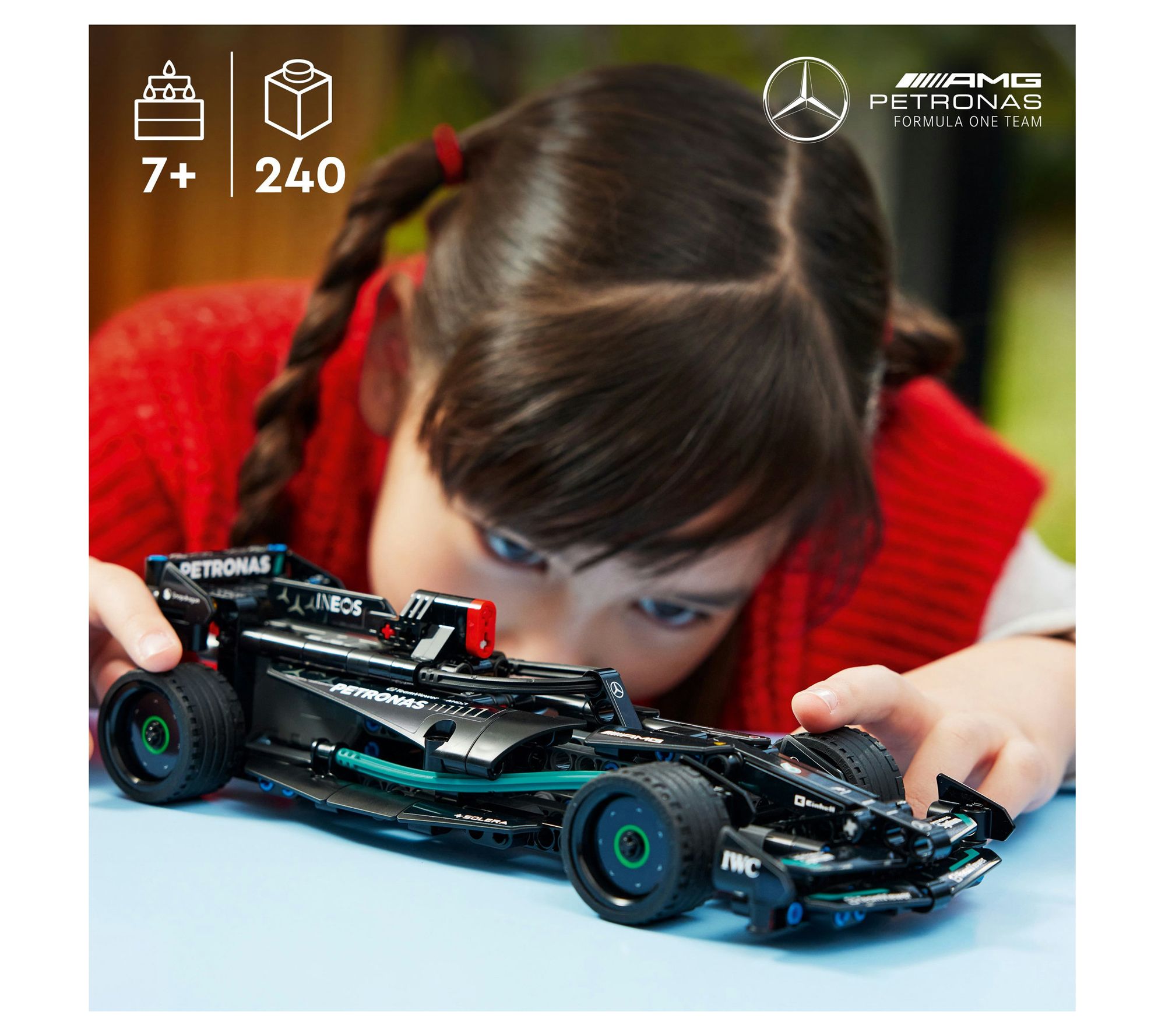 Racing fans can dive into the excitement of the track with this LEGO Technic Mercedes-AMG F1 W14 E Performance Pull-Back set. Build every detail of this blocks model before sending it zooming down the straightaway with its pull-back action -- ideal for sparking creative play and role-playing as a champion driver. From LEGO.