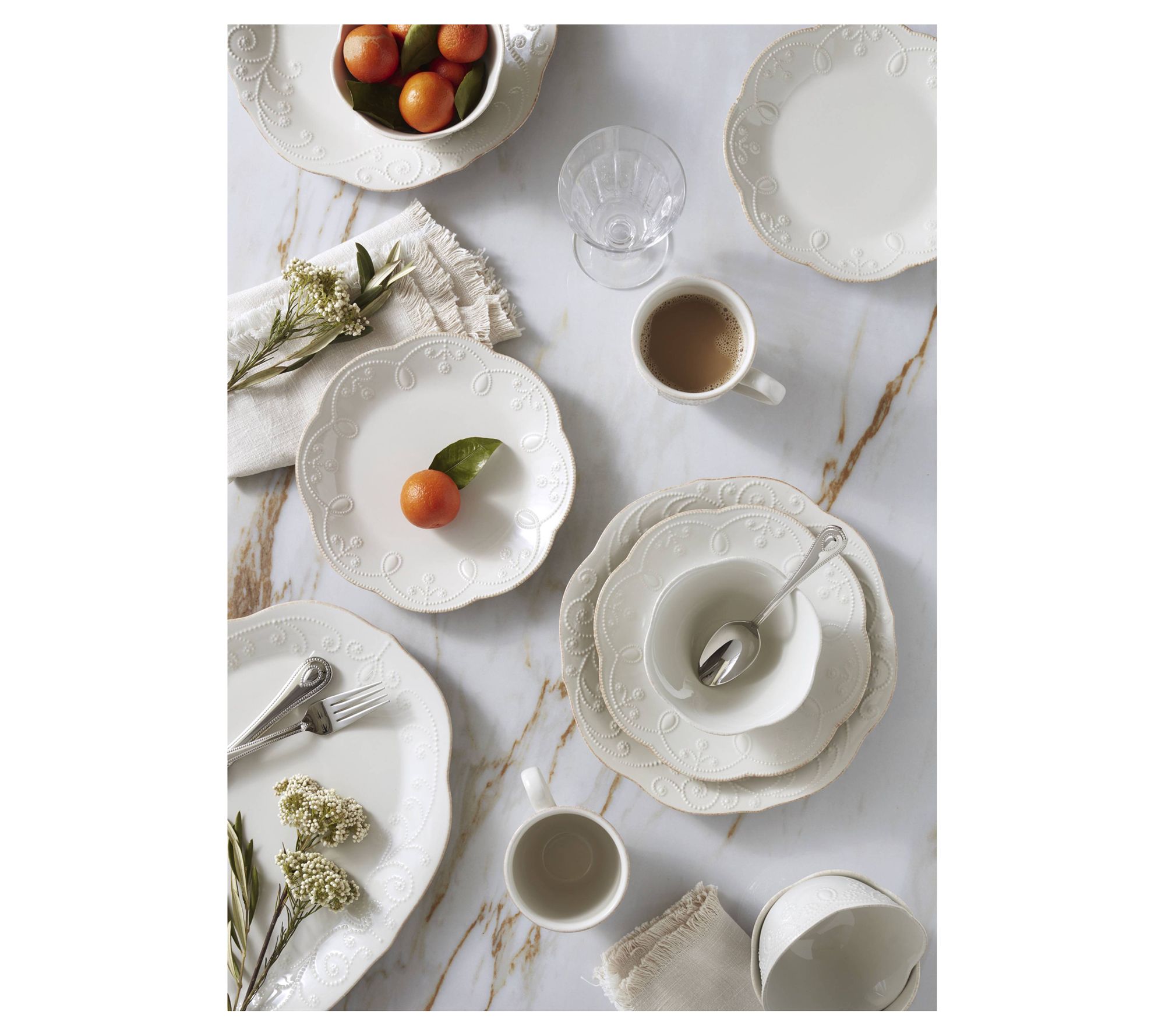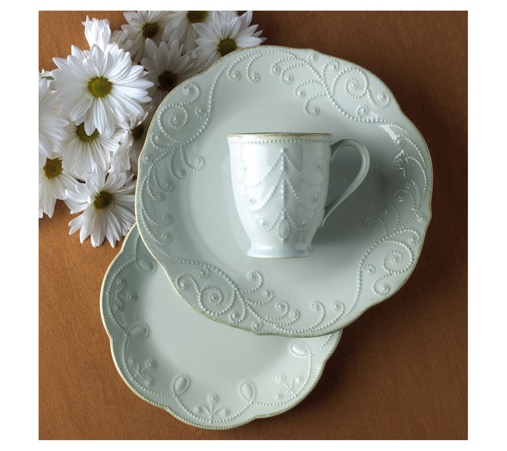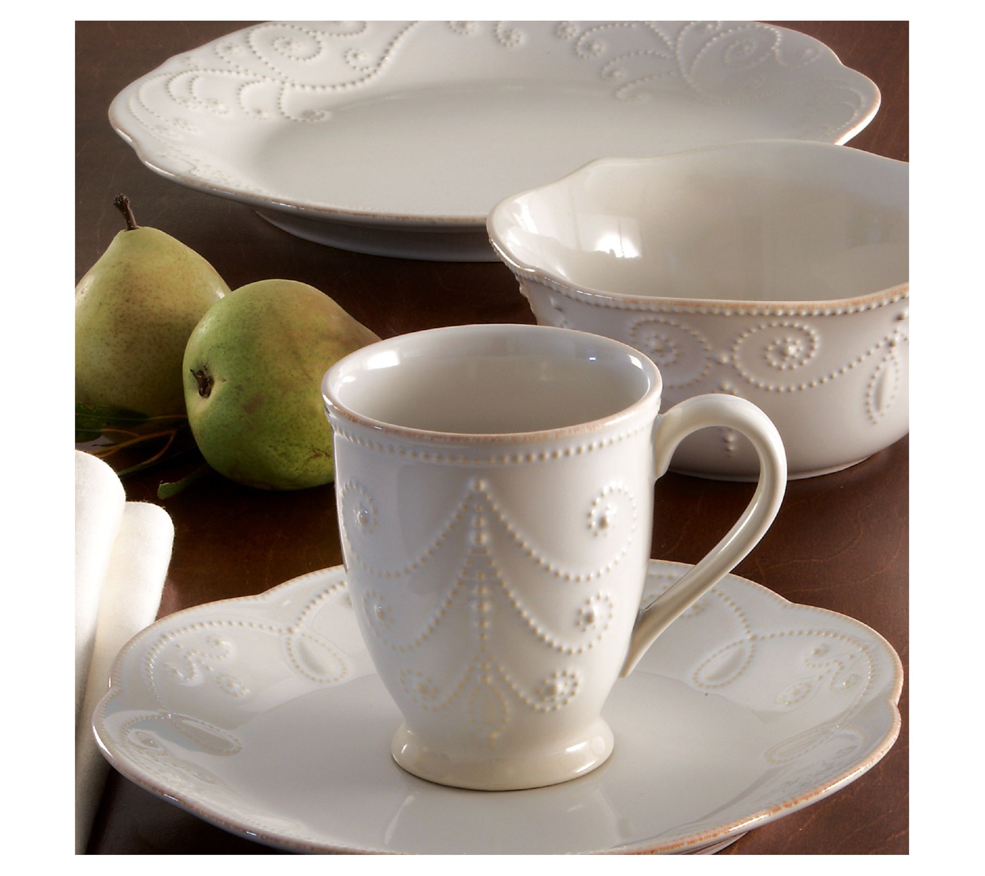 Elevate your dining experience with the Lenox French Perle place setting. Crafted from durable stoneware, each piece features a gently scalloped border and tea stains for a touch of elegance. Enjoy the subtle texture of scrolling beads along the edges, making every meal feel special. From Lenox.