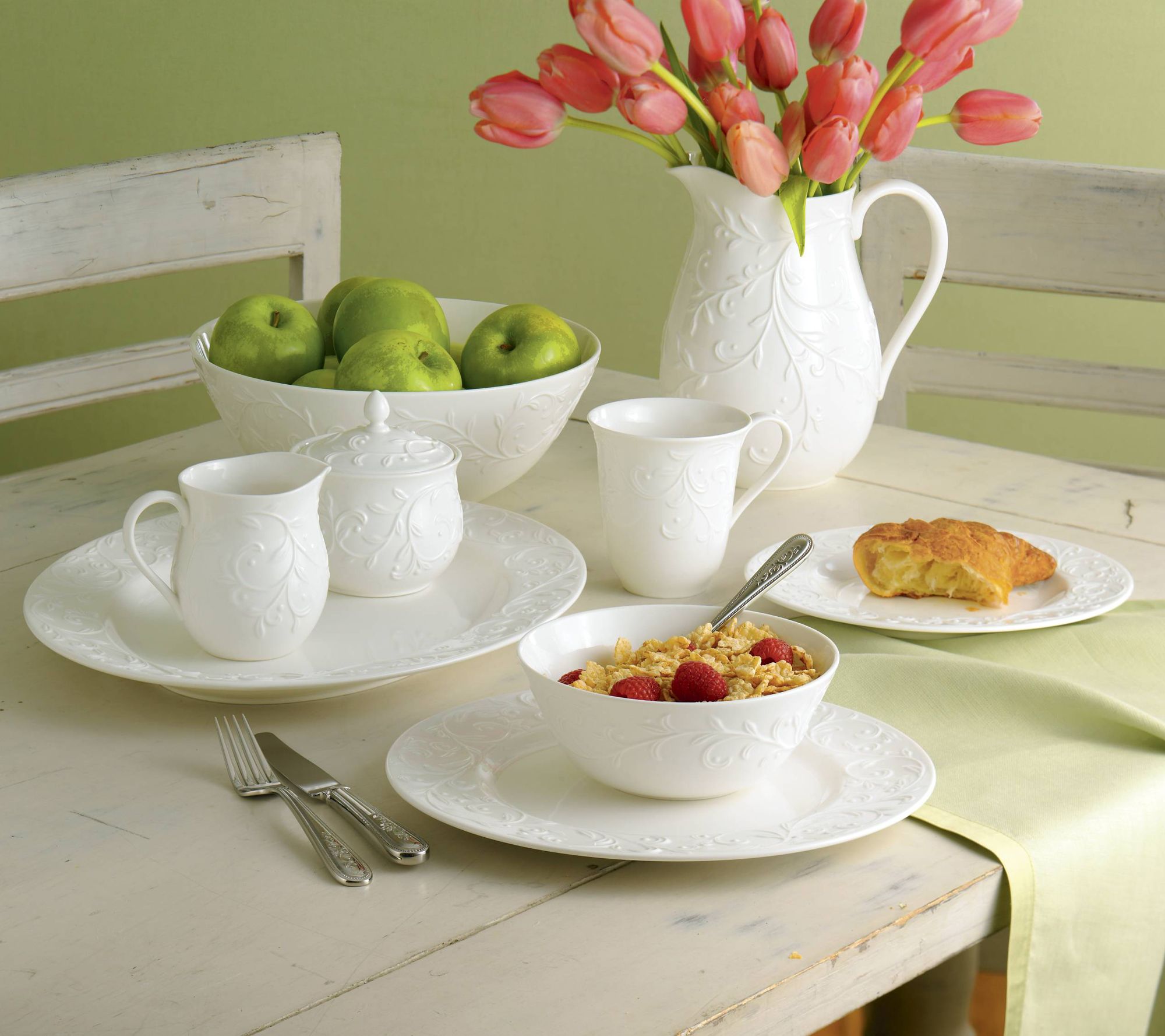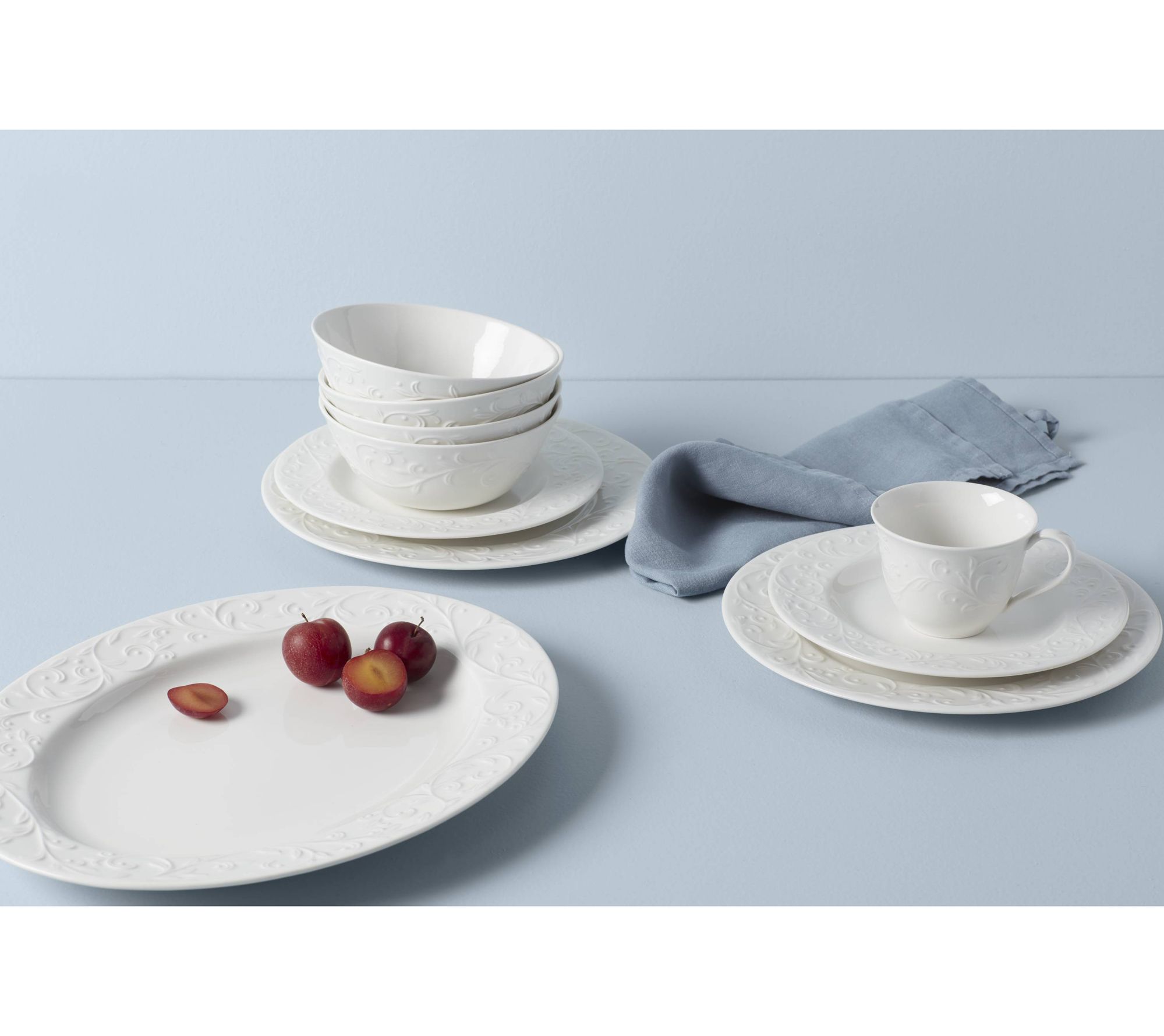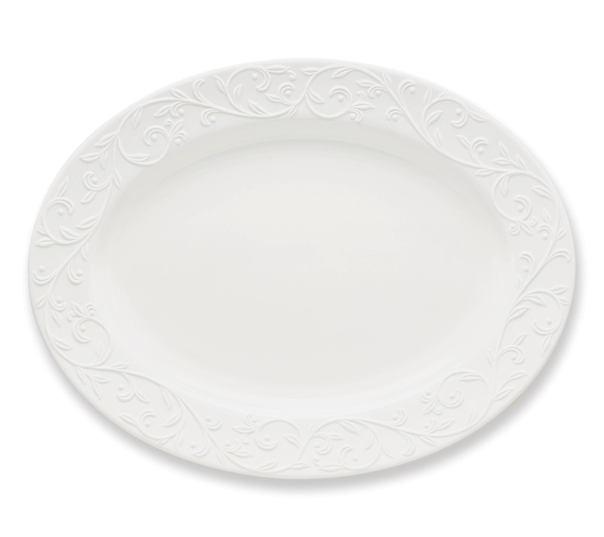 The Lenox Opal Innocence carved oval serving platter brings elegance to your dining table with its flowing scroll motif in raised relief on a pristine white rim. Perfect for presenting a small roast or side course, this platter is both stylish and practical. From Lenox.