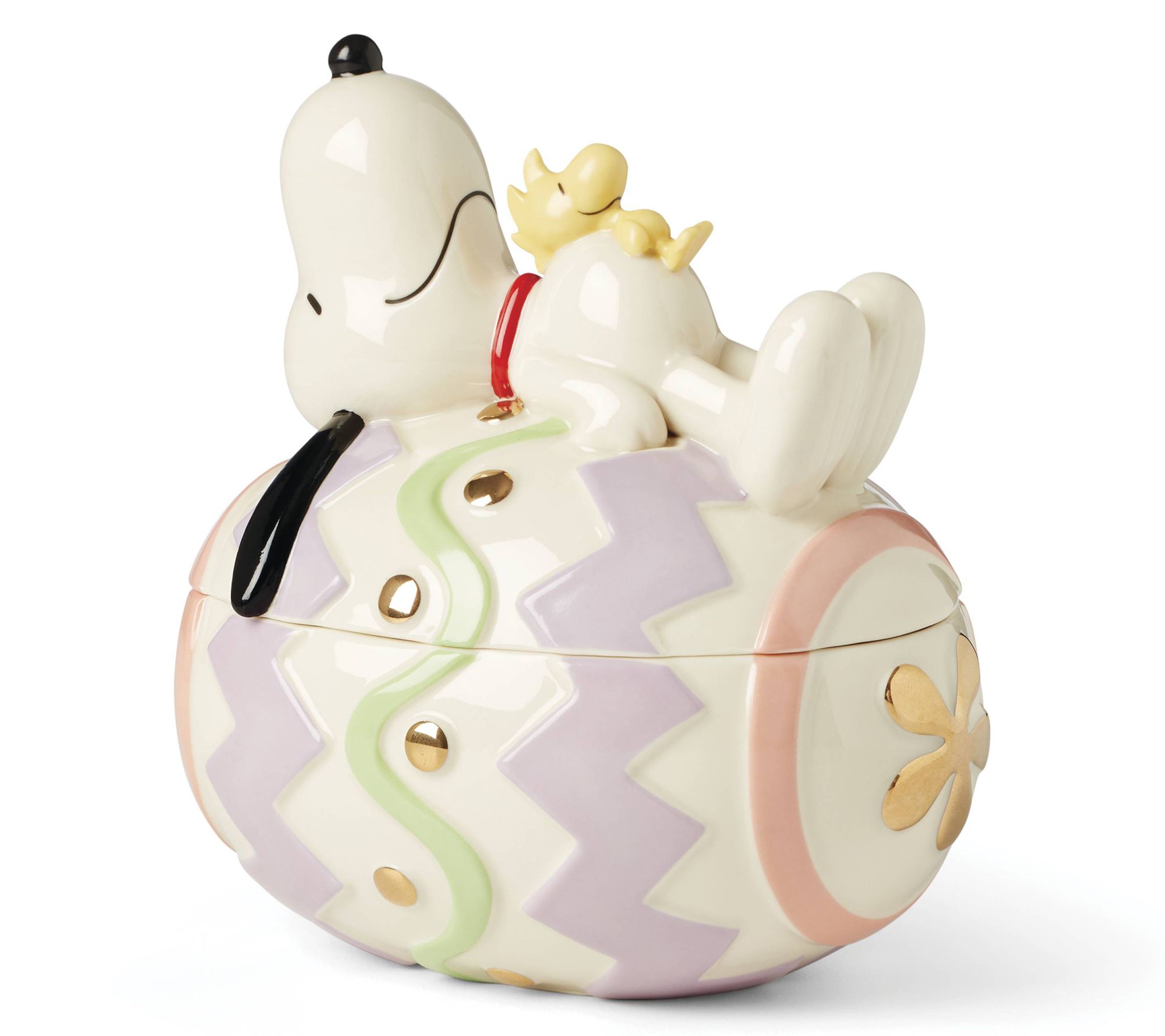 Snoopy and Woodstock are ready to add a touch of charm to your Easter celebrations! This delightful covered candy dish is perfect for storing your favorite treats while making your table or countertop look even more festive. It features the beloved Peanuts characters dreaming atop an Easter egg, bringing a whimsical touch to your home. From Lenox.