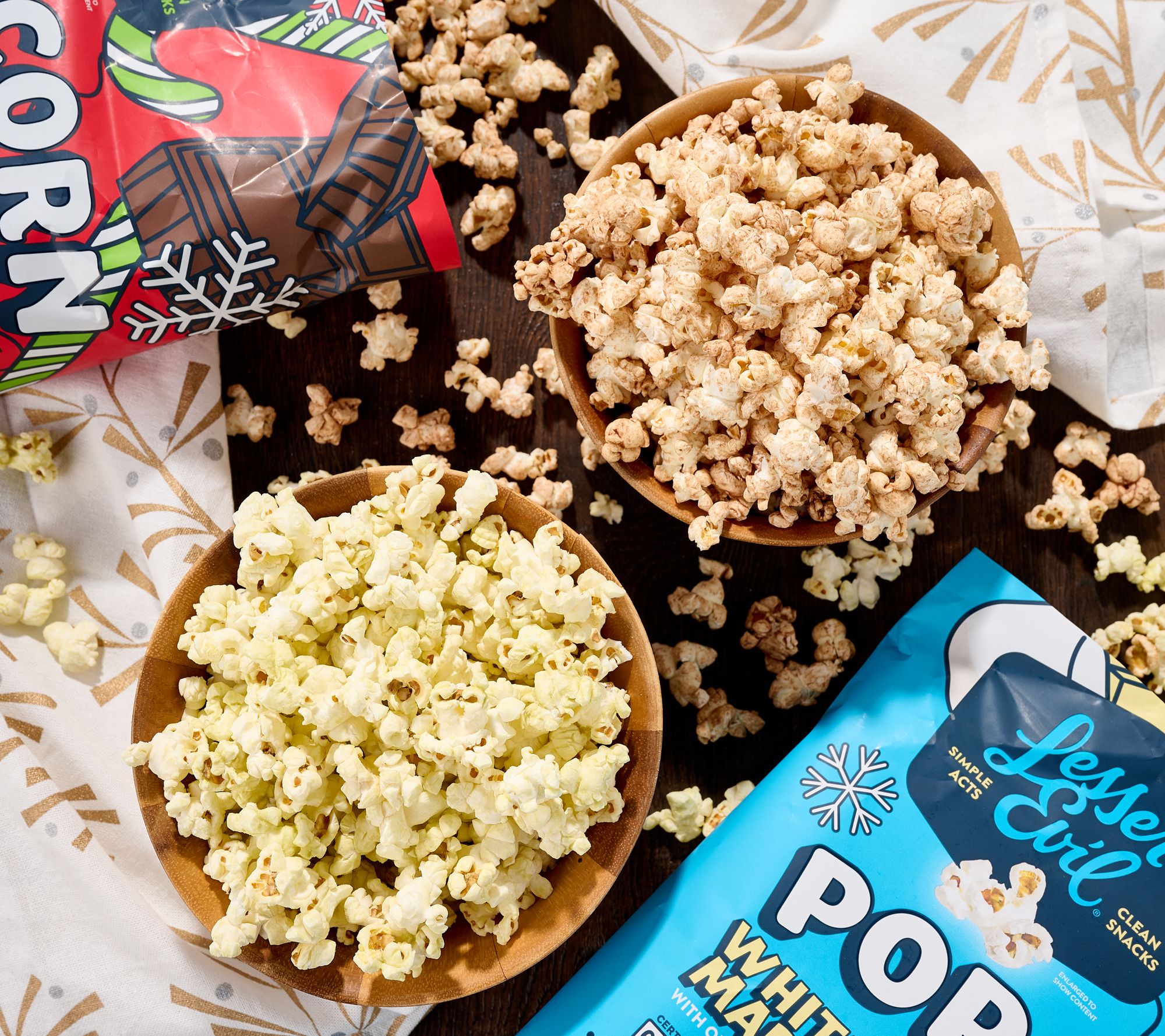 Includes six 4.6-oz bags of Holiday Recipe gourmet popcorn