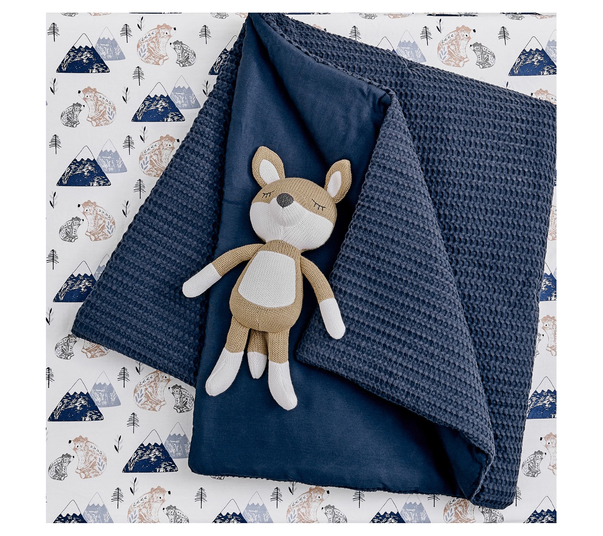 • Includes quilt, fitted sheet, dust ruffle, and rope basket