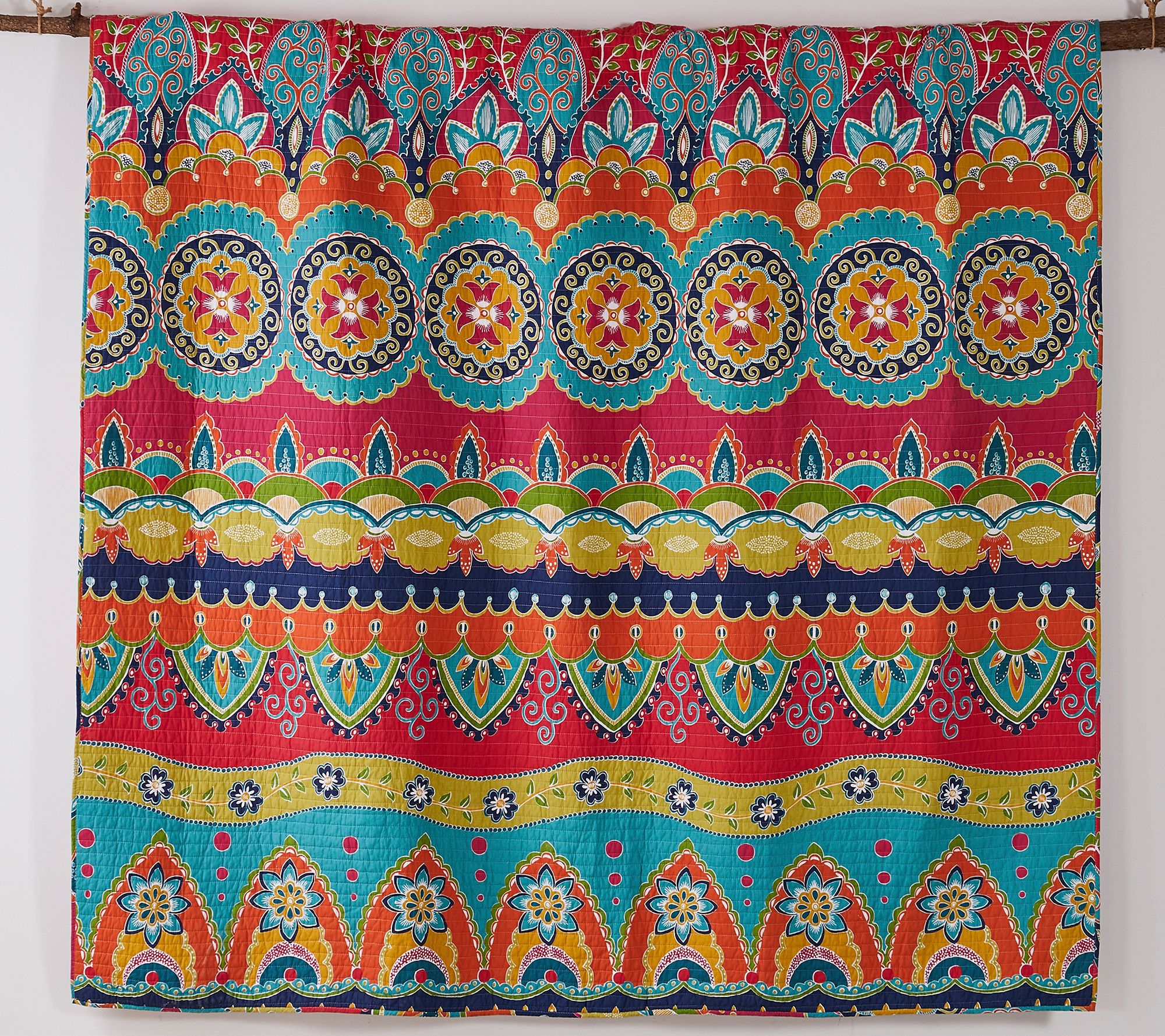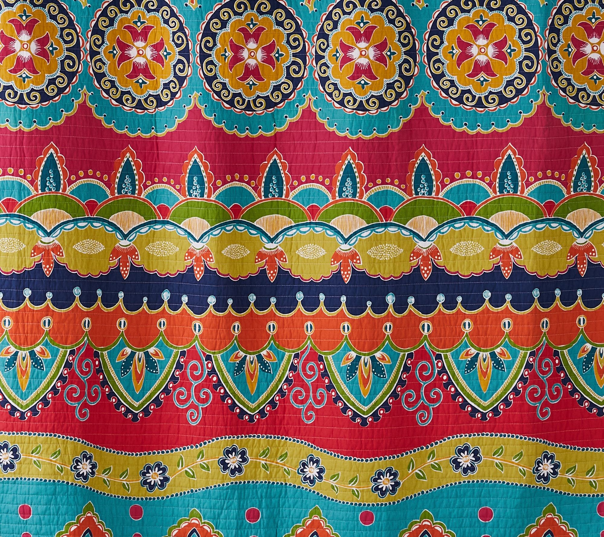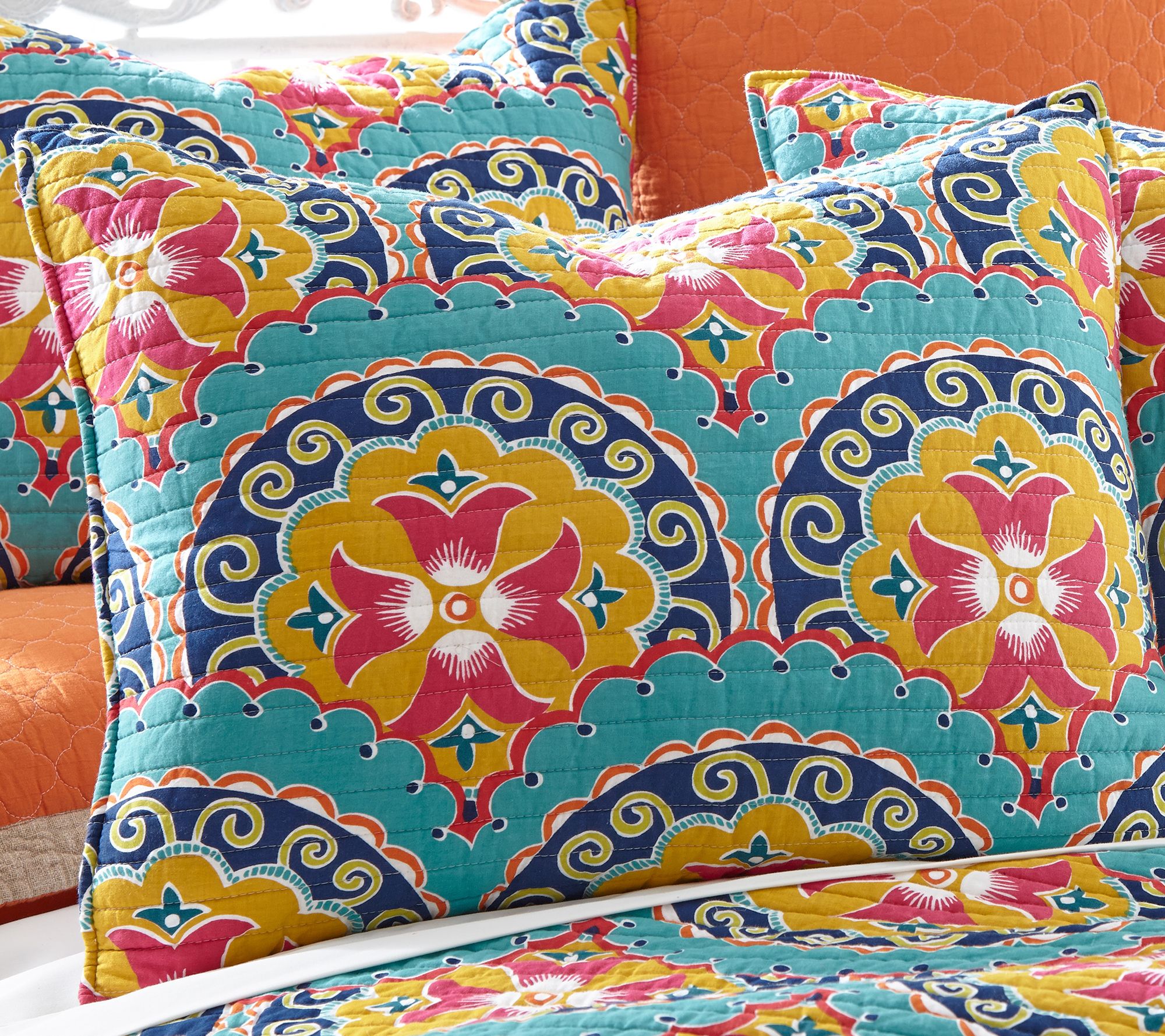 Give your bedroom an instant makeover with the vibrant colors and boho-chic medallion pattern of this reversible Amelie quilt set. From Levtex Home.
