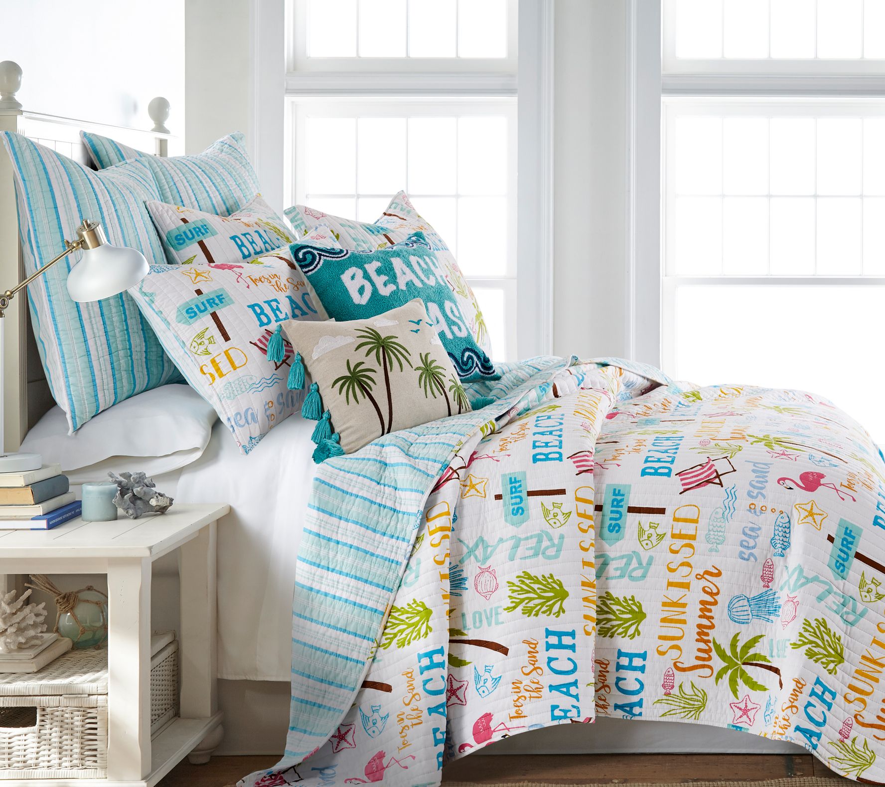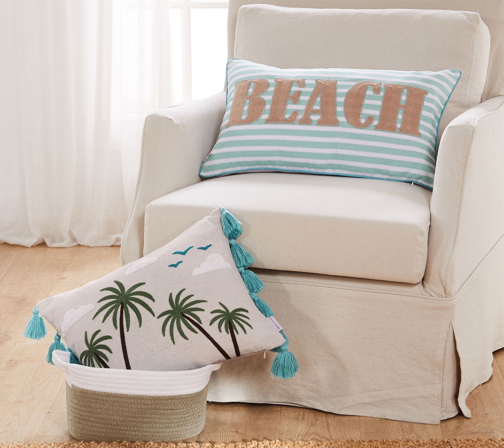 Give your space a fresh, beachy vibe with this gorgeous pillow featuring crewel-stitched palm trees and vibrant tassels. From Levtex Home.