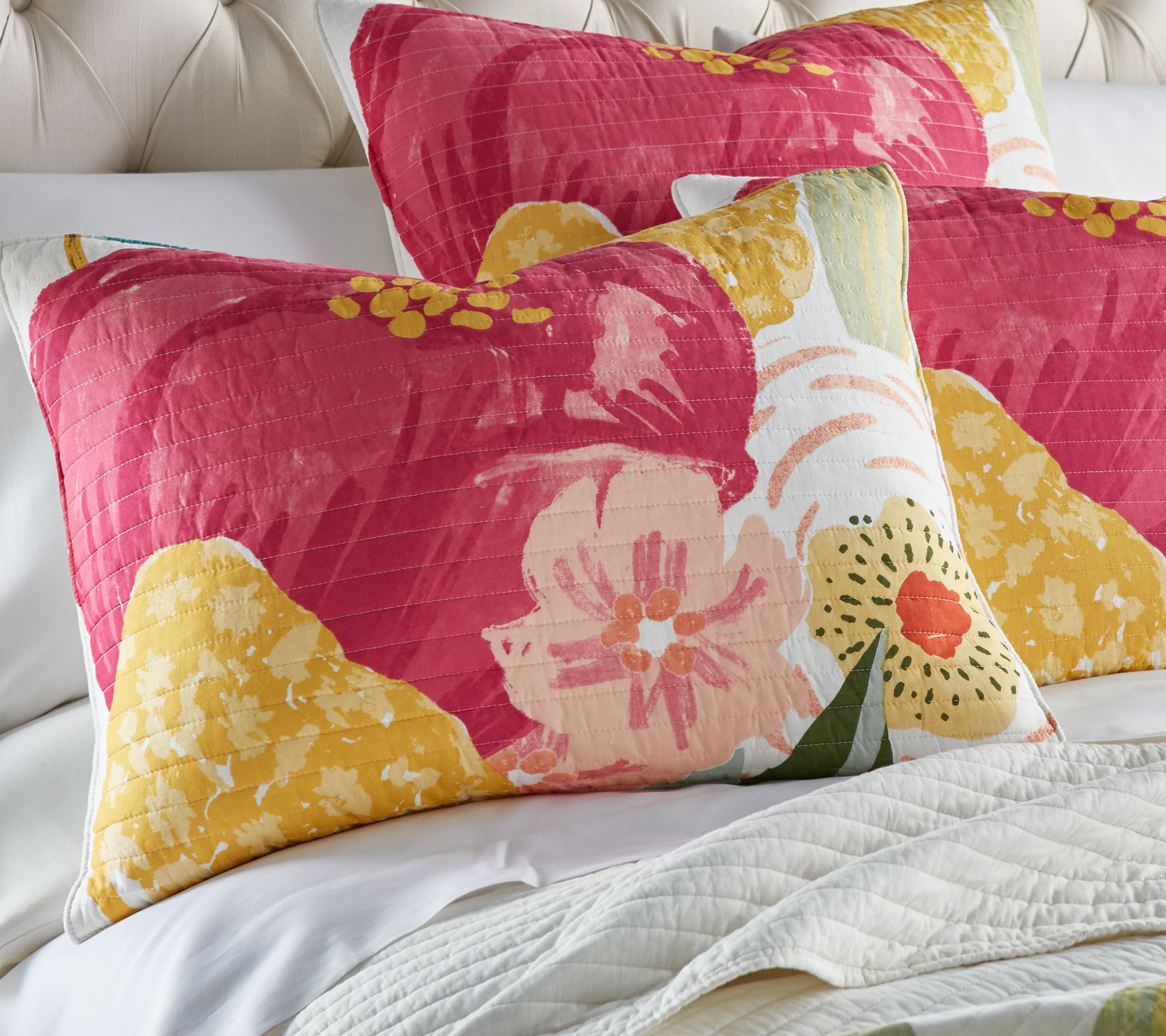 Magnificent watercolor blossoms make the Grandiflora quilt set a vibrant and bold addition to any bedroom. When you're ready for a change, it's reversible for the ultimate in versatility. From Levtex Home.