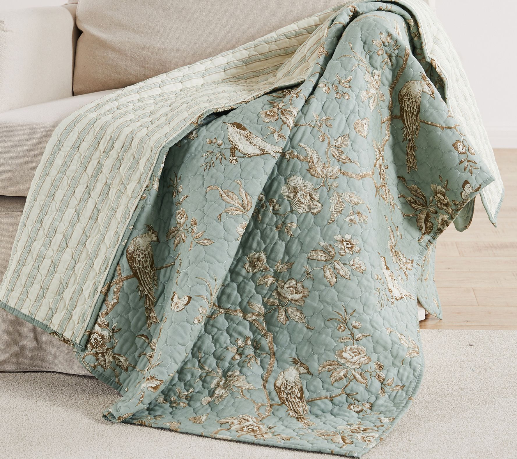 Inspired by classic French design, the Lyon Teal quilted throw features a brown and cream floral bird toile on a rich teal background with a lovely reverse striped pattern. From Levtex Home.