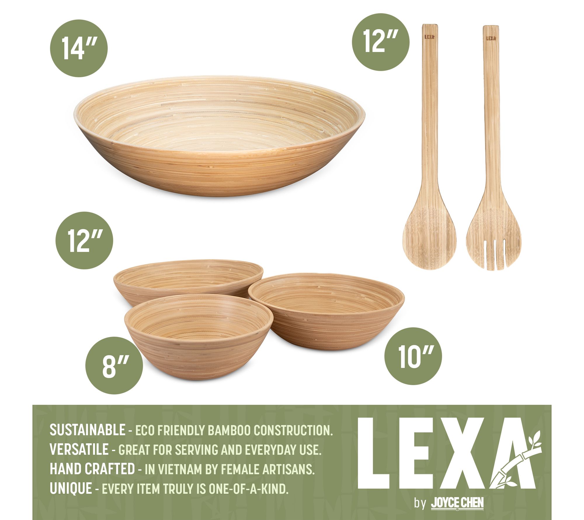 • Includes 14" salad bowl, 12" salad bowl, 10" salad bowl, 8" salad bowl, and one salad utensil set (spoon and fork)