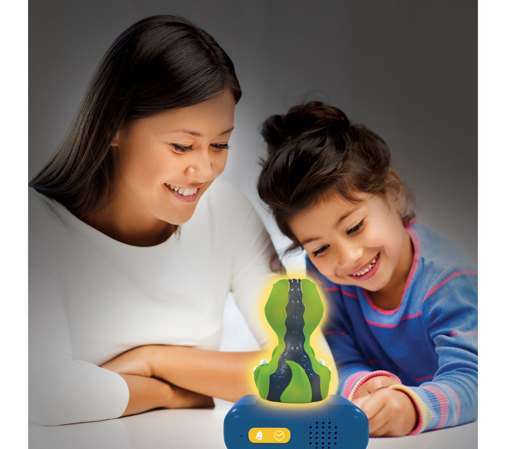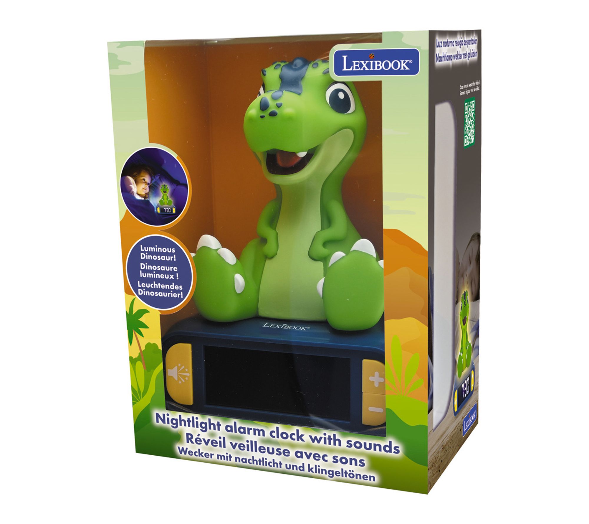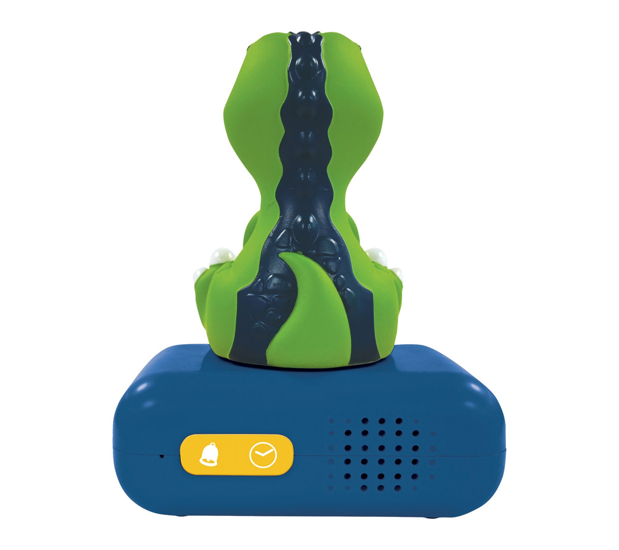 • Dinosaur character lights up for a few minutes when you press a button or the top of the clock
