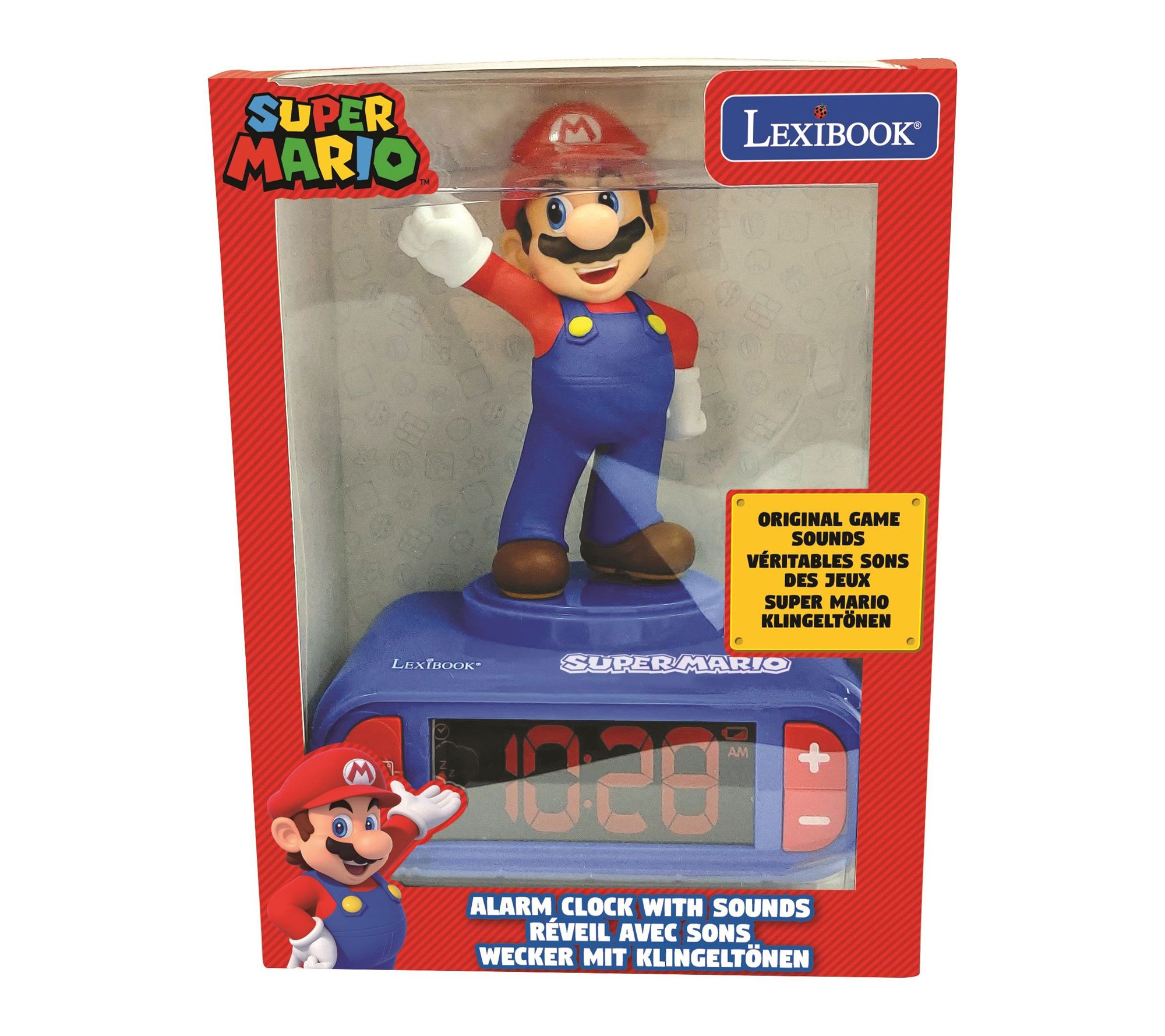 • Features LCD backlit screen, Mario figurine, button for sound effects, choice of Mario-inspired ringtones, snooze function, and low battery indicator