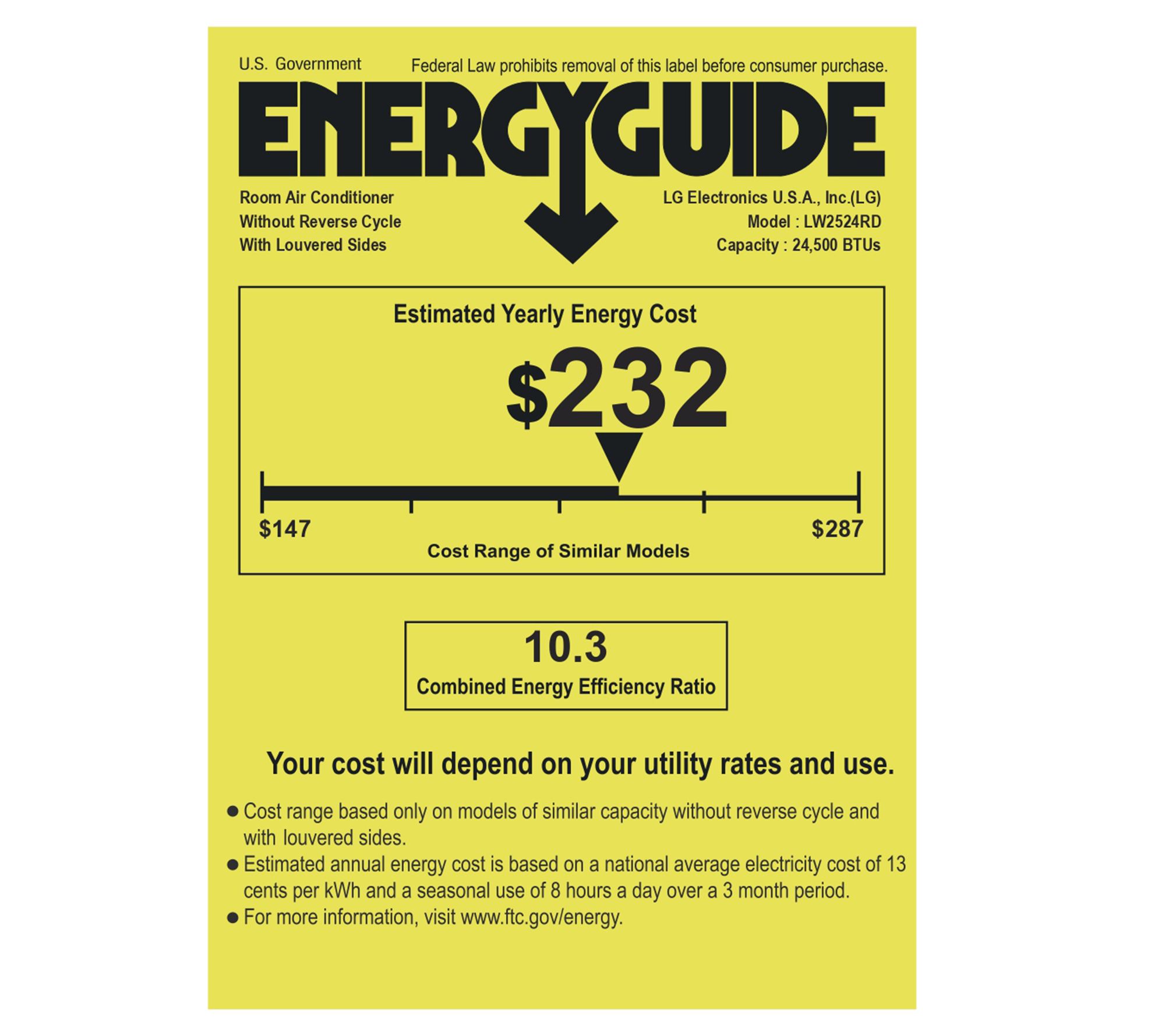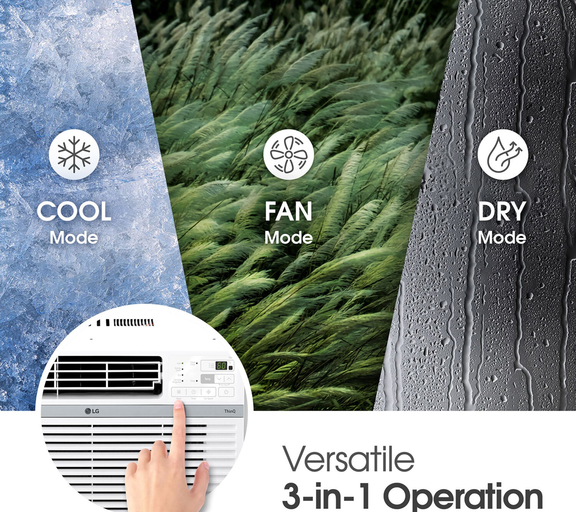 Stay cool and comfortable with this air conditioner designed to cool spaces efficiently. This powerful unit comes with three cooling and fan speeds, Auto Cool mode, and a 24-hour timer for ultimate convenience. The included remote control and slide-out washable filter with Check Filter alert make operation and maintenance a breeze. From LG.