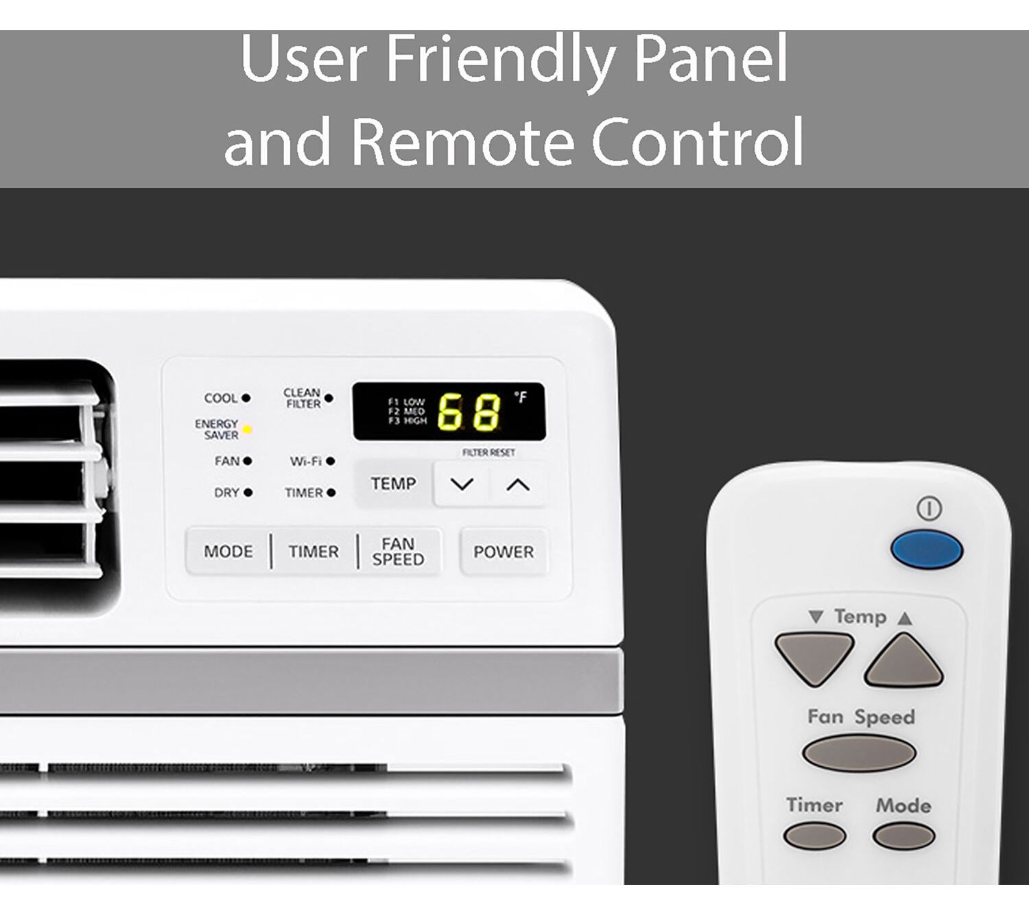 Includes window air conditioner, window installation kit, remote control, and power cord