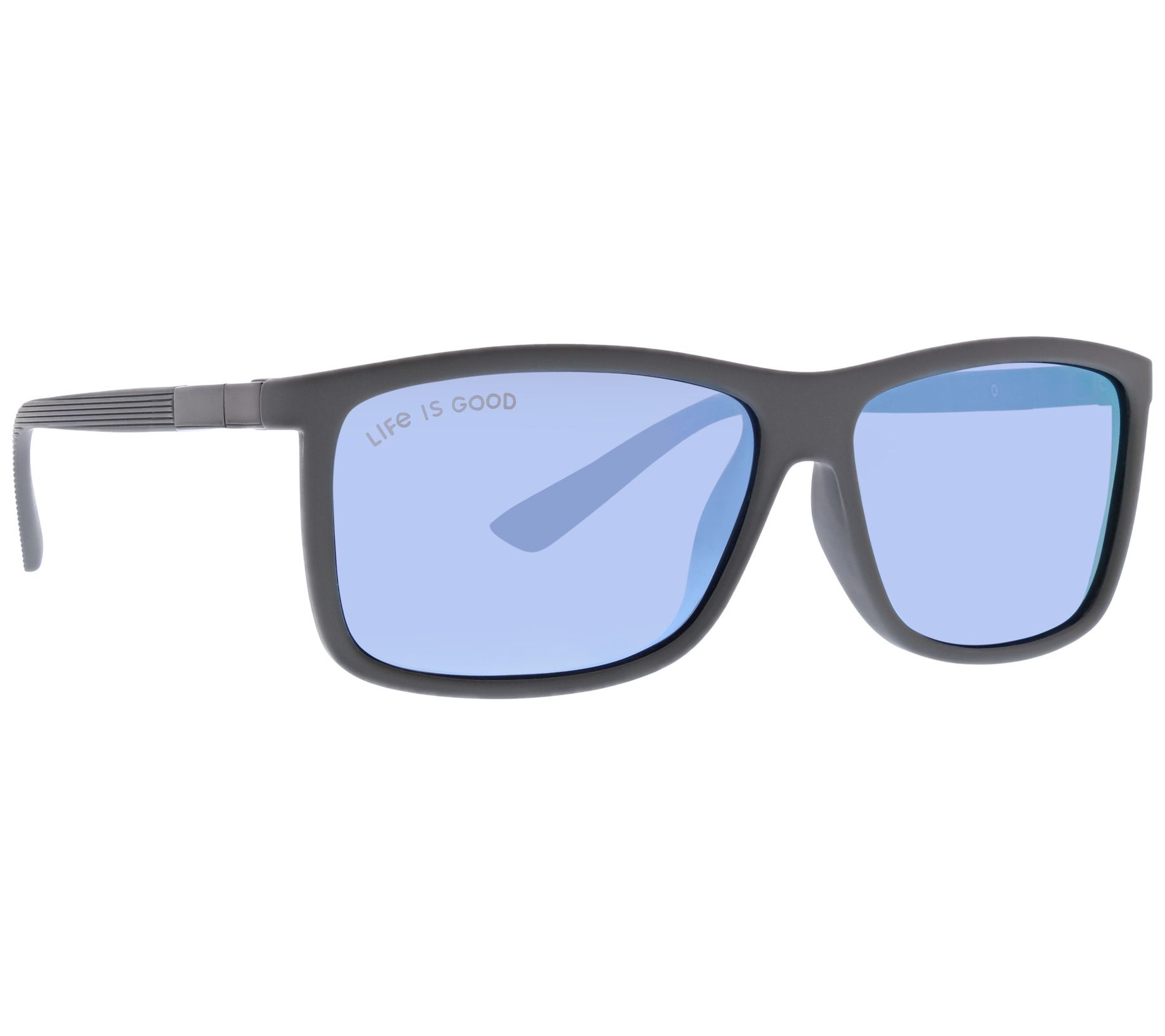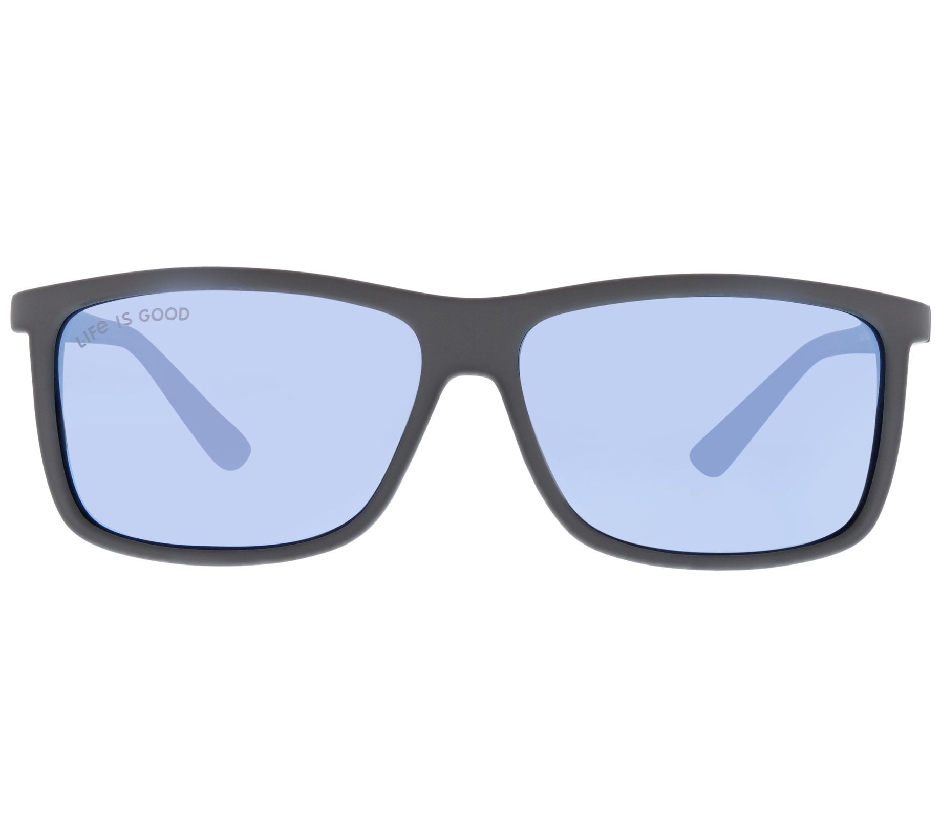 • Rectangle flat top frame, ridge effect on temples with metal decor, Life is Good logo on inside of temple and top corner of outside lens