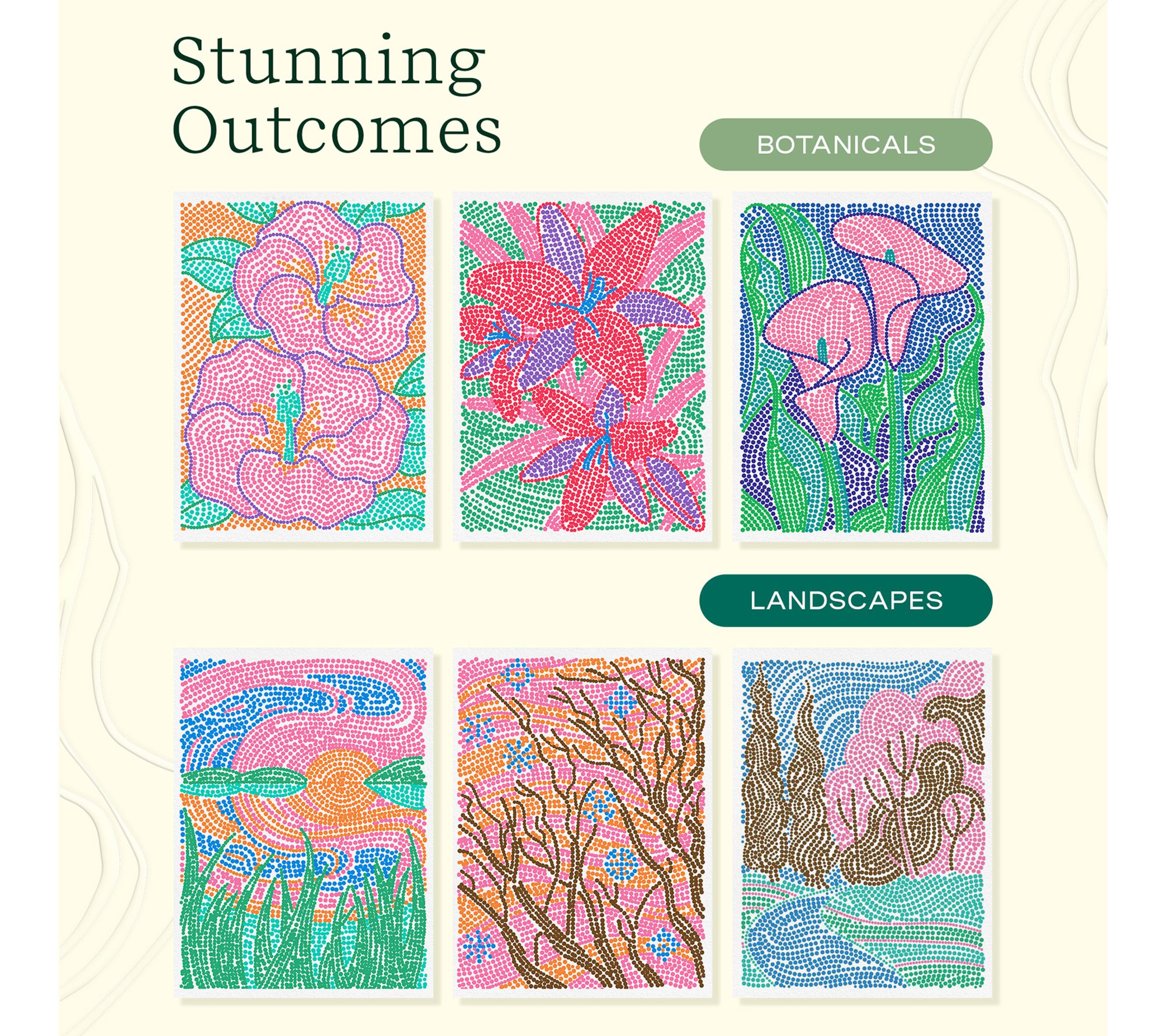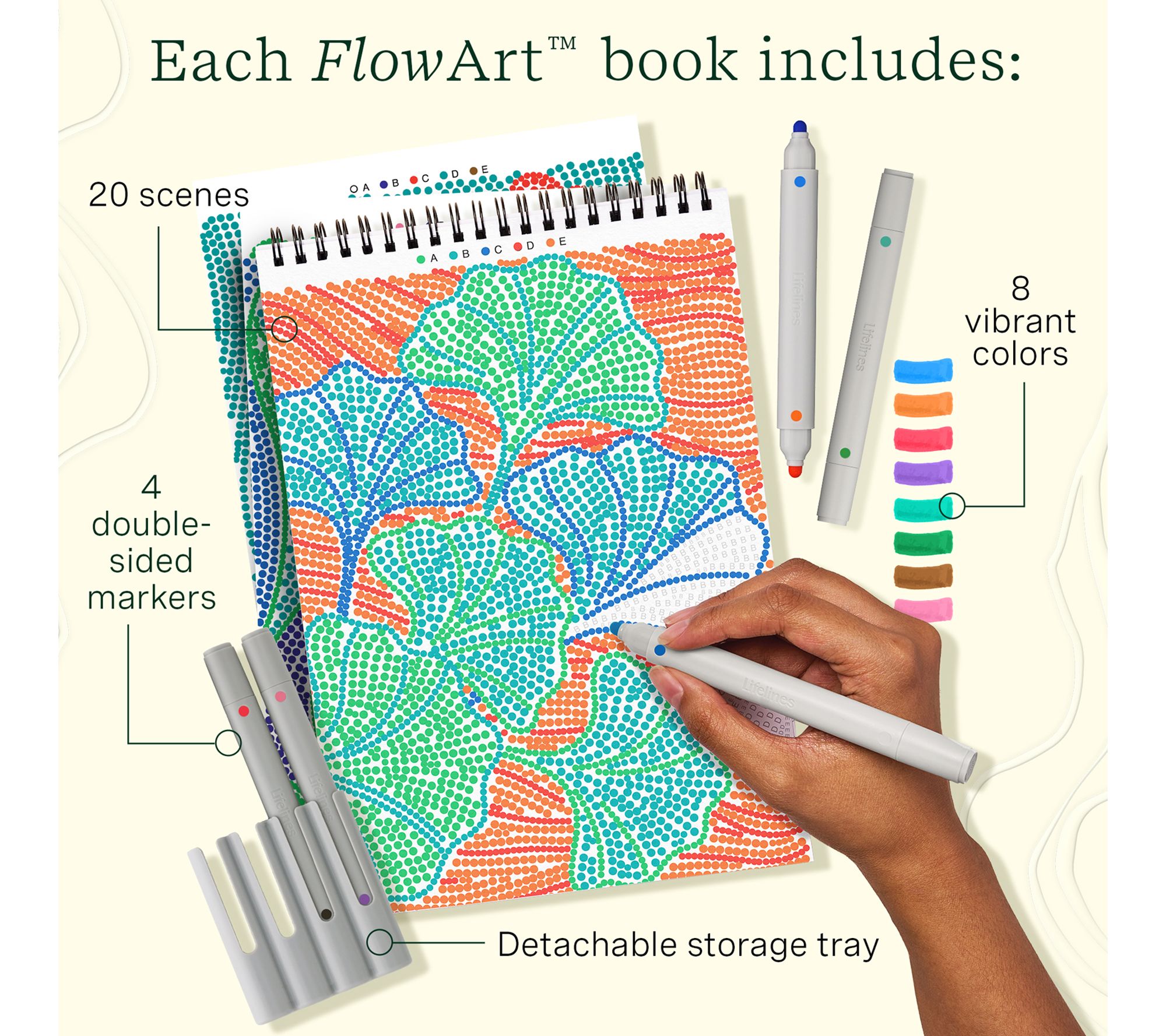 Unwind with a creative ritual that turns simple dotting into stunning art -- the Flow Art Dot Art albums invite you to relax, focus, and reveal beautiful botanicals and landscapes one dot at a time. Each page offers a soothing, meditative scene and vibrant markers to spark your imagination, making every session a moment of calm and inspiration. From Lifelines.