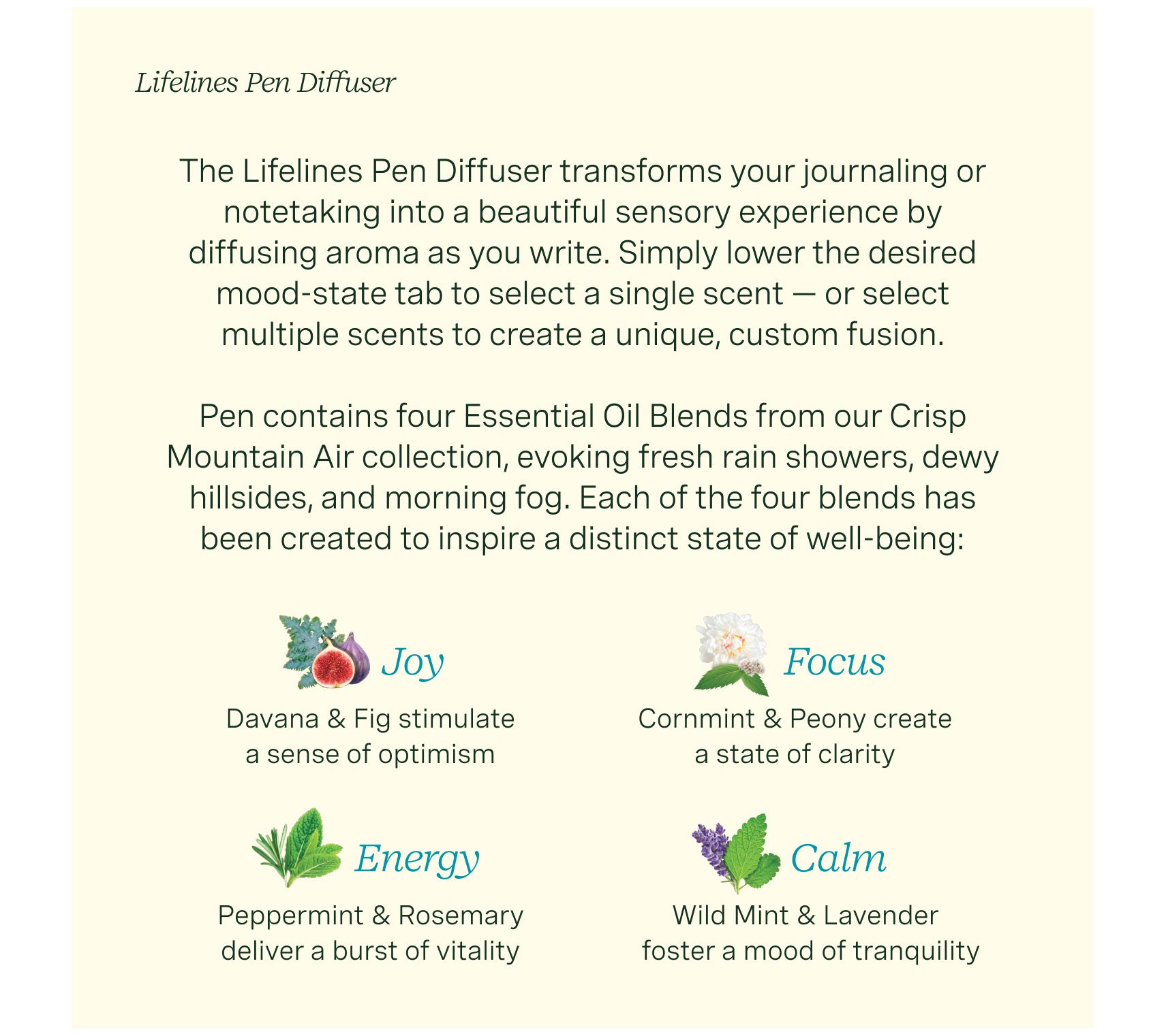 • Pen diffuser contains essential oils from the Crisp Mountain Air collection