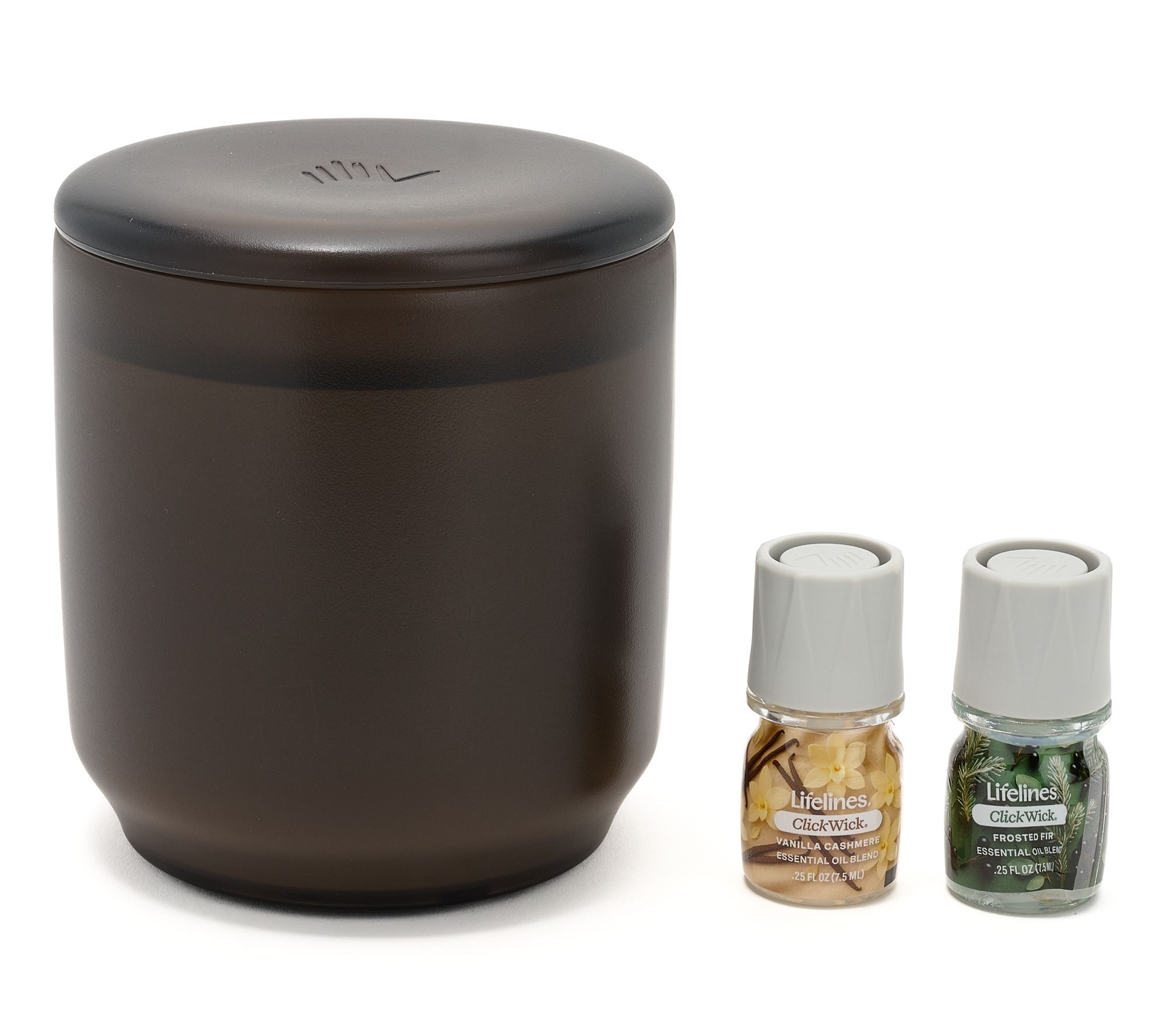 • Includes rechargeable flameless candle and two ClickWick essential oils in Vanilla Cashmere and Frosted Fir scents