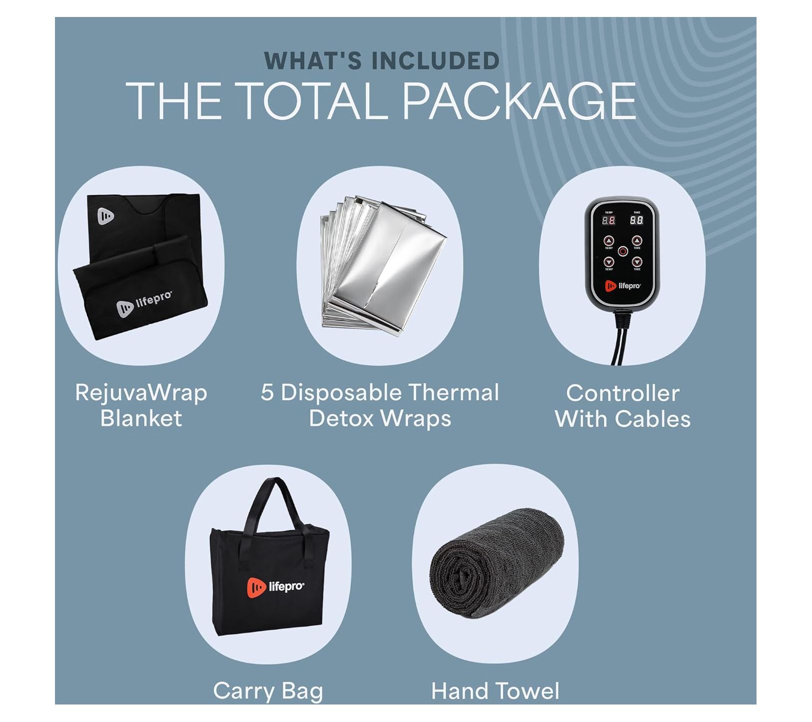 • Includes RejuvaWrap infrared sauna blanket, controller with power and connector cables, cotton face towel, five disposable thermal detox wraps, carrying bag, and manual