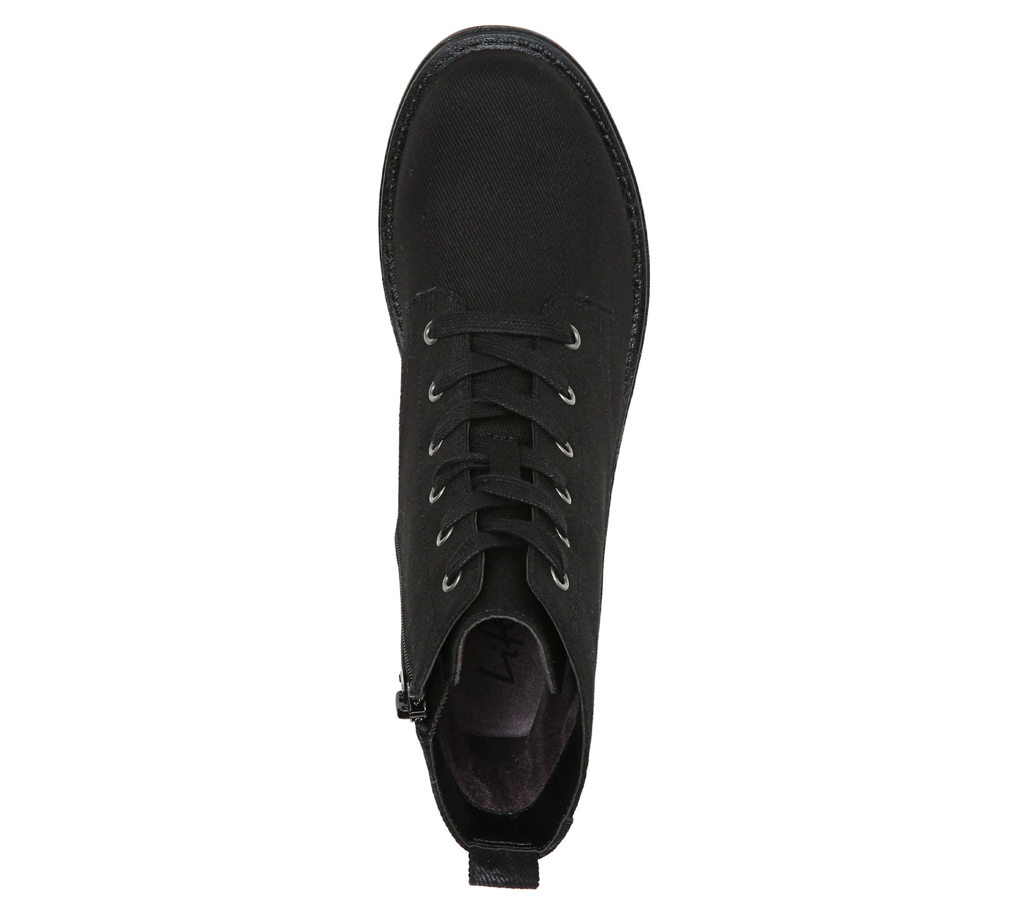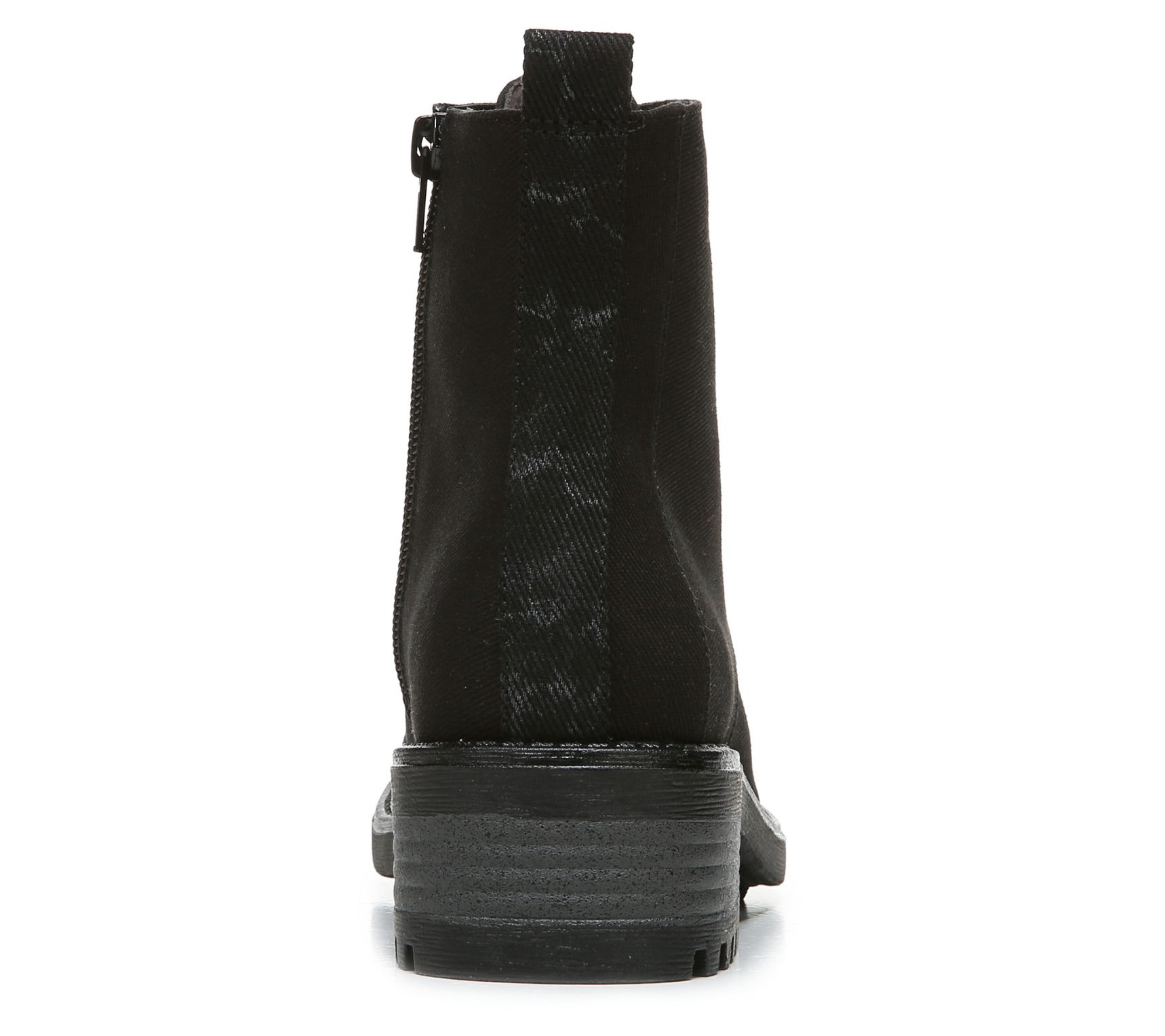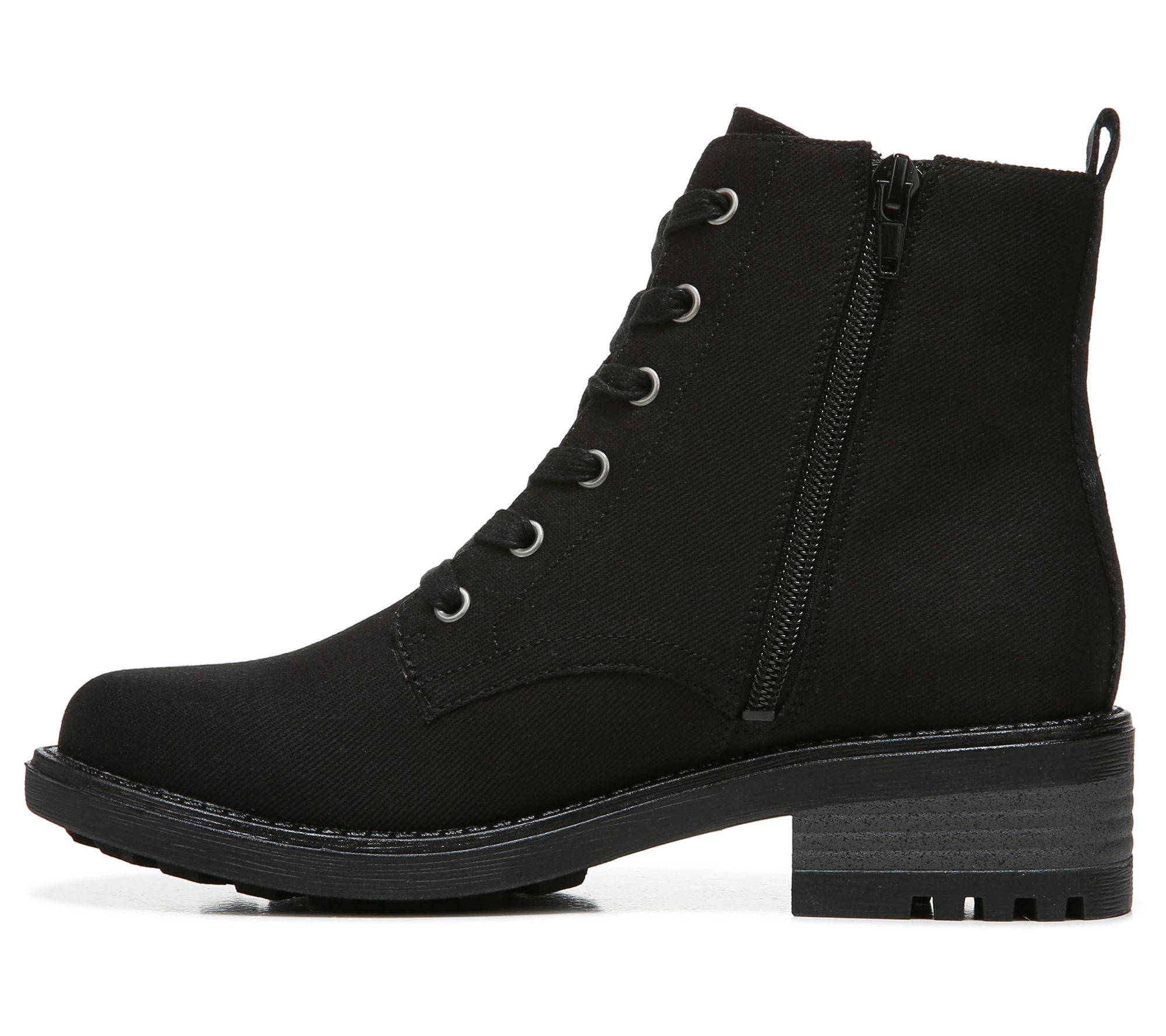• Rounded toe, inside nylon zipper, lace-up front, back pull tab, canvas upper, tie-dye or camo stripe at heel, lug outsole