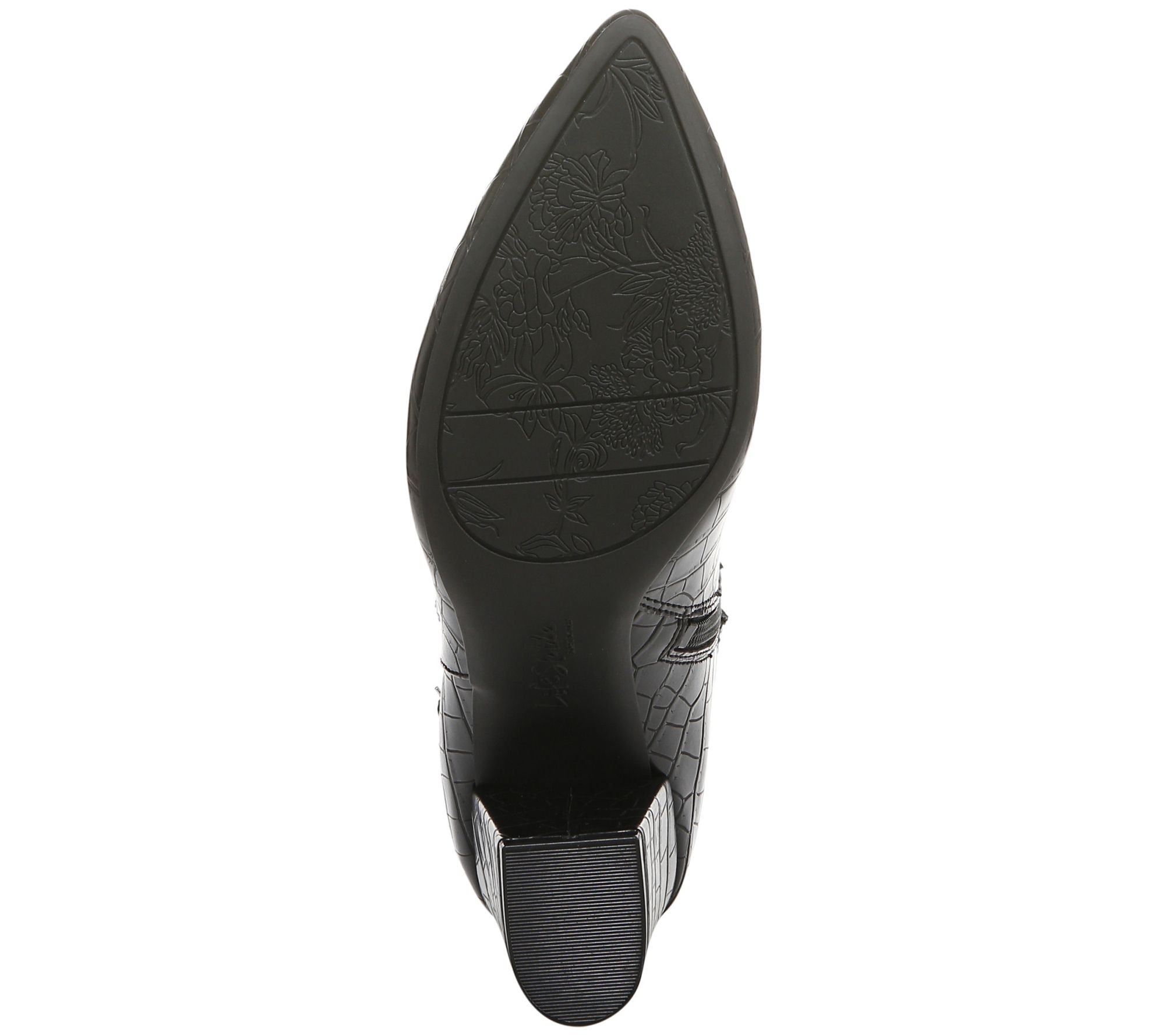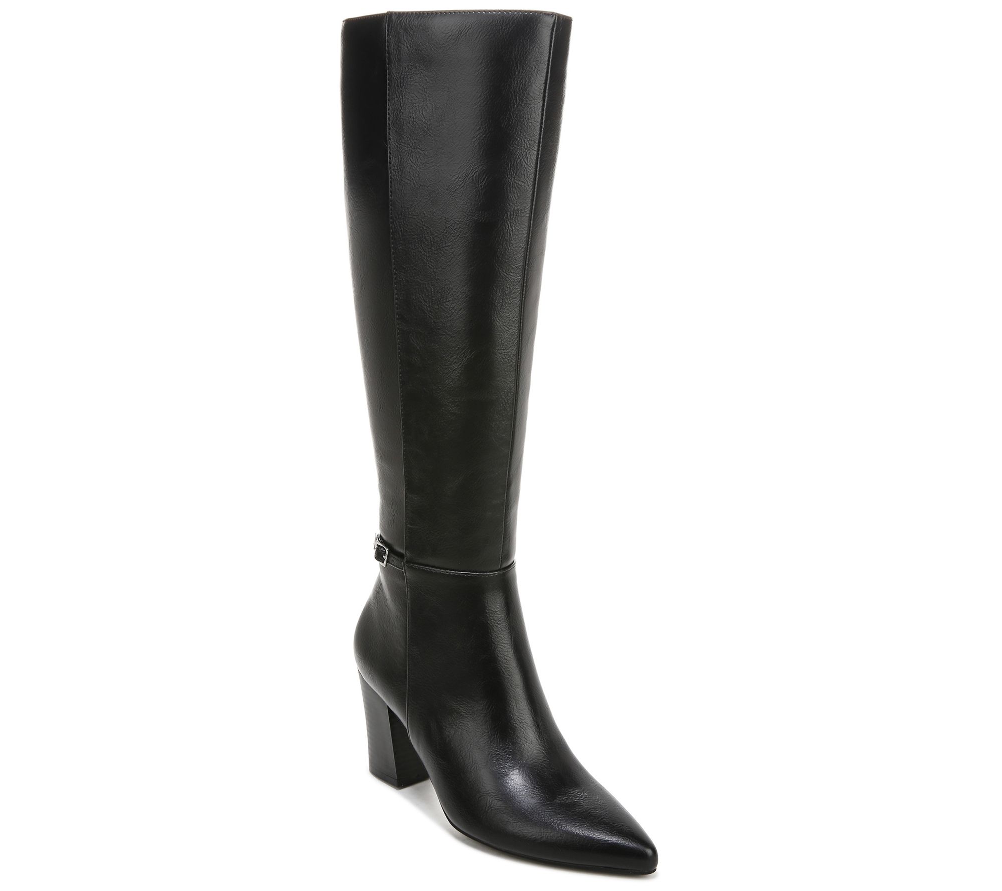 - Side-zip closure, faux leather upper, strap and buckle detail, pointed toe