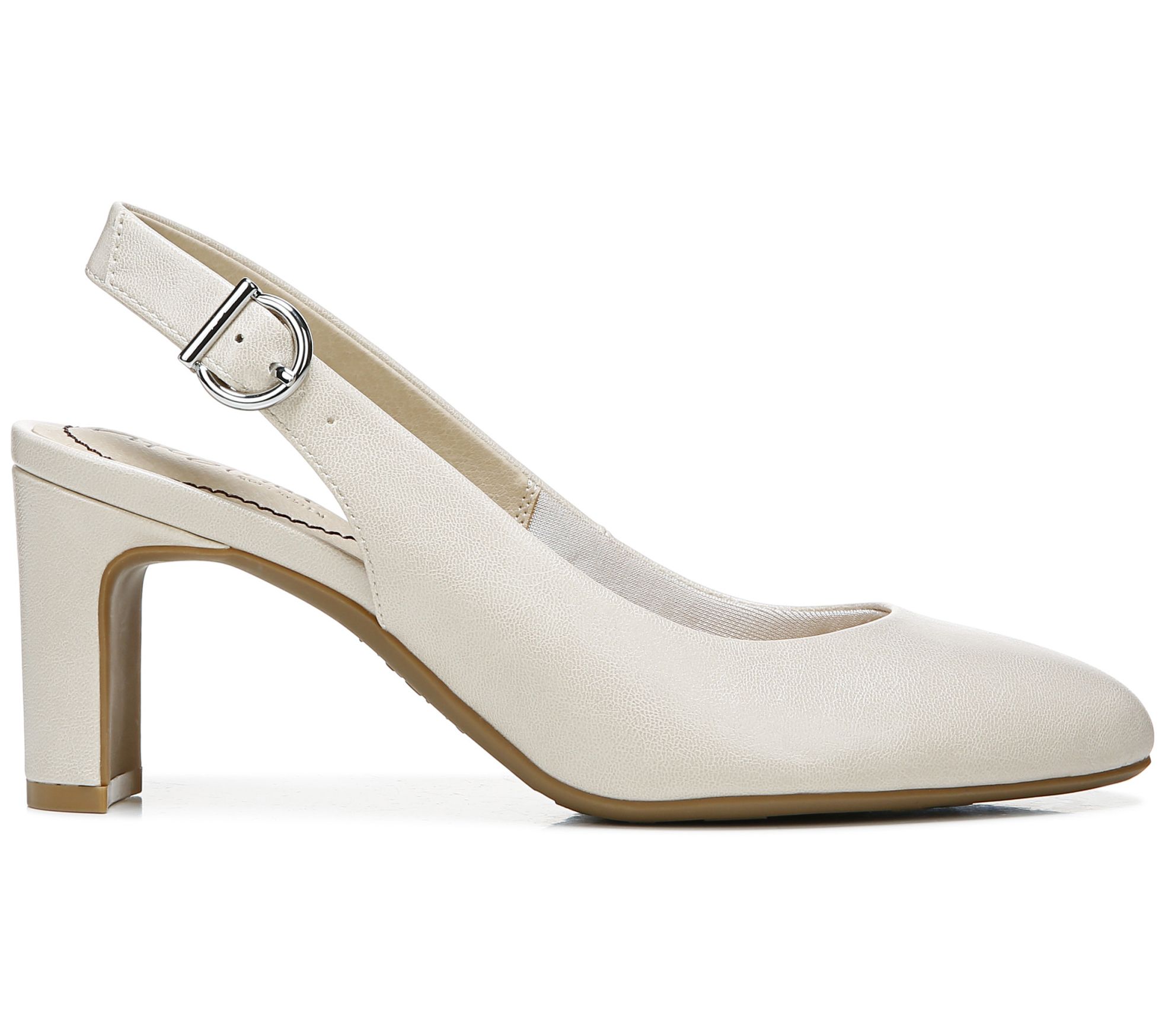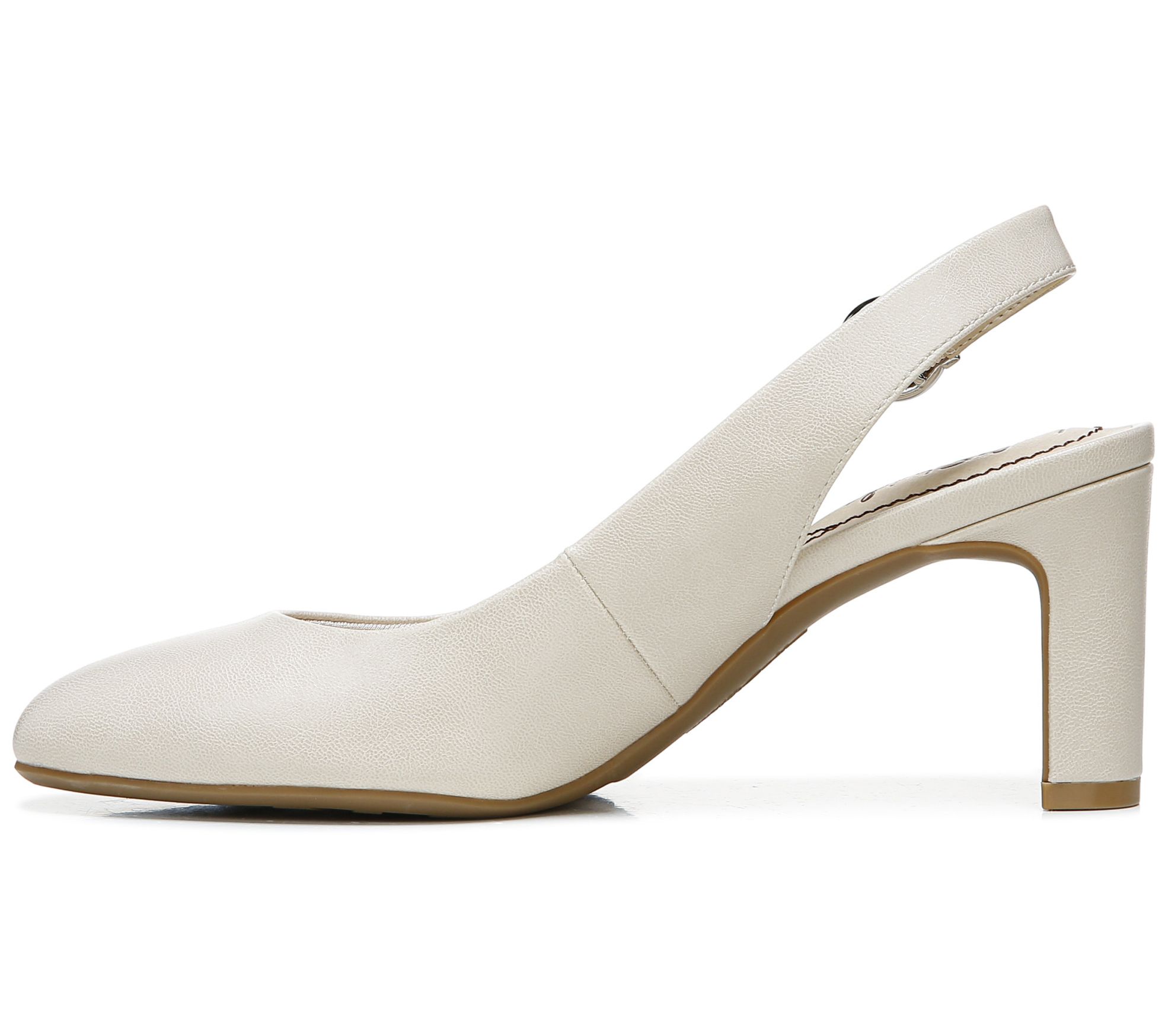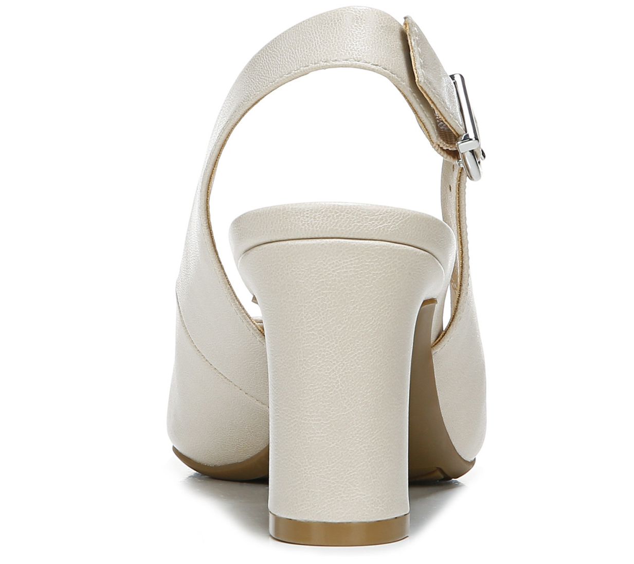 Slip-on style, adjustable slingback strap with buckle, modified block heel, tapered toe