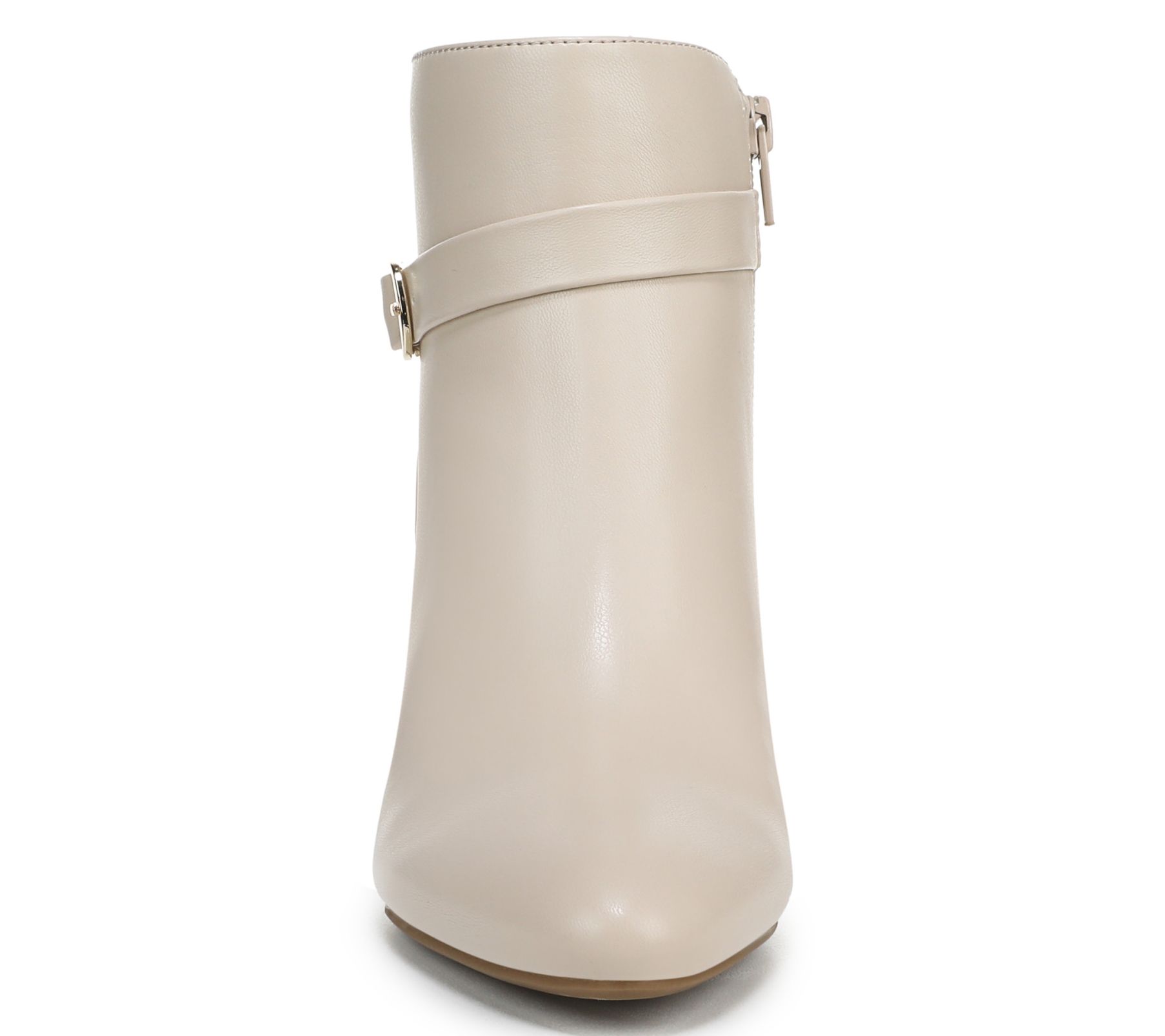 • Side zip, decorative strap and buckle detail, almond toe