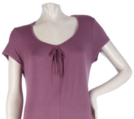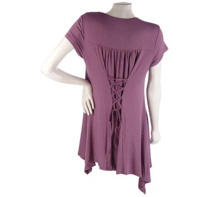Drape yourself in graceful, feminine style. This soft, flowing tunic flows beautifully and is enhanced by a ballet neckline and a wide, sweeping hemline. Create your own perfect fit with the adjustable lace-up ties on the back. This timeless top adds romantic flair to any outfit. From Lifestyle by Legacy(R) Fashions.