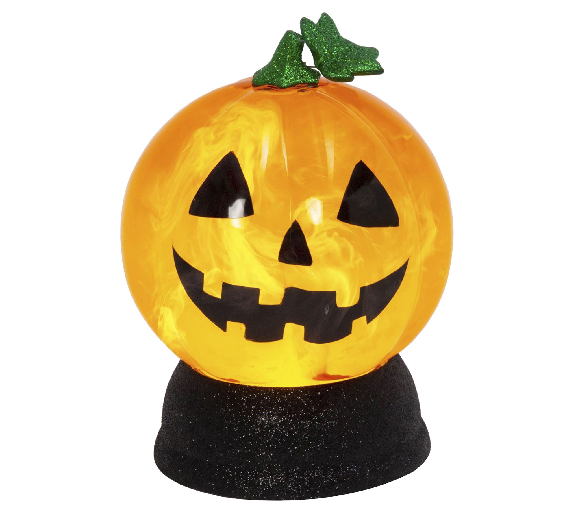 Welcome guests with this smiling LED jack-o'-lantern. This happy little guy features a spinning water globe with an enchanting smoky effect. Sitting on a glittery black base, and topped with a sparkling green stem and leaf, he's perfect for your Halloween home. From Gerson Co.
