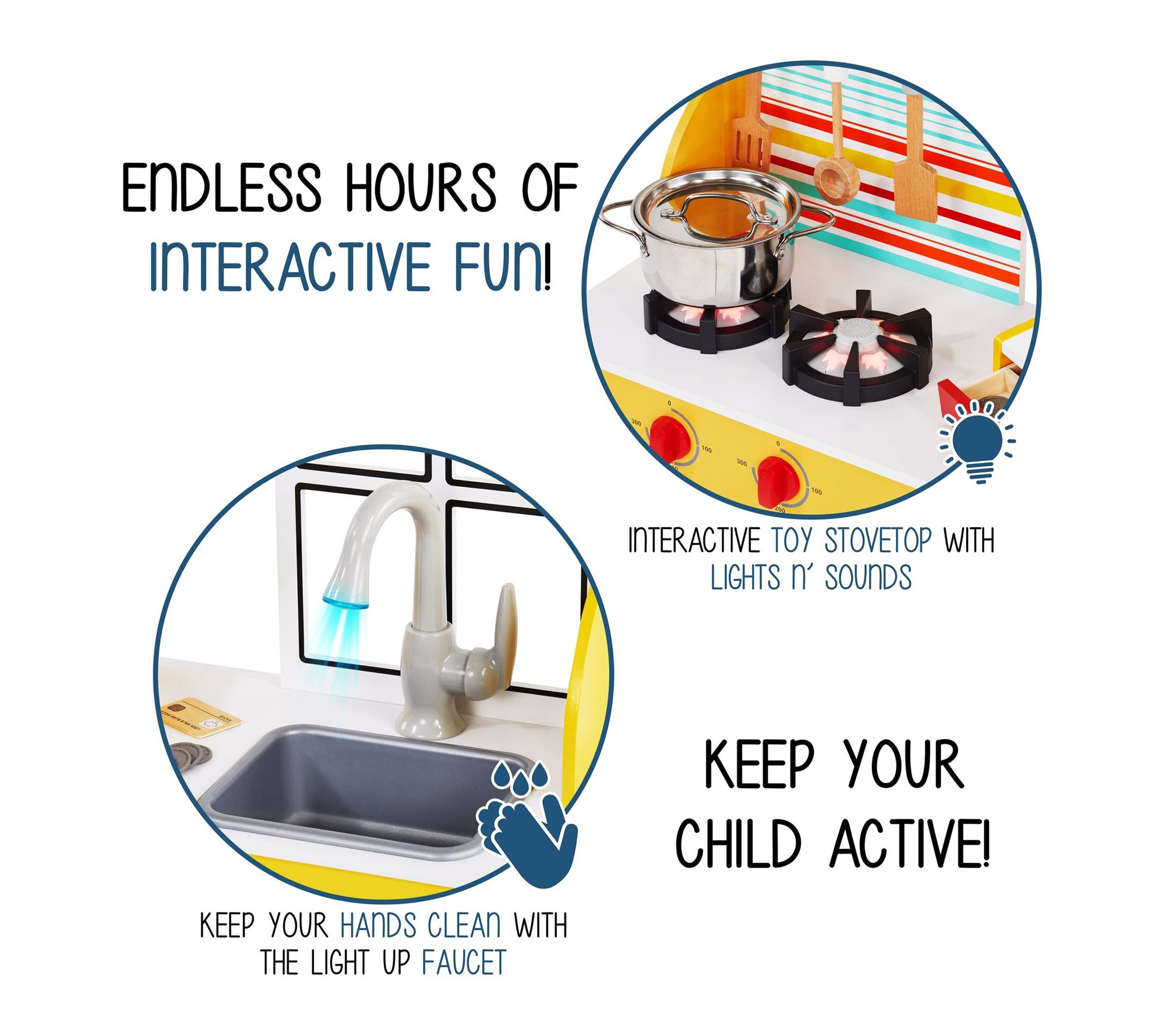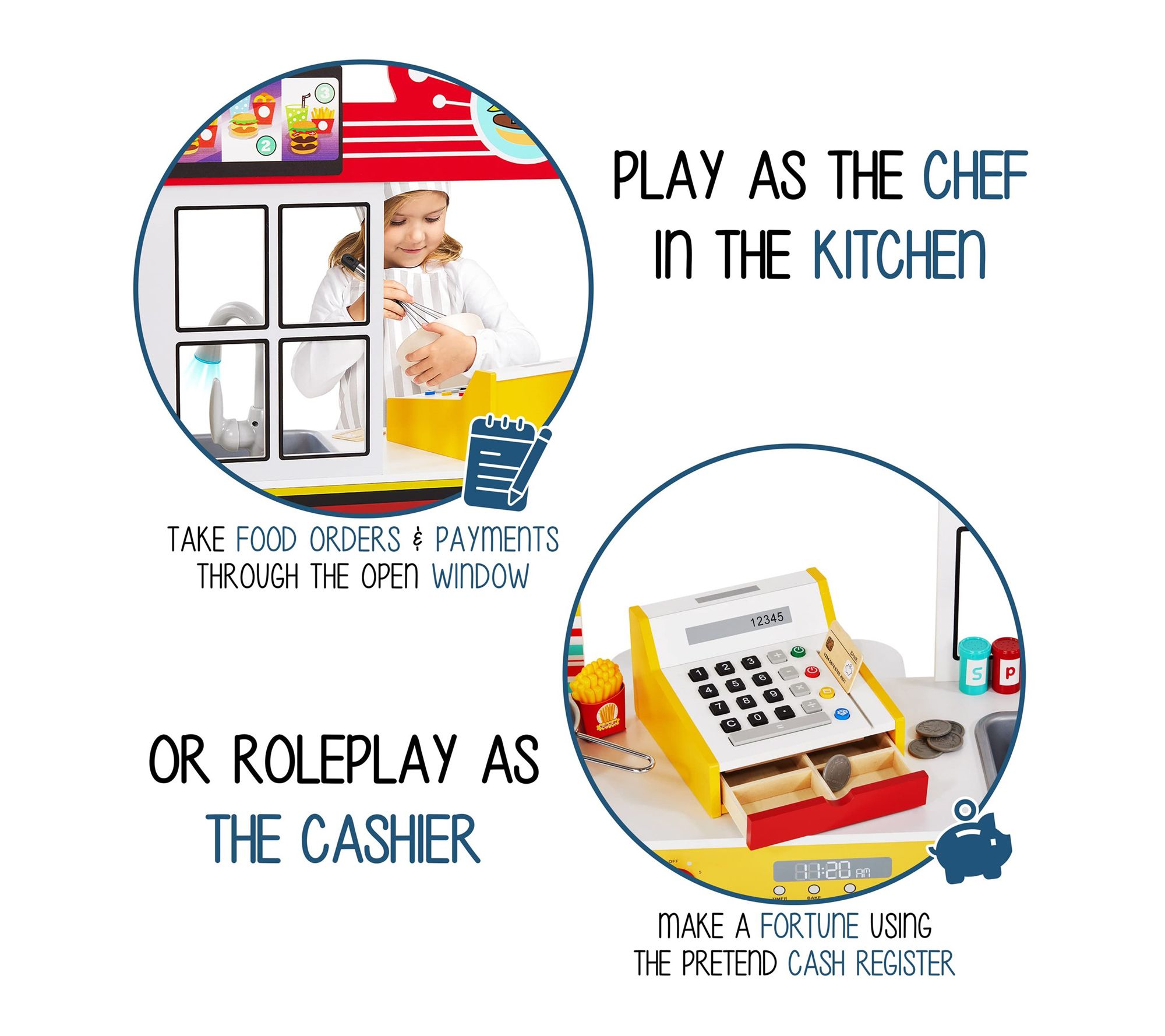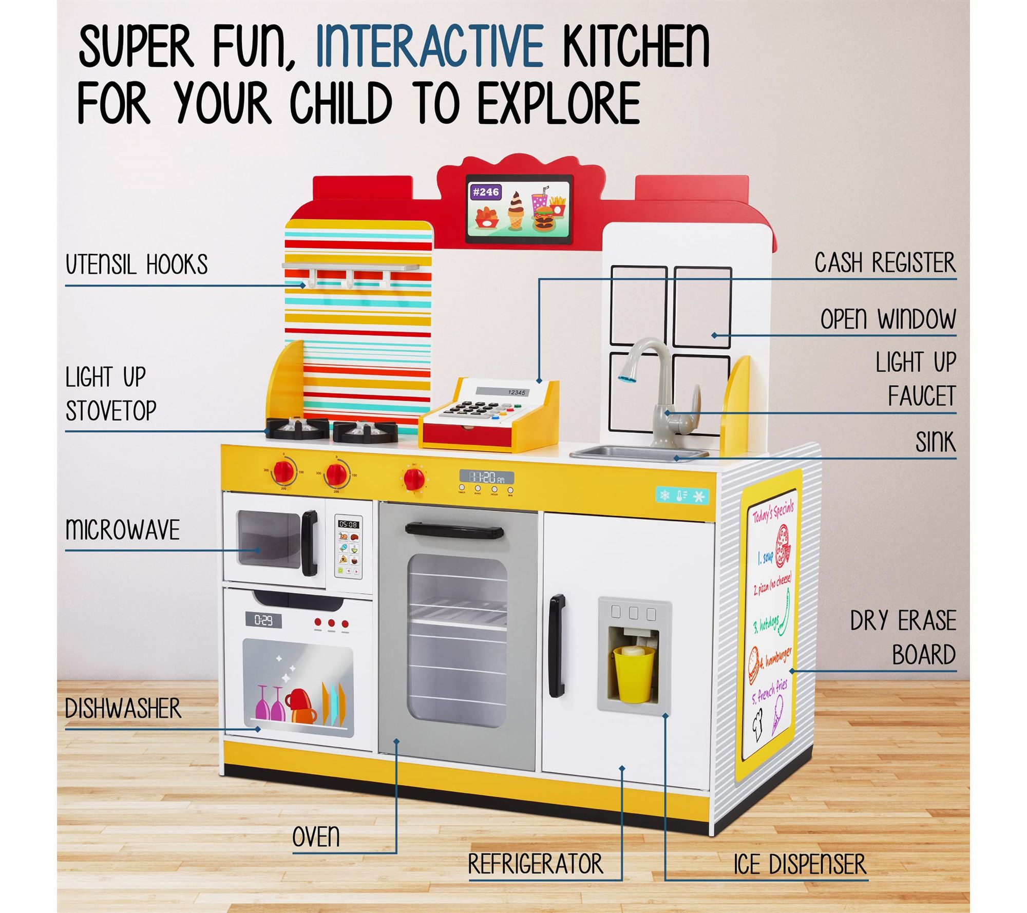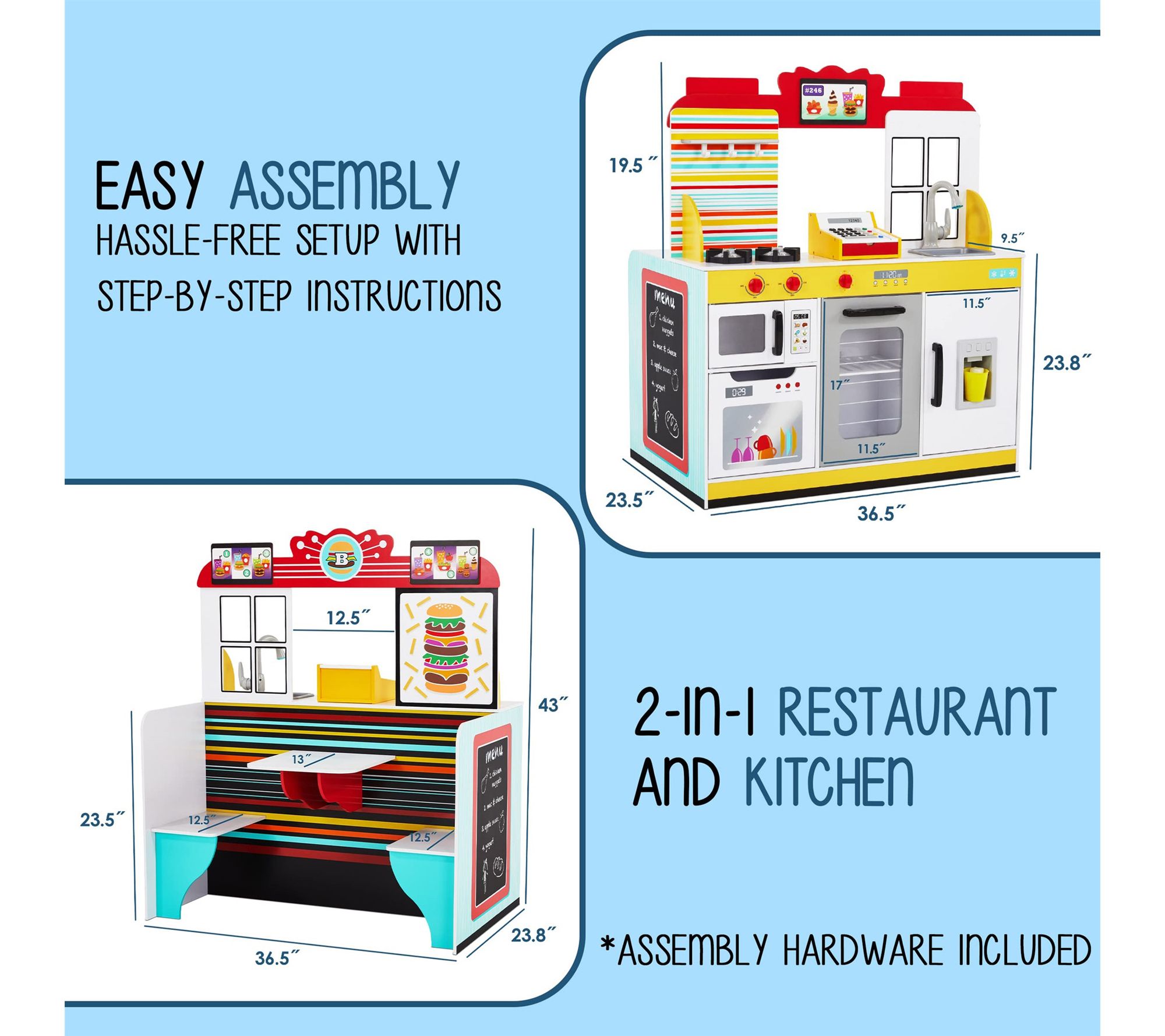 Step into a world of creative role play as little chefs and customers come together in this delightful double-sided restaurant play set. Whether taking orders at the cash register, jotting specials on the chalkboard, or cooking up pretend meals at the built-in kitchen, kids can host friends for hours of imaginative fun. From Lil' Jumbl.