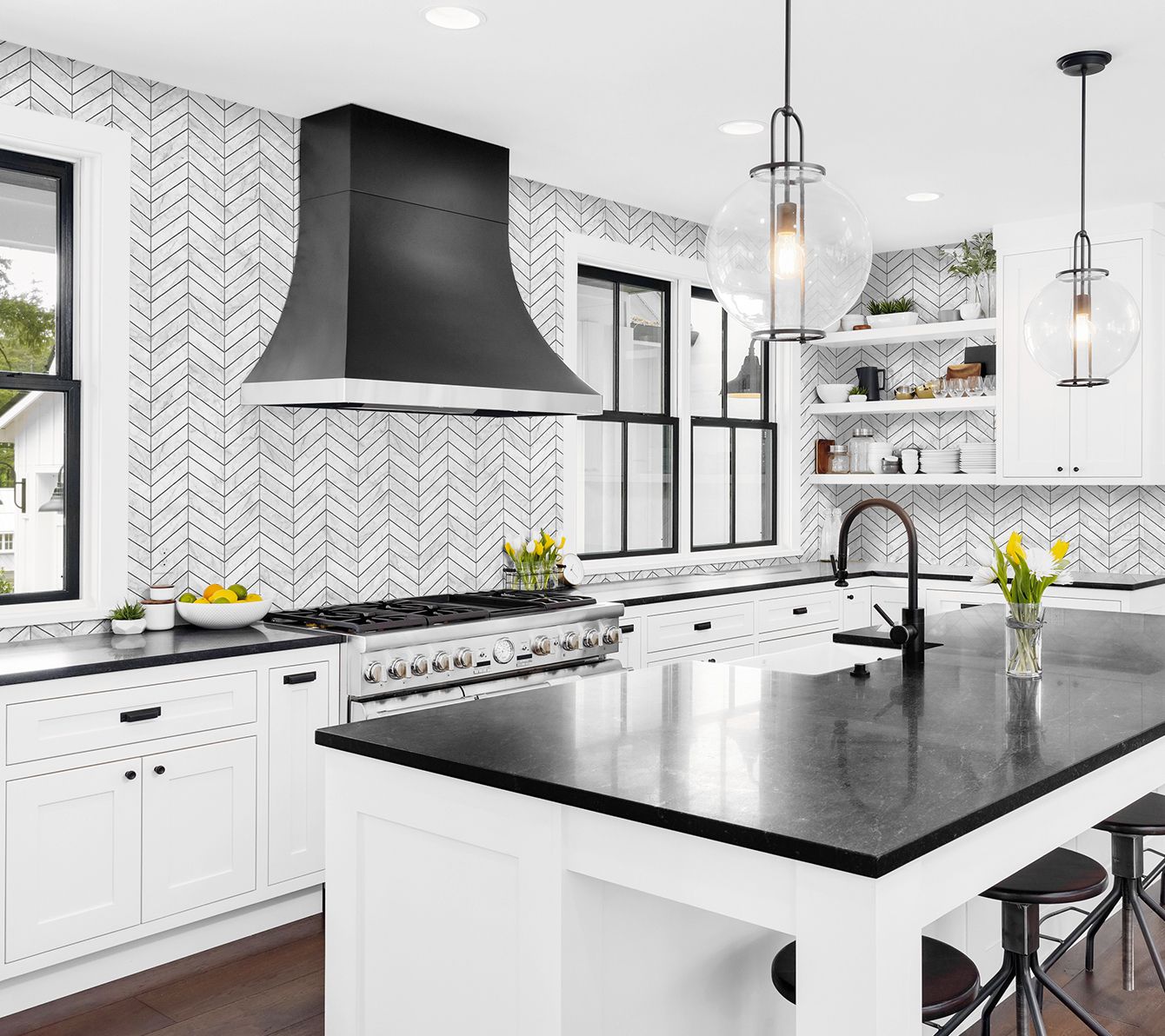 Add a chic and contemporary finish to any kitchen or bathroom setting with this faux Marbled Chevron peel and stick wallpaper, offering a high-end look that's easy to install and reposition. From Lillian August.