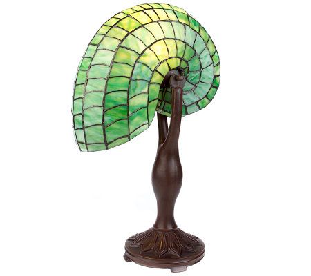 Add brilliant decoration to your home with this limited edition Tiffany-style Nautilus table lamp. Fashioned with 210 pieces of cut glass, it beams with colorful beauty in any setting. Handcrafted using the techniques developed by Louis Comfort Tiffany in the early 1900s. Metal base. On/off switch. Requires one 40W bulb, not included.