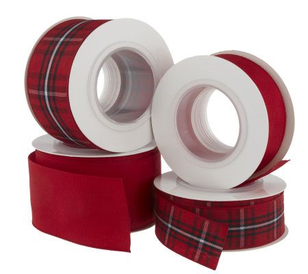 • Includes one 7/8" x 25' roll in red, one 7/8" x 25' roll in plaid, one 1-1/2" x 25' roll in red, and one 1-1/2" x 25' roll in plaid