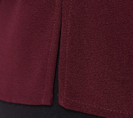 Shirt collar, button front closure, shirt cuffs, side slits, pleated scarf detail