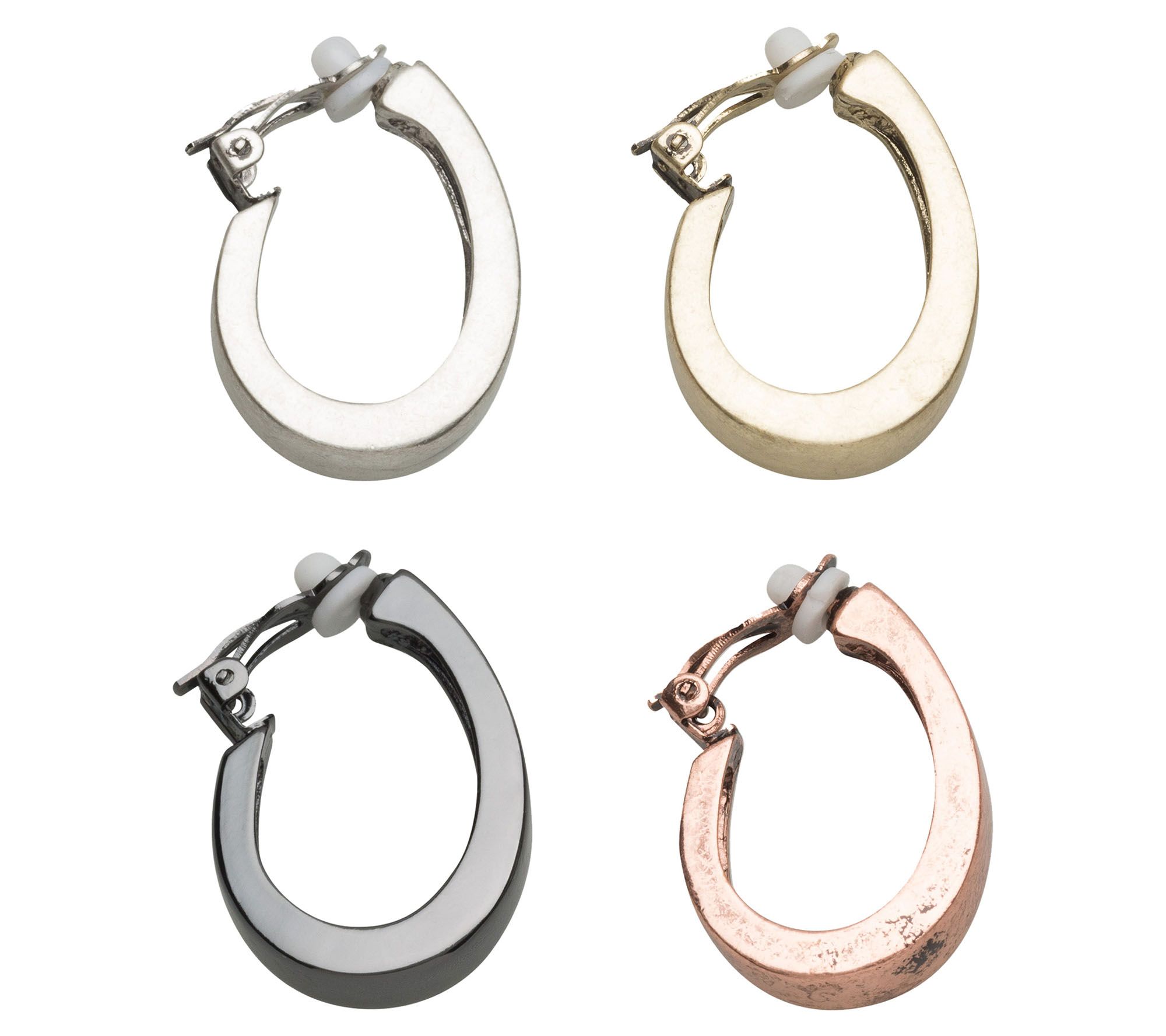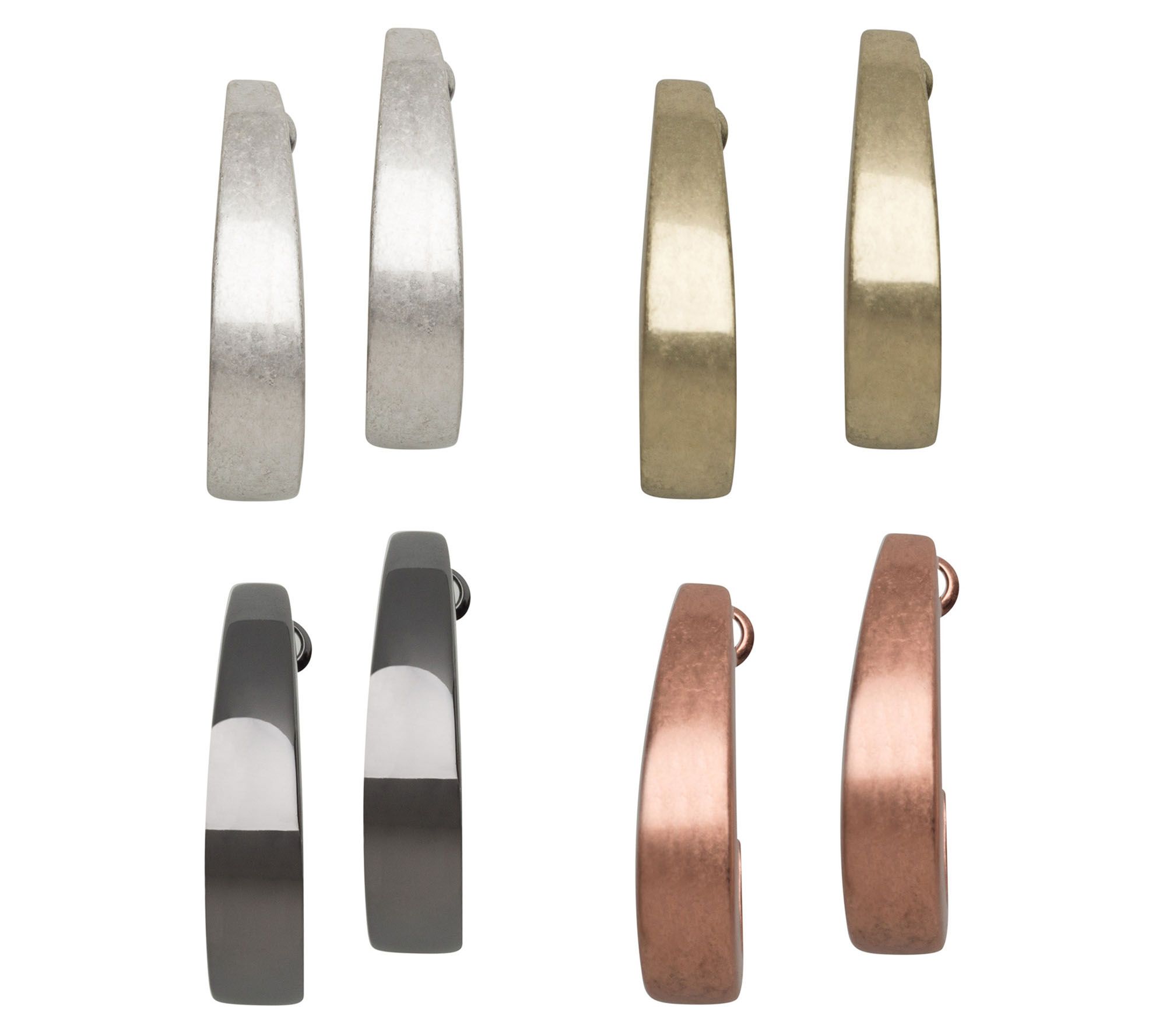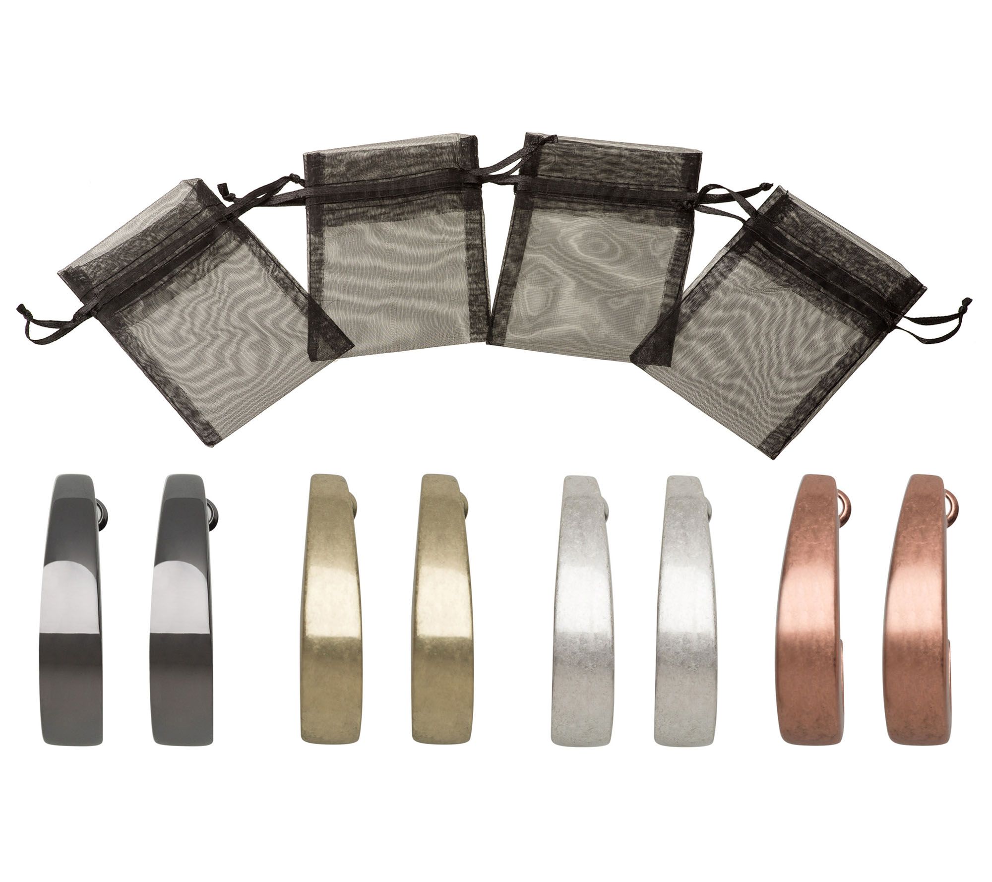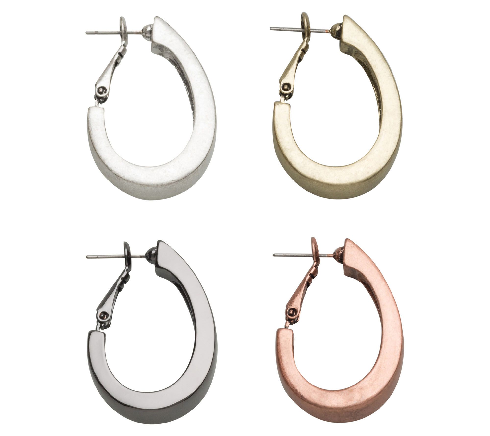 • Includes four pairs of hoop earrings: one each in hematite, coppertone ox, brasstone ox, and silvertone ox