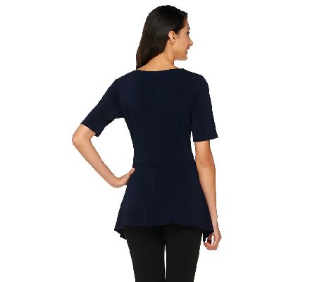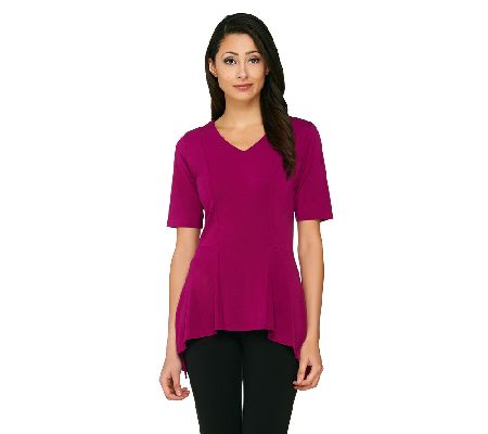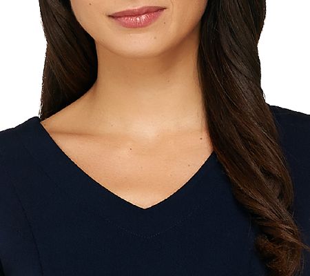 Sleek and smooth. This Linea knit top features moss crepe styling for a super soft feel. A V-neckline paired with short sleeves gives this casual top a flattering, flirty feel. From Linea by Louis Dell'Olio.