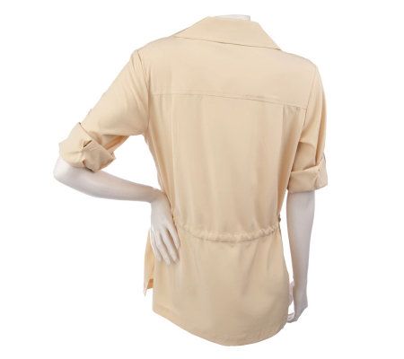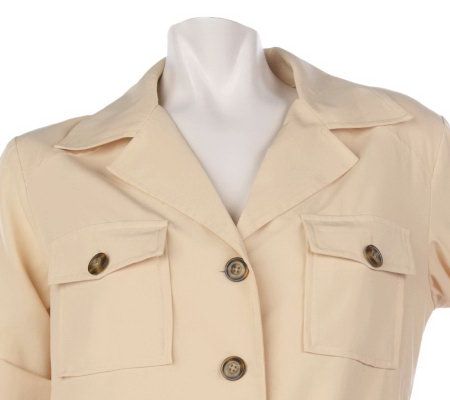 Capture elegance and seasonless beauty wearing this safari shirt jacket. The adjustable sleeves--which go from 3/4 length to elbow length via tab closure--make this piece versatile, while the built-in tie creates a modern, feminine silhouette. From Linea by Louis Dell'Olio.